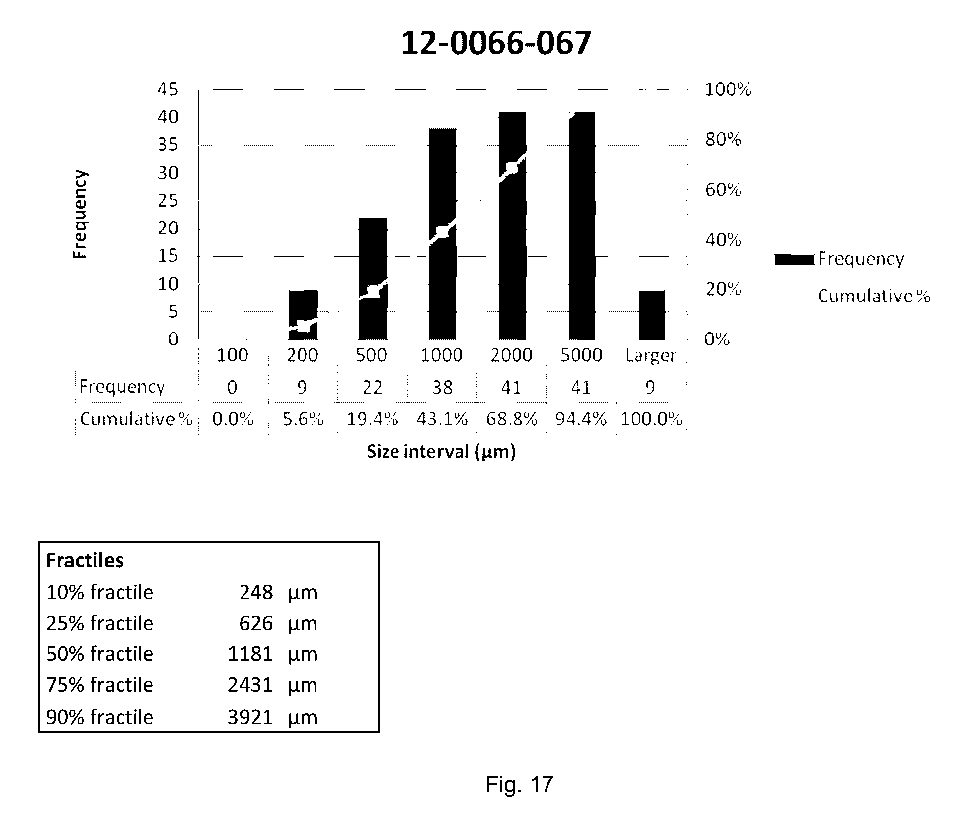 Particle size reduction of the composition was measured as described above. The average particle size was 1.94±2.57 mm and the five largest particles were 21.4 mm; 15.1 mm; 12.8 mm; 8.7 mm; and 7.8 mm. The results are shown in FIG. 17.