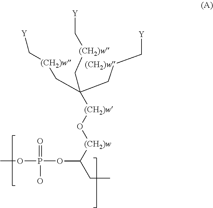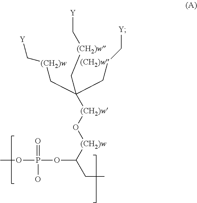 In another embodiment, w, w′ and w″ are each independently an integer between 0 and 3. In another embodiment, w, w′ and w″ are each independently 0 or 1. In another embodiment each of w, w′ and w″ is 1. In another embodiment, the alkyl, alkylether and/or alkyl phosphate chain has 2-8 carbon atoms.