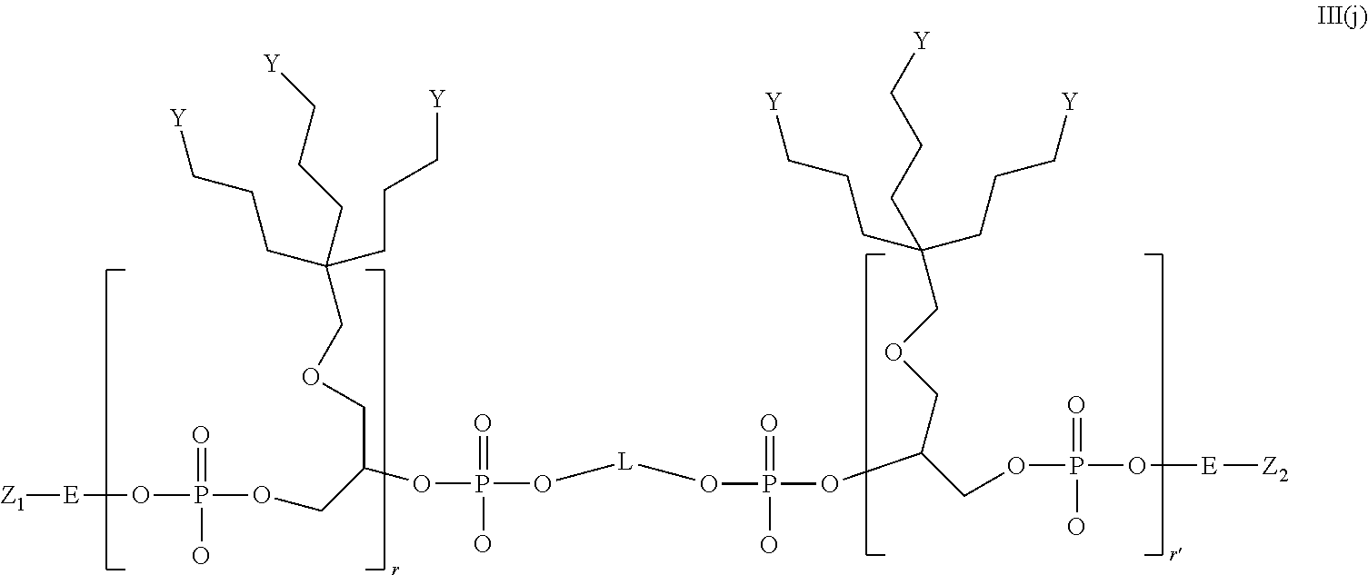 a first linker, which links between phosphate groups of two of said repeating units (“a splitting linker”), and reactive groups capable of binding a biologically active moiety,