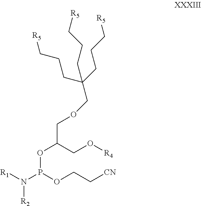 In one embodiment, the splitting precursor for the phosphate based oligomeric compounds and conjugates thereof according to this invention is represented by the structure of formula XXXVI: In one embodiment, the linker precursor for the phosphate based oligomeric compounds and conjugates thereof according to this invention is represented by the structure of formula XXXVII: R1and R2are each independently selected from a C1-C6linear or branched alkyl, C3-C7cycloalkyl, or R1and R2are joined together to form a 4-7 membered heterocyclic ring, including but not limited to piperidine, morpholine and the like; R3is a C1-C6linear or branched alkyl, CH3, CH2CH2CN, CH2CH2SO2Ar or CH2CH2SO2CH3; R4is an alcohol protecting group, including but not limited to: trityl (triphenylmethyl, Tr), Methoxytrityl [(4-methoxyphenyl)diphenylmethyl, MMT) or Dimethoxytrityl [bis-(4-methoxyphenyl)phenenylmethyl] (DMT), Acetyl (Ac), Benzoyl (Bz), Benzyl (Bn, Bnl), β-Methoxyethoxymethyl ether (MEM), Methoxymethyl ether (MOM), p-Methoxybenzyl ether (PMB), Methylthiomethyl ether, Pivaloyl (Piv), Tetrahydropyranyl (THP), Tetrahydrofuran (THF), Silyl ether, methyl ether or ethoxyethyl ether; and n is an integer between 1 and 10. In one embodiment, R1of compound of formula XX, XXX-XXXIII, XXXV and XXXVII is isopropyl. In another embodiment R1is ethyl. In another embodiment R1is isopentyl [CH(CH2CH3)2]. In another embodiment R1is methylisopentyl [CH(CH2CH2CH3)2]. In another embodiment R1is cyclohexyl. In another embodiment R1is cyclopentyl. In another embodiment R1is methyl. In another embodiment R1is tert-butyl. In another embodiment R1is propyl. In another embodiment R1is butyl. In another embodiment R1is neopentyl. In another embodiment R1is cyclopropyl. In one embodiment, R2of compound of formula XX, XXX-XXXIII, XXXV and XXXVII is isopropyl. In another embodiment R2is ethyl. In another embodiment R2is isopentyl [CH(CH2CH3)2]. In another embodiment R2is methylisopentyl [CH(CH2CH2CH3)2]. In another embodiment R2is cyclohexyl. In another embodiment R2is cyclopentyl. In another embodiment R2is methyl. In another embodiment R2is tert-butyl. In another embodiment R2is propyl. In another embodiment R2is butyl. In another embodiment R2is neopentyl. In another embodiment R2is cyclopropyl. In one embodiment, R1and R2of compound of formula XX, XXX-XXXIII, XXXV and XXXVII are different. In another embodiment, R1and R2are the same. In one embodiment, R1and R2of compound of formula XX, XXX-XXXIII, XXXV and XXXVII are both isopropyls. In another embodiment, R1and R2are both ethyls. In another embodiment, R1and R2are both isopentyls [CH(CH2CH3)2]. In another embodiment, R1and R2are both methylisopentyls [CH(CH2CH2CH3)2]. In another embodiment, R1and R2are both methyls. In another embodiment, R1and R2are both tBu. In another embodiment, R1and R2are both cyclohexyls. In another embodiment, R1and R2are both cyclopropyls. In another embodiment, R1and R2are both cyclopentyls. In one embodiment, R1and R2of compound of formula XX, XXX-XXXIII, XXXV and XXXVII are joined to form together with the N atom a 4-7 membered heterocyclic ring. In another embodiment, R1and R2are joined to form together with the N atom a 6 membered heterocyclic ring. In another embodiment, R1and R2are joined to form together with the N atom a morpholine ring. In another embodiment, R1and R2are joined to form together with the N atom a piperidine ring. In another embodiment, R1and R2are joined to form together with the N atom a pyrrolidine ring. In one embodiment, R3of compound of formula XX, XXX-XXXII, XXXIV-XXXV and XXXVII is a C1-C6linear or branched alkyl. In another embodiment, R3is a methyl. In another embodiment, R3is an ethyl. In another embodiment, R3is an isopropyl. In another embodiment, R3is CH2CH2CN. In another embodiment, R3is CH2CH2SO2CH3. In one embodiment, R4of compounds of formula XXA, XXB, XXC, XXX-XXXI, XXXIII-XXXV and XXXVII is an alcohol protecting group. In another embodiment, R4is trityl (triphenylmethyl, Tr). In another embodiment, R4is Methoxytrityl [(4-methoxyphenyl)diphenylmethyl, MMT). In another embodiment, R4is Dimethoxytrityl [bis-(4-methoxyphenyl)phenylmethyl] (DMT). In another embodiment, R4is Acetyl (Ac). In another embodiment, R4is Benzoyl (Bz). In another embodiment, R4is Benzyl (Bn, Bnl). In another embodiment, R4is β-Methoxyethoxymethyl ether (MEM). In another embodiment, R4is Methoxymethyl ether (MOM). In another embodiment, R4is p-Methoxybenzyl ether (PMB). In another embodiment, R4is Methylthiomethyl ether. In another embodiment, R4is Pivaloyl (Piv). In another embodiment, R4is Tetrahydropyranyl (THP). In another embodiment, R4is Tetrahydrofuran (THF). In another embodiment, R4is a Silyl ether including, but not limited to trimethylsilyl (TMS), tert-butyldimethylsilyl (TBDMS), tri-iso-propylsilyloxymethyl (TOM), and triisopropylsilyl (TIPS) ethers. In another embodiment, R4is Methyl Ethers, In another embodiment, R4is Ethoxyethyl ether (EE). In one embodiment, R4′ of compound of formula XXB and/or XXXV is an alcohol protecting group. In another embodiment, R4′ is trityl (triphenylmethyl, Tr). In another embodiment, R4′ is Methoxytrityl [(4-methoxyphenyl)diphenylmethyl, MMT). In another embodiment, R4′ is Dimethoxytrityl [bis-(4-methoxyphenyl)phenylmethyl] (DMT). In another embodiment, R4′ is Acetyl (Ac). In another embodiment, R4′ is Benzoyl (Bz). In another embodiment, R4′ is Benzyl (Bn, Bnl). In another embodiment, R4′ is β-Methoxyethoxymethyl ether (MEM). In another embodiment, R4′ is Methoxymethyl ether (MOM). In another embodiment, R4′ is p-Methoxybenzyl ether (PMB). In another embodiment, R4′ is Methylthiomethyl ether. In another embodiment, R4′ is Pivaloyl (Piv). In another embodiment, R4′ is Tetrahydropyranyl (THP). In another embodiment, R4′ is Tetrahydrofuran (THF). In another embodiment, R4′ is a Silyl ether including, but not limited to trimethylsilyl (TMS), ter-butyldimethylsilyl (TBDM