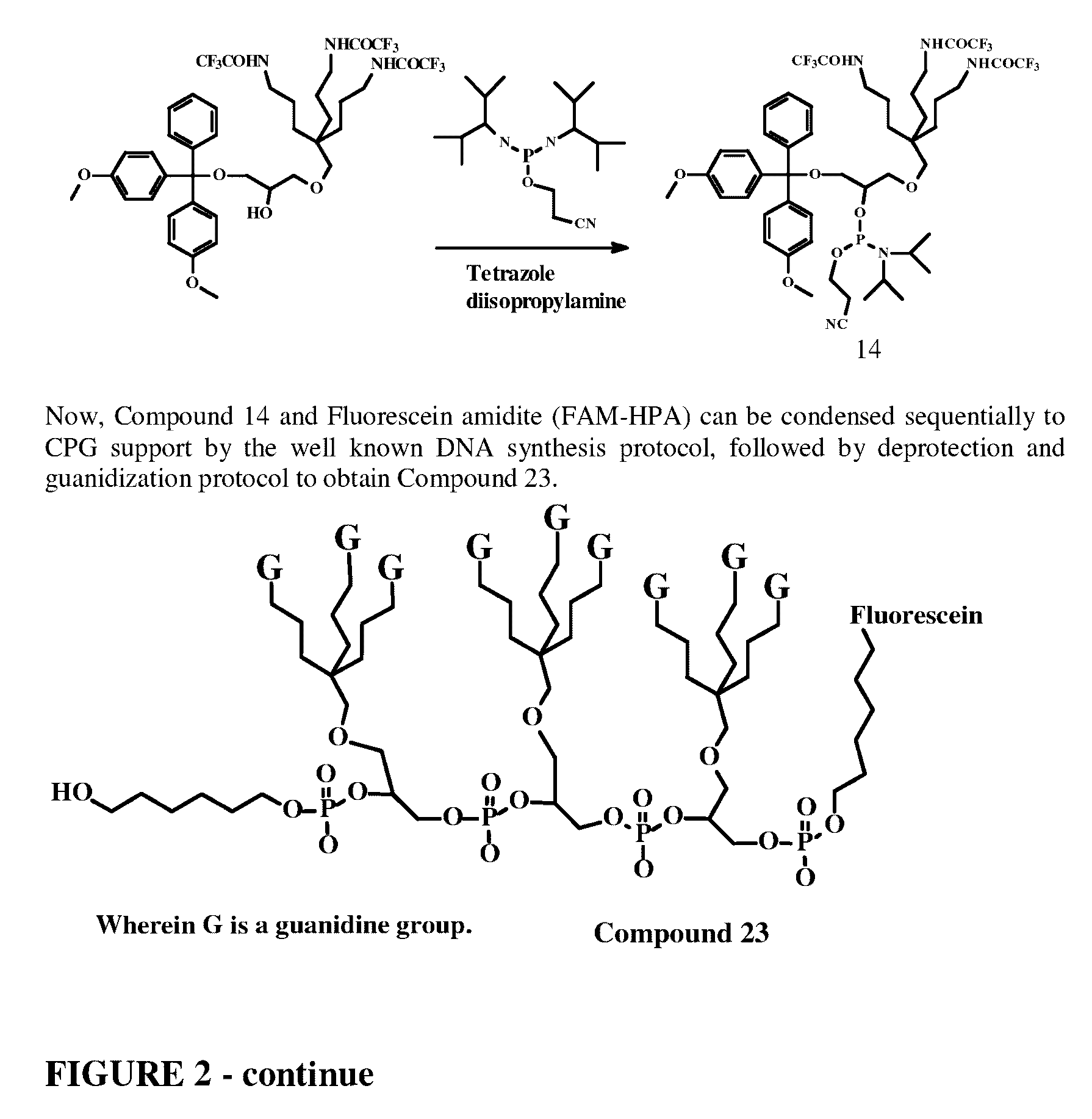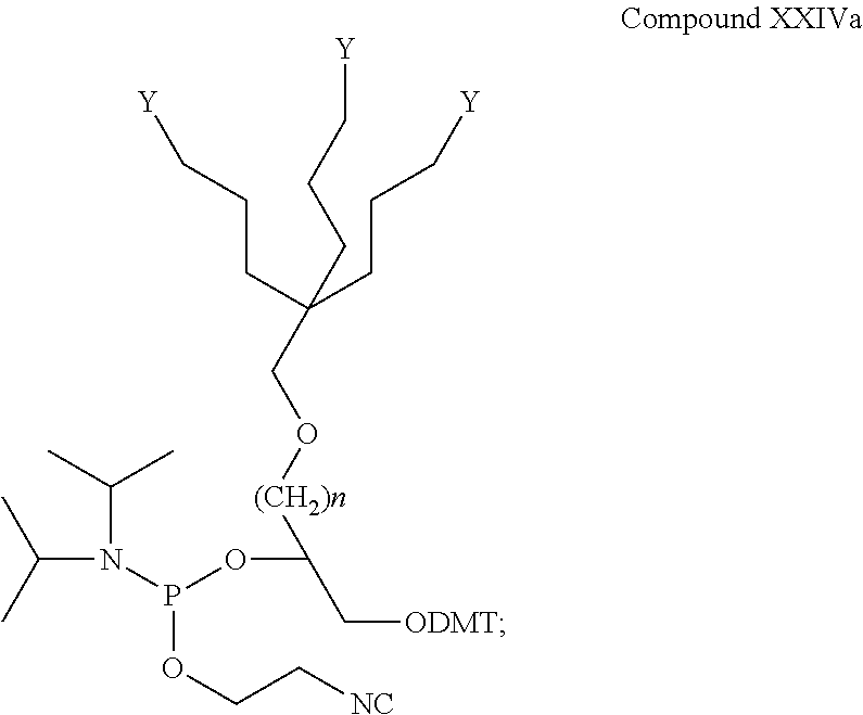 wherein Q is —NHC(O)CF3and DMT refers to dimethoxytrityl; and n is an integer between 1 and 5. By incorporating one or more delivering groups (denotes herein as Q1-Qn, Q moiety will be converted to Y by several chemical steps as it is described in the Examples.) In another embodiment Q is: