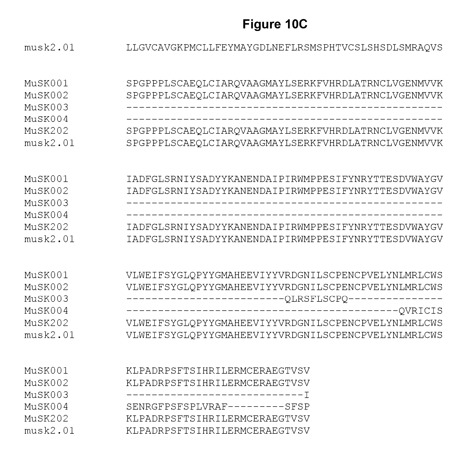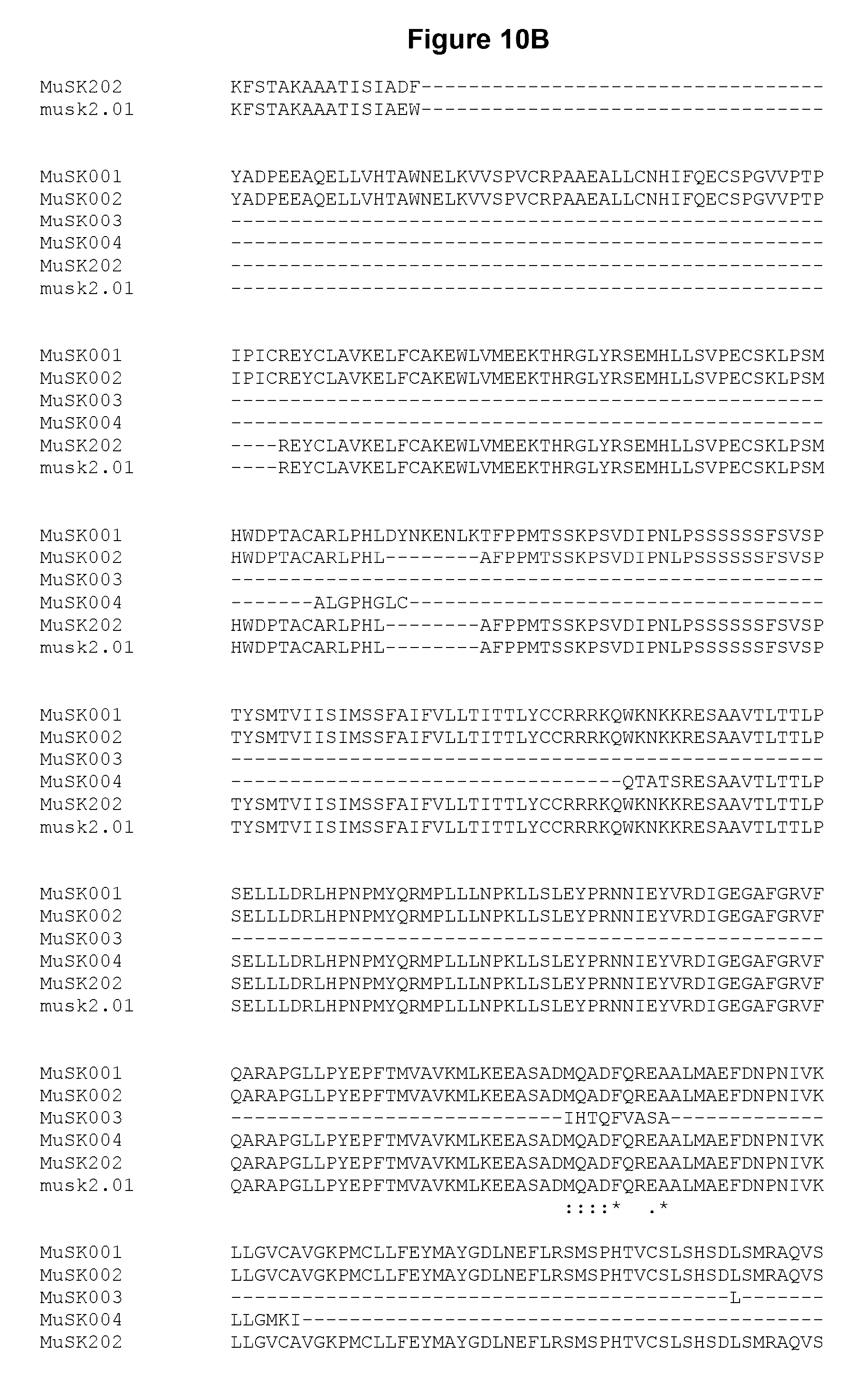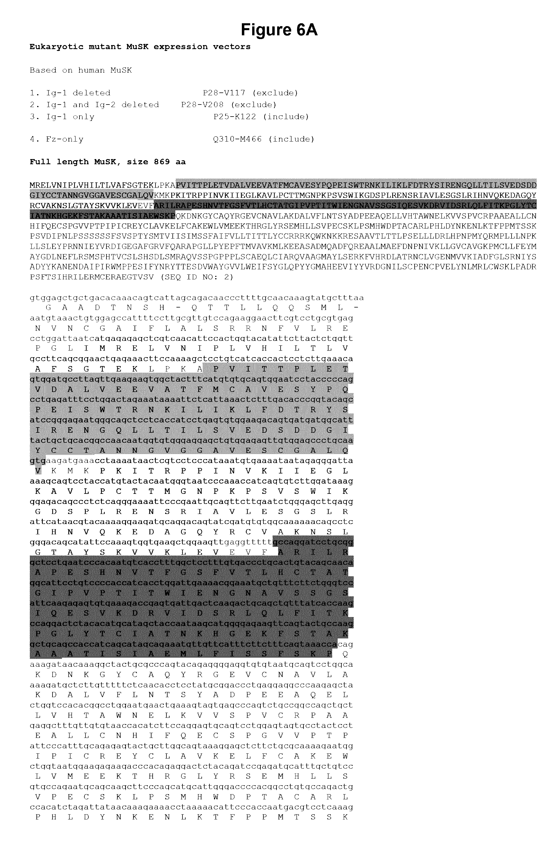 This application claims priority under 35 USC §119(e) from U.S. Provisional Application Ser. No. 61/877,557, filed Sep. 13, 2013, which application is herein specifically incorporated by reference in its entirety. The research leading to the present invention was funded in part by Grant No. RO1 NS36193 awarded by the National Institutes of Health. The United States government has certain rights in the invention. Compositions and methods described herein relate to muscle specific kinase (MuSK) and modulation thereof. Agents described herein are envisioned for use as therapeutics to alleviate or delay motor dysfunction in subjects afflicted with a disorder associated with nerve terminal loss or fragmentation. In a particular aspect, the disorder is myasthenia gravis with antibodies to MuSK. Myasthenia gravis (MG) is an autoimmune disease, caused by auto-antibodies to proteins in the postsynaptic membrane at neuromuscular synapses. Most MG patients carry antibodies to acetylcholine receptors (AChRs), the neurotransmitter receptor at vertebrate neuromuscular synapses (1,2,3). Auto-antibodies to AChRs are largely of the IgG1 and IgG3 subclass (4), which cause muscle weakness by three mechanisms: complement-mediated membrane lysis (5); crosslinking and depletion of cell surface AChRs (6); and to a lesser extent, functional blocking of the ACh-binding site (7). The ability of antibodies to AChRs to recruit complement, dimerize and modulate AChR expression is an important component of their pathogenic mechanism, since animals with experimental autoimmune MG (EAMG) can be rescued from disease with monovalent Fab fragments generated from AChR IgG antibodies and complement-deficient mice are protected against EAMG (8,6,9). Approximately 20% of patients with MG lack antibodies to AChRs, and approximately 40% of these AChR-negative patients carry auto-antibodies to Muscle specific kinase (MuSK), a receptor tyrosine kinase that is essential for all aspects of synaptic differentiation and maintenance (10,11,12). The synaptic defects in MuSK MG overlap with those in AChR MG, including a reduction in the number of functional AChRs at synapses and unreliable synaptic transmission, resulting in muscle fatigue and weakness. In contrast to AChR MG, MuSK MG is caused in large part by IgG4 antibodies (13,14,15) that fail to engage complement and are considered functionally monovalent (13,14,15,16). Consequently, the accumulation of complement and muscle membrane damage, hallmark pathological features of AChR MG, appear insignificant in MuSK MG (13,17). Despite the paucity or absence of complement and cell damage in MuSK MG, the structural and functional deficits of synapses are extensive in MuSK MG, which highlights the key role that MuSK plays in organizing all aspects of synaptic differentiation (10,18). AChR clustering and synapse formation are orchestrated by neuronally released Agrin, which binds to Lrp4, a member of the low density lipoprotein-related protein family, causing Lrp4 to bind and activate MuSK (19,20,21). Once tyrosine-phosphorylated, MuSK recruits Dok-7, an adaptor protein that becomes phosphorylated and recruits additional signaling molecules essential for synapse formation (22,23,24). The extracellular region of MuSK contains three Ig-like domains and a Frizzled-like domain (10). The first Ig-like domain in MuSK is required for MuSK to bind Lrp4. Mutation of a single residue, I96, on a solvent exposed surface of the first Ig-like domain, prevents MuSK from binding Lrp4 and responding to Agrin (25,21). A hydrophobic surface on the opposite side of the first Ig-like domain mediates MuSK homodimerization, essential for MuSK trans-phosphorylation (25). Although MuSK is expressed by muscle and not by motor neurons, MuSK is essential for presynaptic as well as postsynaptic differentiation (10). In mice lacking MuSK, motor axons fail to stop and differentiate and instead wander aimlessly throughout the muscle (11). MuSK regulates presynaptic differentiation by clustering Lrp4 in muscle, which functions bi-directionally by serving not only as a receptor for Agrin and a ligand for MuSK, but also as a direct retrograde signal for presynaptic differentiation (26). In addition to its role during synapse formation, MuSK is also required to maintain adult synapses, as inhibition of MuSK expression in adult muscle leads to profound defects in presynaptic and postsynaptic differentiation (27,28). In view of the above, a better understanding of MuSK activity and its role in the neuromuscular synapse in healthy and pathological states is an objective that serves a profound need. The need is underscored by the fact that MuSK MG is a debilitating autoimmune disease and one third of MuSK MG patients experience a life-threatening respiratory crisis. Long-term immunosuppression is the only current treatment option and the side effects of such an approach are considerable. The citation of references herein shall not be construed as an admission that such is prior art to the present invention. Myasthenia gravis (MG) is a severely debilitating autoimmune disease that is due to a decrease in the efficiency of synaptic transmission at neuromuscular synapses. MG is caused by antibodies against postsynaptic proteins, including (1) acetylcholine receptors (AChRs), the neurotransmitter receptor, (2) muscle specific kinase (MuSK), a receptor tyrosine kinase essential for the formation and maintenance of neuromuscular synapses, and (3) lipoprotein-related protein 4 (Lrp4), which responds to neural Agrin by binding and stimulating MuSK. Passive transfer studies in mice have shown that IgG4 antibodies from MuSK MG patients cause disease without requiring complement or other immune components, suggesting that these MuSK antibodies cause disease by directly interfering with MuSK function. The present inventors have discovered that pathogenic IgG4 antibodies to MuSK bind to a structural epitope in the first Ig-like domain of M