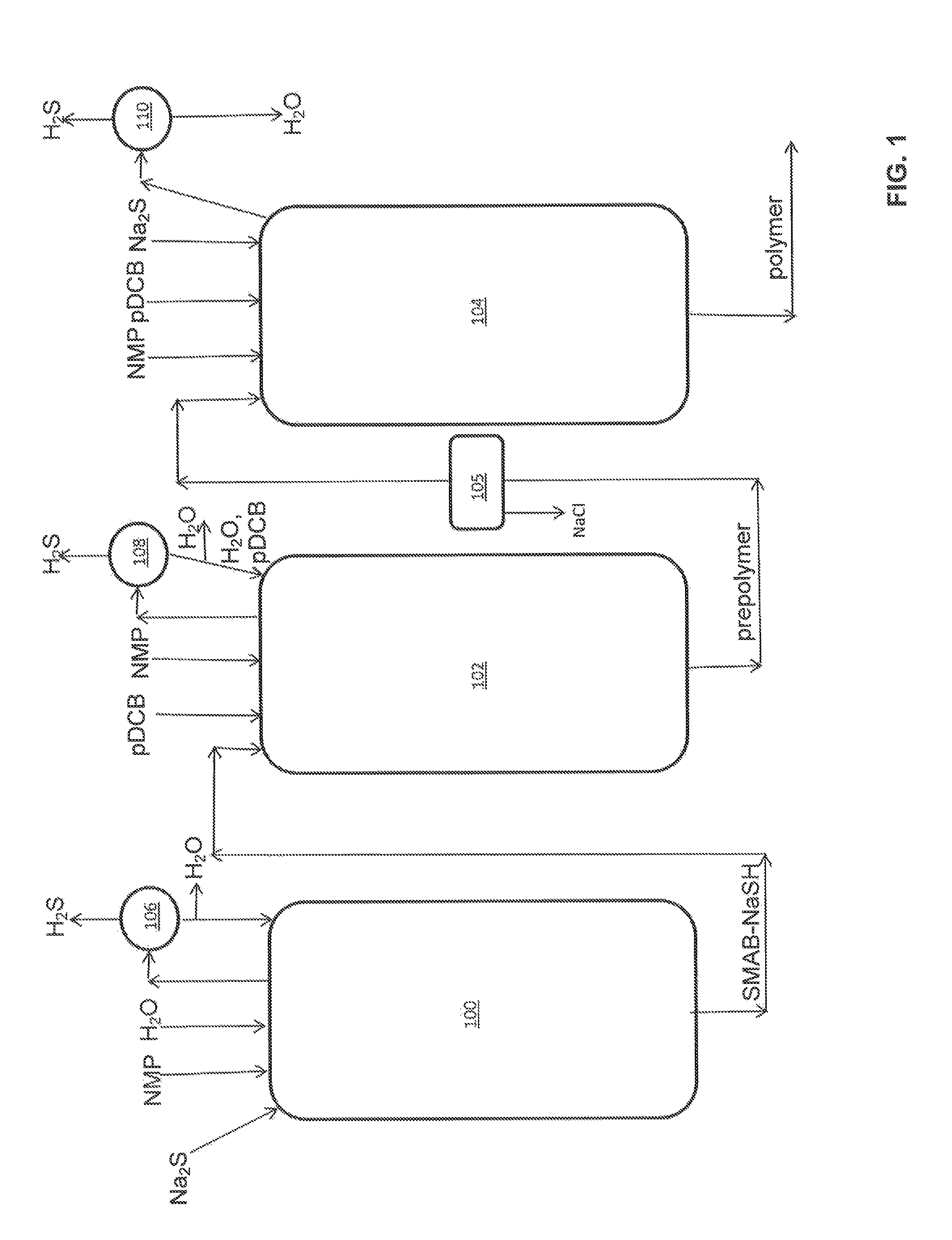 Sample No. 1 2 3 4 5 6(1) 7 8 Melt 4 10 39 22 <3 n.d. 8 16 viscosity (Pa-s) Tc2(° C.) 235 230 206 216 243 — 244(2) 240(2) Organically 0.26 0.41 0.23 0.37 0.24 n.d. 0.40 0.48 bound chlorine (wt %) pressure 400 350 50 350 400 325 350 350 throughout stage 2 (kPa) (1)The polymer was not isolated due to a bad crystallization result. (2)The polymer was crystallized after acetic acid neutralization. Heating from 160° C. to 230° C.: 45 min. SMAB-NaSH complex formation Period: 20 min. Monomer addition at 235° C.: 120 min Stage two polymerization: 100 min. Venting and Hot Filtration: 45 min. Three NMP washes: 45 min. Transfer to third reactor, sulfide charging, heating to 245° C. 40 min. Stage three reaction time: 90 min. Crystallization and cooling to <180° C. 70 min. Total: 535 min. Example 2