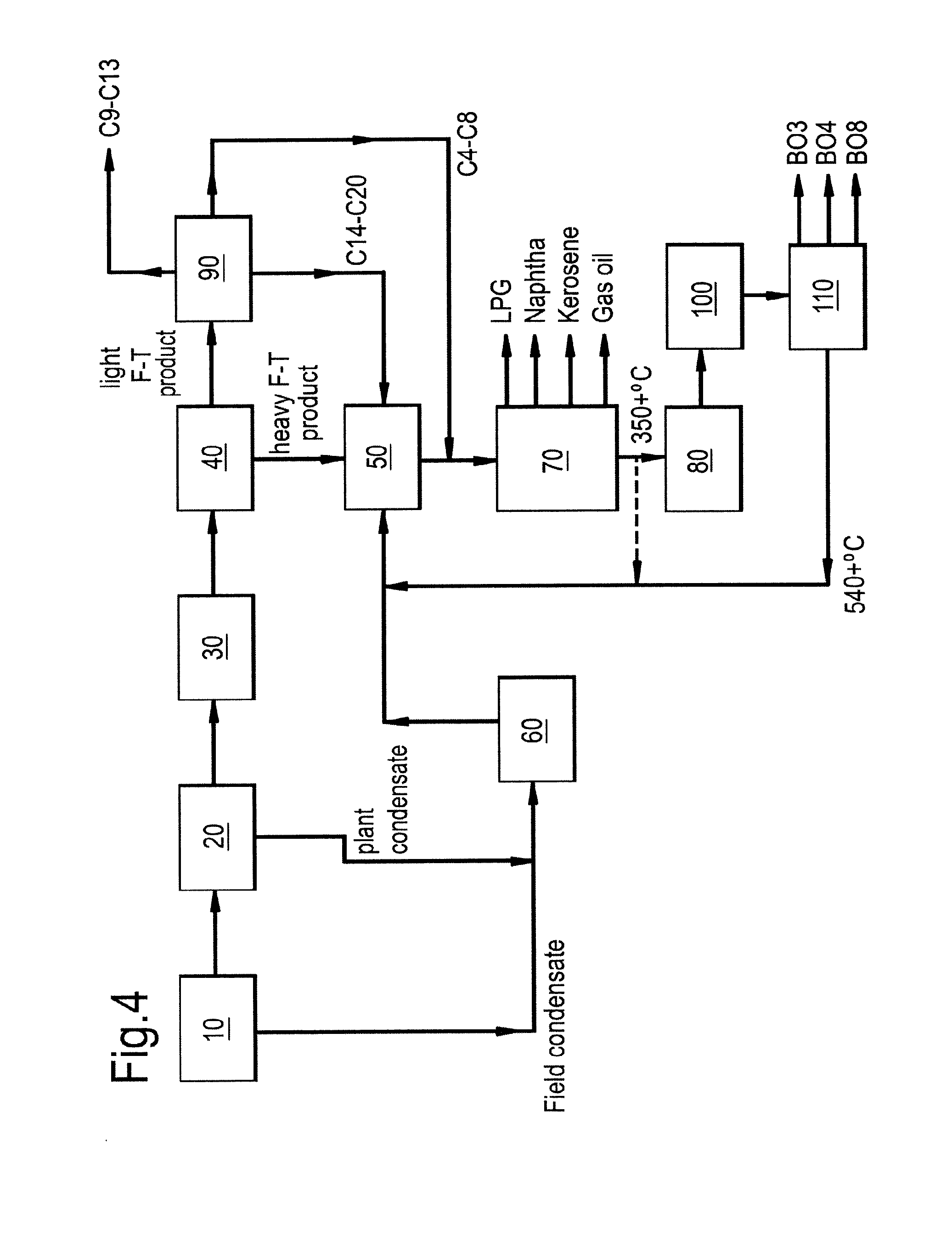 Fractions 3, 4 and 7 are combined and are used as feedstock to a hydrocracking/hydroisomerisation unit. The effluent of the hydrocracking/hydroisomerisation unit are separated in a first distillation unit yielding LPG, naphtha, kerosene, gas oil and a stream boiling above 350° C. The stream boiling above 350° C. is fed to a first vacuum distillation unit yielding a vacuum gas oil stream, a waxy stream with boiling range 390-540° C. and a residual stream boiling above 540° C. The vacuum gas oil is combined with the gas oil from the first distillation unit. The residual stream is recycled to the hydrocracking/hydroisomerisation unit. The waxy stream with boiling range 390-540° C. is subjected to a catalytic dewaxing step the effluent of which is subjected to a second vacuum distillation unit yielding distillates which are combined with the distillates of the first distillation column and base oils with kinematic viscosity at 100° C. of 3, 4 and 8 cSt respectively. The total yield of final products is given in Table 2. The results in Table 2 show that a high yield of middle distillates products including, kerosene and gas oil was obtained through a Fischer-Tropsch process in which processing of condensate occurs simultaneously with the Fischer-Tropsch reaction (see Table 2, Example 2 and 3). Utilization of condensate to produce middle distillates including, kerosene and gas oil results in a higher yield (see Table 2, Example 2 and 3) than the yield of, kerosene and gas oil obtained without the utilisation of condensate (see Comparative Example 4).PRIORITY CLAIM