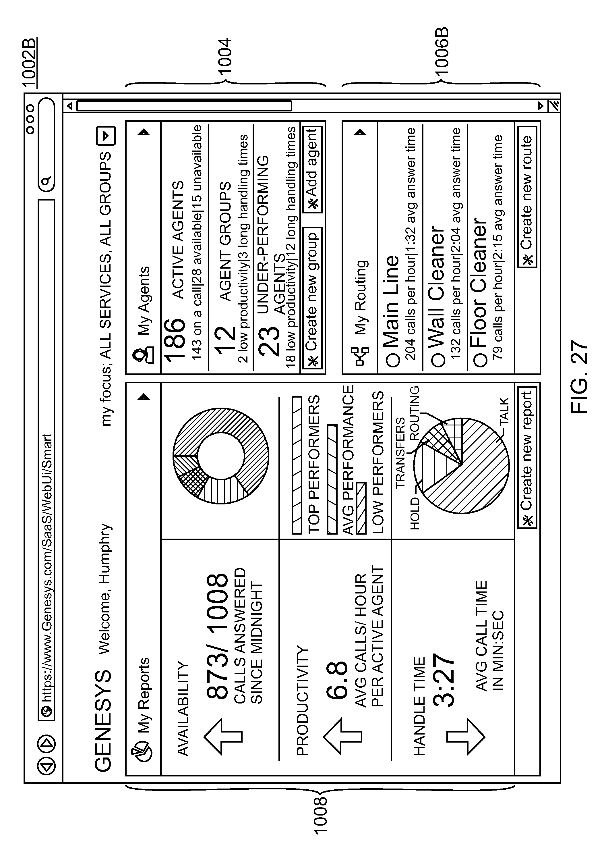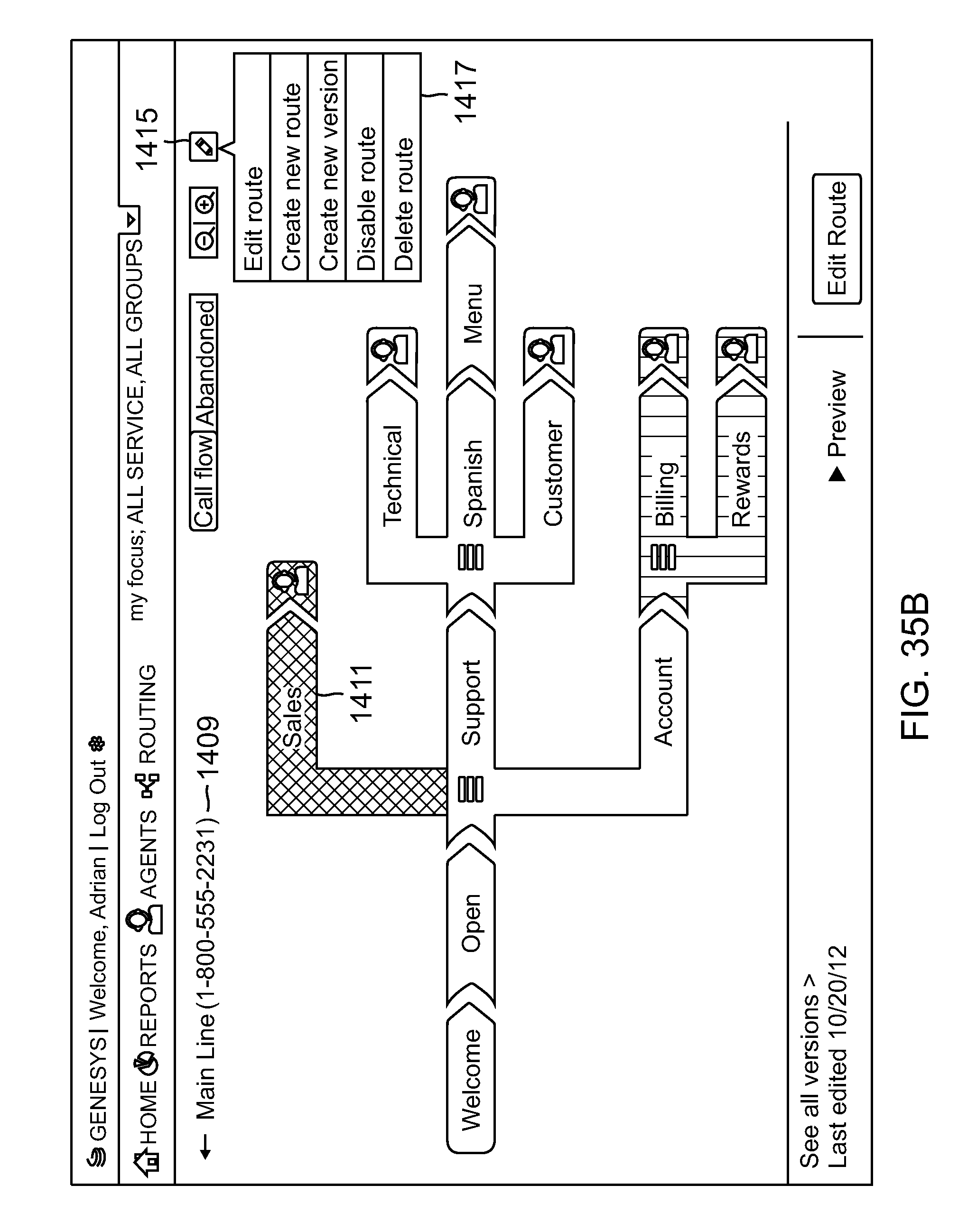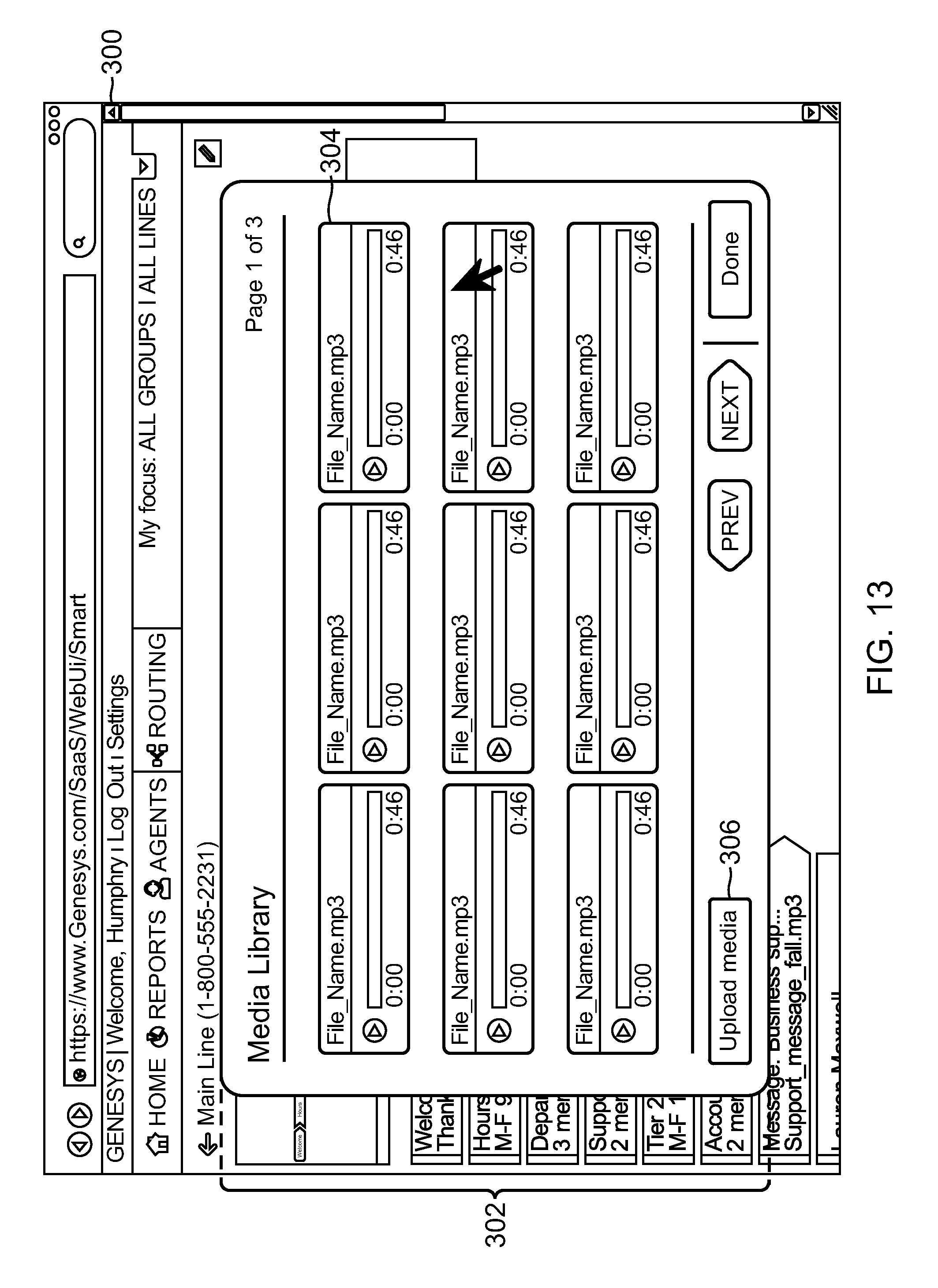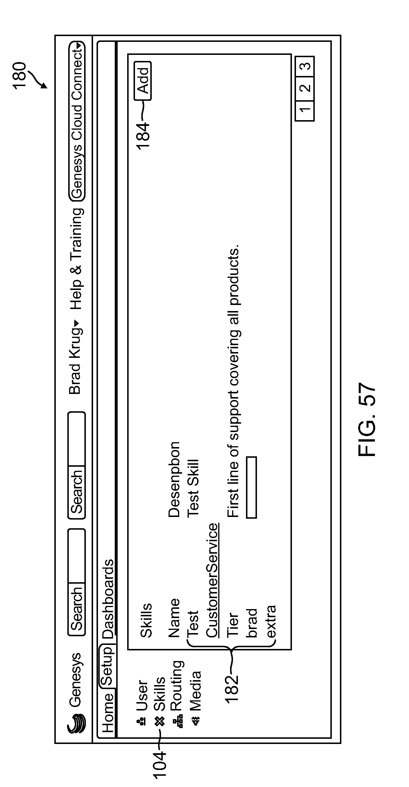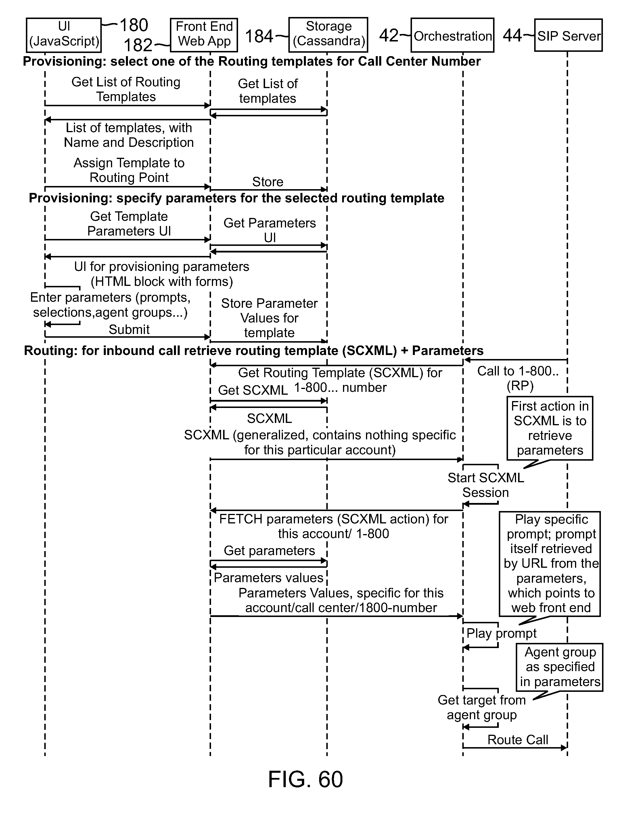 The set of parameters that are displayed may depend from the functionality that the template provides. In the illustrated example, the parameters include a play greeting parameter 168 and a route call parameter 170. In response to the displayed parameters, the contact center administrator selects a pre-recorded greeting message to be played when an interaction is initially answered, and music to be played while the interaction is waiting to be routed to an available agent. The parameters in the UI page 165 of The values of the parameters that are stored based on inputs provided in response to the parameters displayed in As described above, the UT page 165 displays the parameters that relate to the specific template selected. Accordingly, and depending on the template selected, the user may be prompted to enter working holidays, working days, working hours, and the like, select an action to take when outside working times, enter a particular agent or skill group to route to, select a voice prompt to play at a specific step of processing a call, specify an action to take when a particular digit is entered from the user's telephone device, or enter any other parameter value associated with a routing operation of a template. According to one embodiment, the user may specify another virtual queue to route to, for example, in response to a selection of a menu item. Here the other virtual queue may relate to another template (e.g., another template type), another department of the business entity, another phone number, and the like. According to an aspect of one or more embodiments of the present invention, an administrator of a contact center can configure a contact center by enabling registered users of a third party web portal as agents of the contact center, assigning the enabled registered users to skill groups, associating phone number(s) with the enabled registered users and the contact center, and configuring a routing strategy from one of the available routing strategy templates. After configuring the contact center, the contact center may be instantiated in a remote computing environment to receive and handle contact interactions (e.g., calls). In order to configure a routing logic for a contact center, a contact center user utilizes a UI 180 displayed on the user's web browser 51 ( The UI 180 further transmits a request to retrieve parameters from the associated metadata file. In response, the web application 182 retrieves the associated metadata file and generates a display based on the parameters specified in the file. The contact center user assigns the desired values for the displayed parameters and submits them to the web application 182 which is turn stores the values in the mass storage device 184. According to one embodiment, the values of the parameters may be links for accessing media or other objects assigned to the parameters. Once the parameters for the selected routing template are specified, all incoming calls to the associated queue are processed according to the corresponding routing strategy. A call routing processing sequence begins with the call coming in to a routing point (e.g. a queue associated with a telephone number). The SIP server 44 receives the call and distributes a call event to the orchestration server 42 which queries the web application 182 to retrieve the routing template strategy specified for the queue. The SCXML code for implementing the routing strategy is retrieved from the mass storage device 184 and forwarded to the web application 182. The web application 182 transmits a request to the orchestration server 42 to execute the routing strategy via the SCXML code. According to one embodiment, the SCXML code that implements the routing strategy includes an initial action that is invoked by the orchestration server 42 to obtain actual values of the routing template parameters (or parameters as defined by the blocks of a routing diagram 262. The executing of the initial action causes a request to be transmitted to the web application 182 to fetch the values of the parameters that have been stored for the particular queue (or route point). The parameter values are returned to the orchestration server 42. The orchestration server then executes the routing strategy using the retrieved parameter values. This may include for example, playing a specific voice prompt. The voice prompt may be retrieved via a URL specified for a corresponding parameter. A specific agent from an agent group may also be selected based on corresponding parameter values. Once the agent is selected, a request is transmitted to the SIP server 44 to route the call to the selected agent. According to one embodiment of the invention, the use of templates or other graphical user interfaces for recommending routing strategies according to industry best practices, and for guiding a user step-by-step in configuring a routing strategy according to the specific contact center's business needs are extended to other configuration activities performed during an initial deployment of a contact center, as well as after the contact center has been deployed. For example, when a new contact center is to be deployed initially, a contact center user may select from various predefined configuration templates for being guided through the configuration process. The configuration templates may be organized in the mass storage device managed by the database servers 48 according to various industry verticals (e.g. finance, retail, medical, etc.). The configuration templates may also be categorized according to other criteria, such as, for example, contact center size. Other categories and sub-categories that may be used to organize and/or recommend the configuration templates will be evident to a person of skill in the art. According to one embodiment, the configuration templates include parameters that are included for configuring a contact center according to the relevant industry's best practices. Fo
