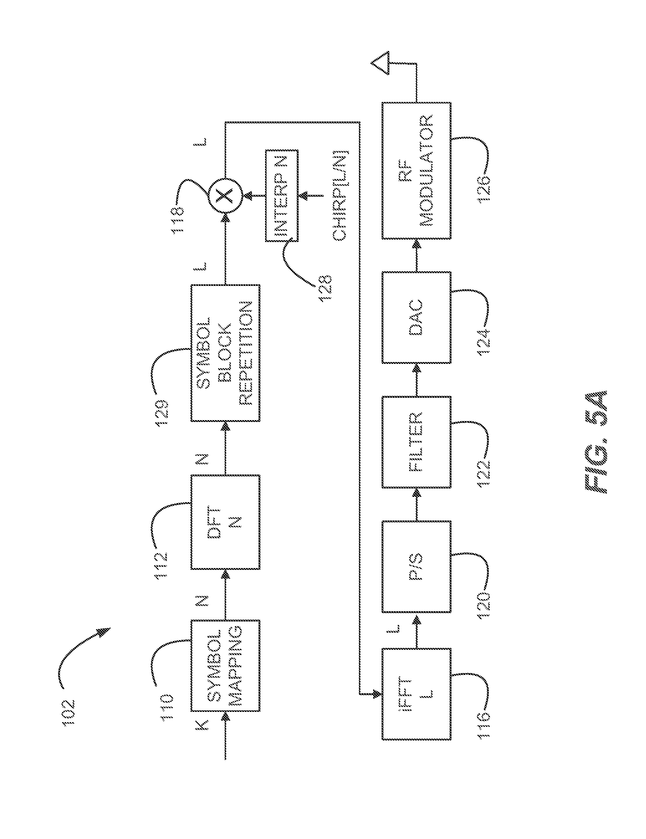In the approach shown in FIG. 5a, a block of K information bits is mapped at 110 to a block of N transmit symbols. The symbols may be BPSK, QPSK, QAM, or any other known type of modulation. The block of symbols, represented as a matrix of complex-valued data, are transformed at 112 into the frequency domain via an N point DFT. The block of N symbols in the frequency domain are simply repeated L/N times at 129 and then spread at 118 using an interpolated chirp sequence. In the example shown, the chirp sequence length is equal to L/N. The chirp sequence is interpolated at 128.