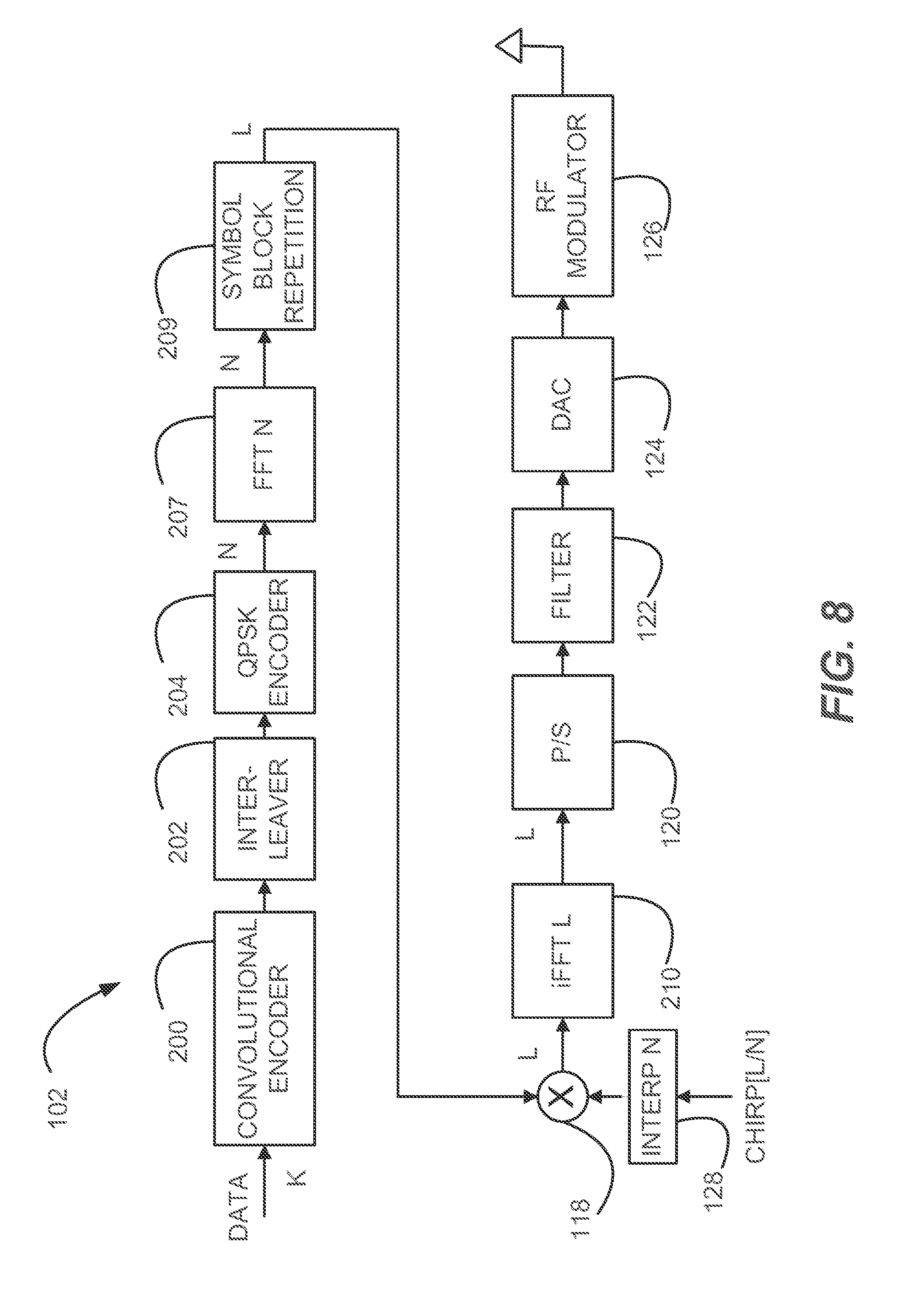 An example embodiment of Interleaved SC-CSS is shown in FIG. 7. In the example embodiment shown in FIG. 7, a block of K information bits is encoded at 202. In one such embodiment, forward error correction is used to provide a more robust communication link and to provide higher sensitivity at the receiver 104. The information data is encoded by a convolutional encoder at 202 and the coded bits are distributed within a block of data by an interleaver at 204. The coded bits are then mapped to modulation symbols by a QPSK encoder at 206. In both embodiments the number of symbols, N, and the transmit block length, L, are powers of 2 with N<L. In the OCDM case, since N is a power of 2, the pre-coding is efficiently performed with an N point FFT at 208.