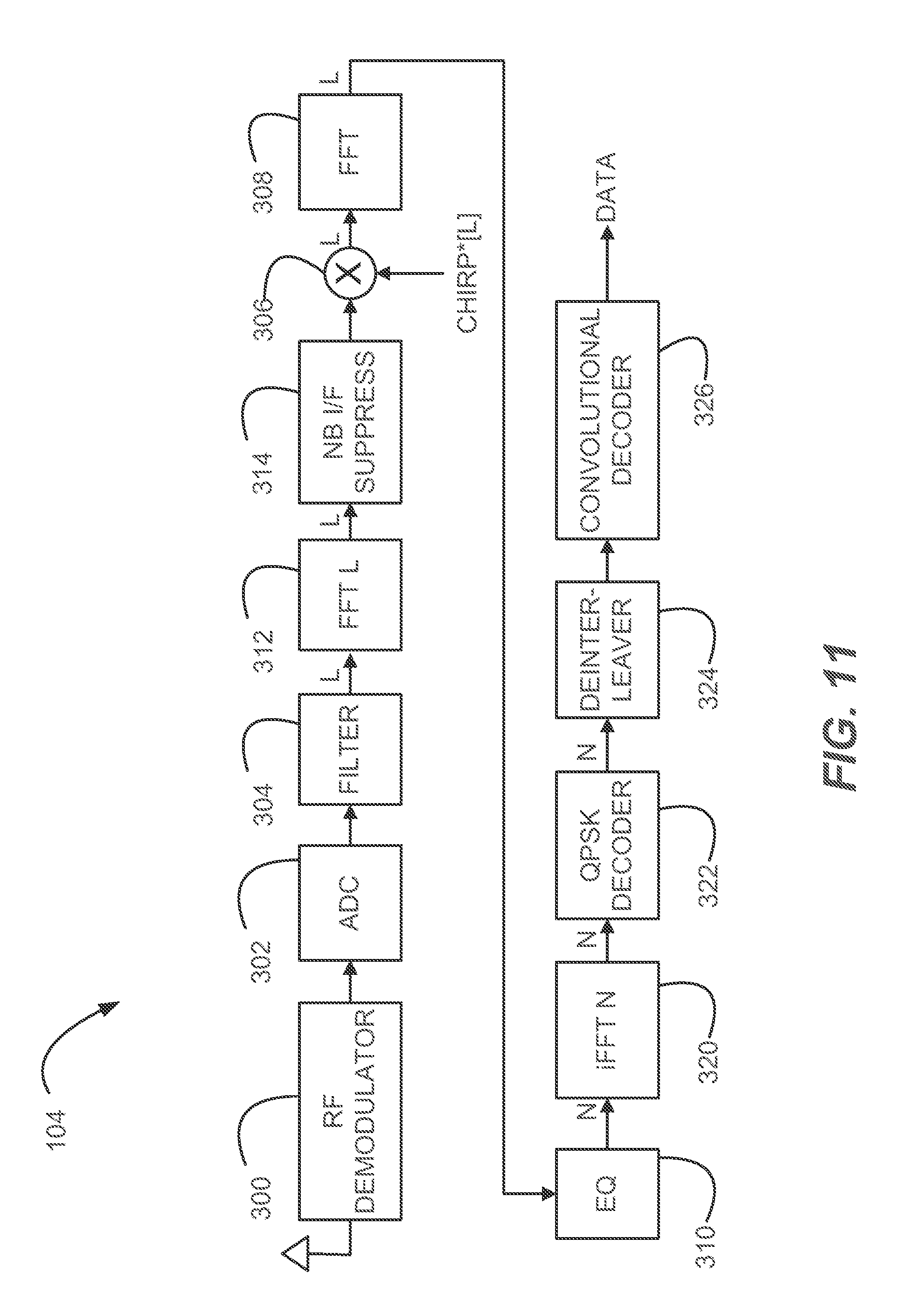 An SC Interleaved CSS Receiver which employs frequency domain demodulation is illustrated in FIG. 11. In the example embodiment of FIG. 11, the filtered, digital baseband signal is first buffered into a block of L samples and converted into the frequency domain using an L point FFT 312. Conversion into the frequency domain may be desirable in order to easily filter (at 314) any narrowband interference which may appear in the pass-band. Following narrowband suppression, the block of data is correlated with the chirp signal at 306 by multiplying the data with the length L chirp signal, then performing an L point FFT at 308. The remaining processing is the same as the time domain demodulator case as presented in FIG. 9.