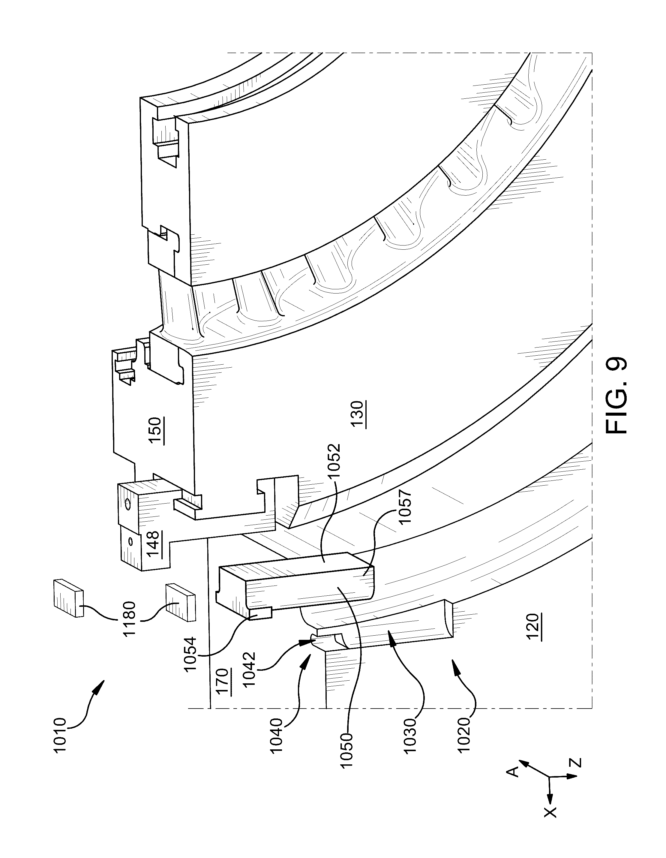 FIG. 8 shows a partial end elevation of a steam turbine nozzle support assembly according to various embodiments of the disclosure.