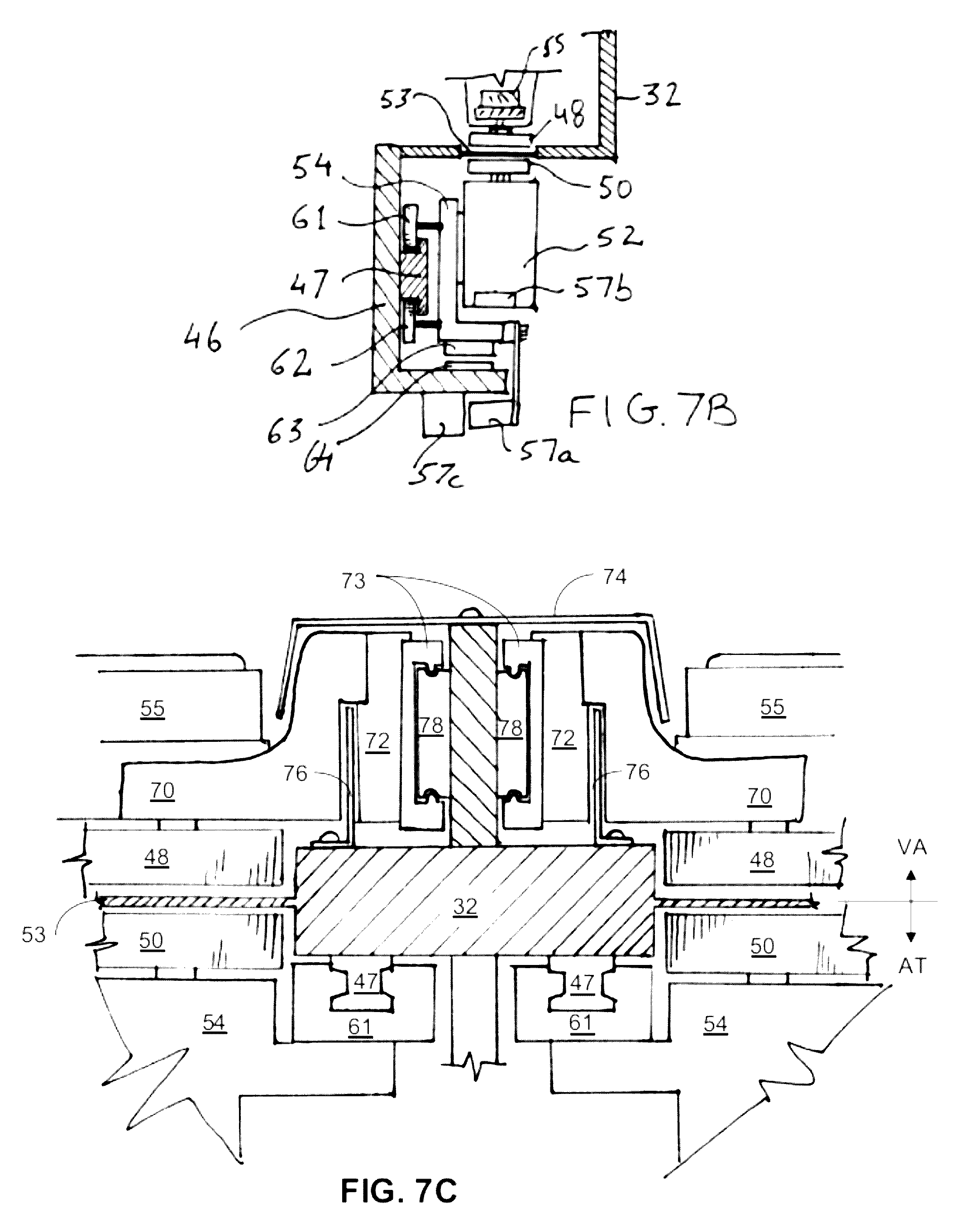 [0055]FIG. 7B is a sectional view about line A-A of FIG. 4, illustrating another embodiment of the linear motion assembly. In FIG. 7C, drive track 46 supports rails 47, upon which wheels 61 and 62 ride. These wheels may be magnetized to provide improved traction. The wheels 61, 62 are coupled to the base 54, upon which the rotary motor 52 is mounted. A linear motor 63 is mounted to the lower part of the base 54 and interacts with an array of magnets 64 that are mounted onto the drive track 46. The linear motor 63 interacts with magnets 64 to impart a linear motive force to move the base 54 in the direction in and out of the page. The linear motion of the base 54 is monitored and reported by encoder 57b, which reads position/motion encoding 57c provided on the track 46. In this specific example, the encoder 57b has a precision of five-thousands of an inch.