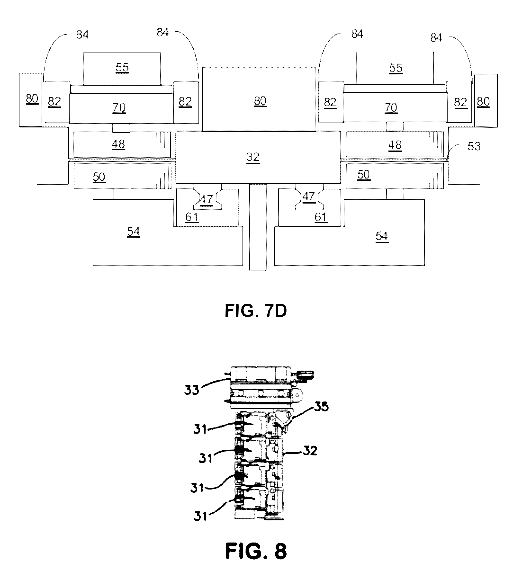 [0057]FIG. 7D illustrates another example of a linear track in atmosphere and linear track in vacuum. In FIG. 7D the atmospheric side may be constructed the same as that of FIG. 7C. However, in order to minimize contamination, in the vacuum side magnetic levitation is utilized instead of slider bearings. As illustrated in FIG. 7D, active electromagnetic assemblies 80 cooperate with permanent magnets 82 to form magnetic levitation and allow free linear movement of base 70. Notably, the permanent magnets 82 maintain free space 84 and do not contact electromagnet assemblies 80. As base 54 moves linearly with sliders 61, magnetic coupling between coupler 50 and follower 48 impart the linear motion to the levitated base 70. Similarly, rotation of the coupler 50 causes rotation of the follower 48, which transmits the rotation to gear reducer 55. Therefore, it should be understood that references to “linear track” in this specification includes to tracks having mechanical motion or magnetically levitated motion.