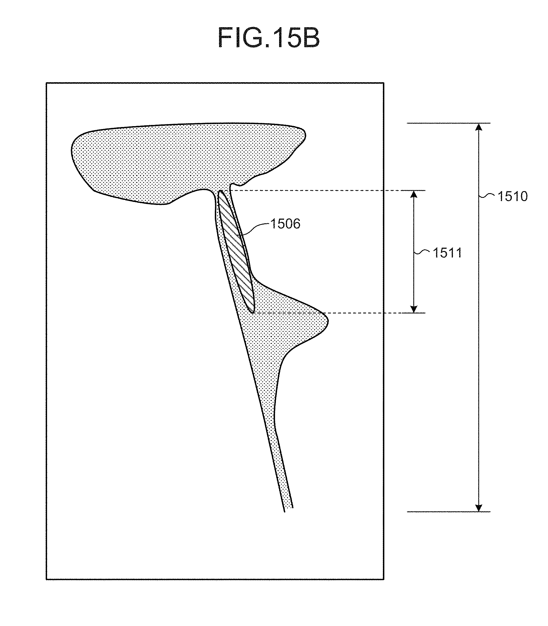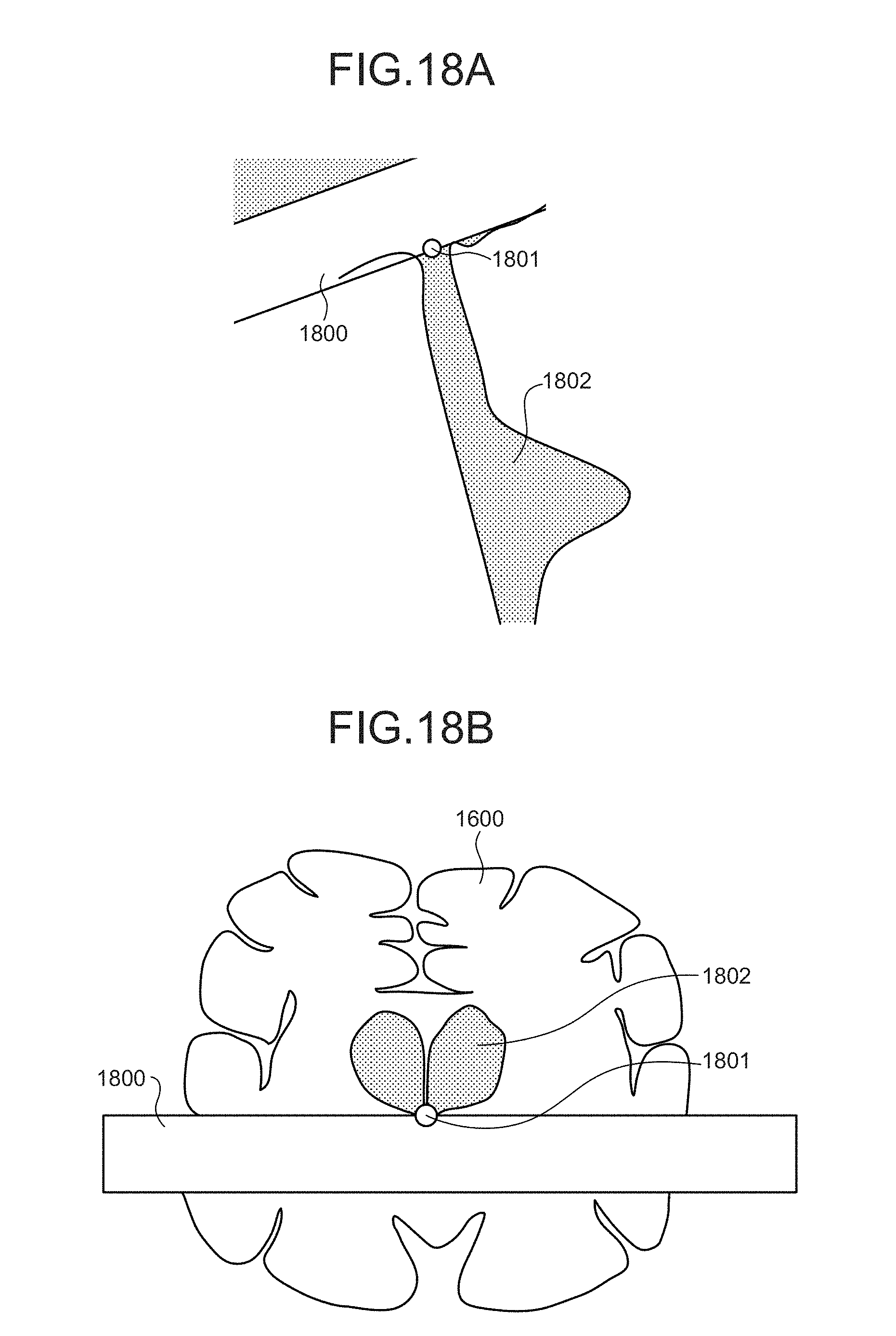 [0141]In FIG. 18A, a label region 1800 is set on the upper side of a morphological region 1802. In this situation, generally speaking, fluid such as CSF tends to flow out from a label region to a morphological region or to flow into a label region from a morphological region. Thus, as shown in FIG. 18A, for example, it is desirable if the index deriving unit 126d determines a boundary position between the label region 1800 and the morphological region 1802 to be a reference position 1801. In another example shown in FIG. 18B, a label region 1800 is set on the lower side of a morphological region 1802. Thus, as shown in FIG. 18B, for example, it is desirable if the index deriving unit 126d determines a boundary position between the label region 1800 and the morphological region 1802 to be a reference position 1801. For example, if the upper end of a CSF region is used as the reference position like in the first embodiment, the upper end itself serving as the reference position may also move due to the moving of the entire CSF region. In contrast, when the boundary position between the label region 1800 and the morphological region 1802 is used as the reference position, it is possible to calculate the distance more accurately. As a result, the accuracy of the index also improves. In this situation, for example, it is preferable to select, as the reference position, a pixel positioned at the center or a pixel positioned at a gravity point from among the pixels positioned on the boundary line between the label region and the morphological region. Further, in the second embodiment, the method for calculating the distance is explained with reference to FIGS. 15A and 15B. This calculation method is similarly applicable to the situation where the boundary position between the label region and the morphological region is used as the reference position.