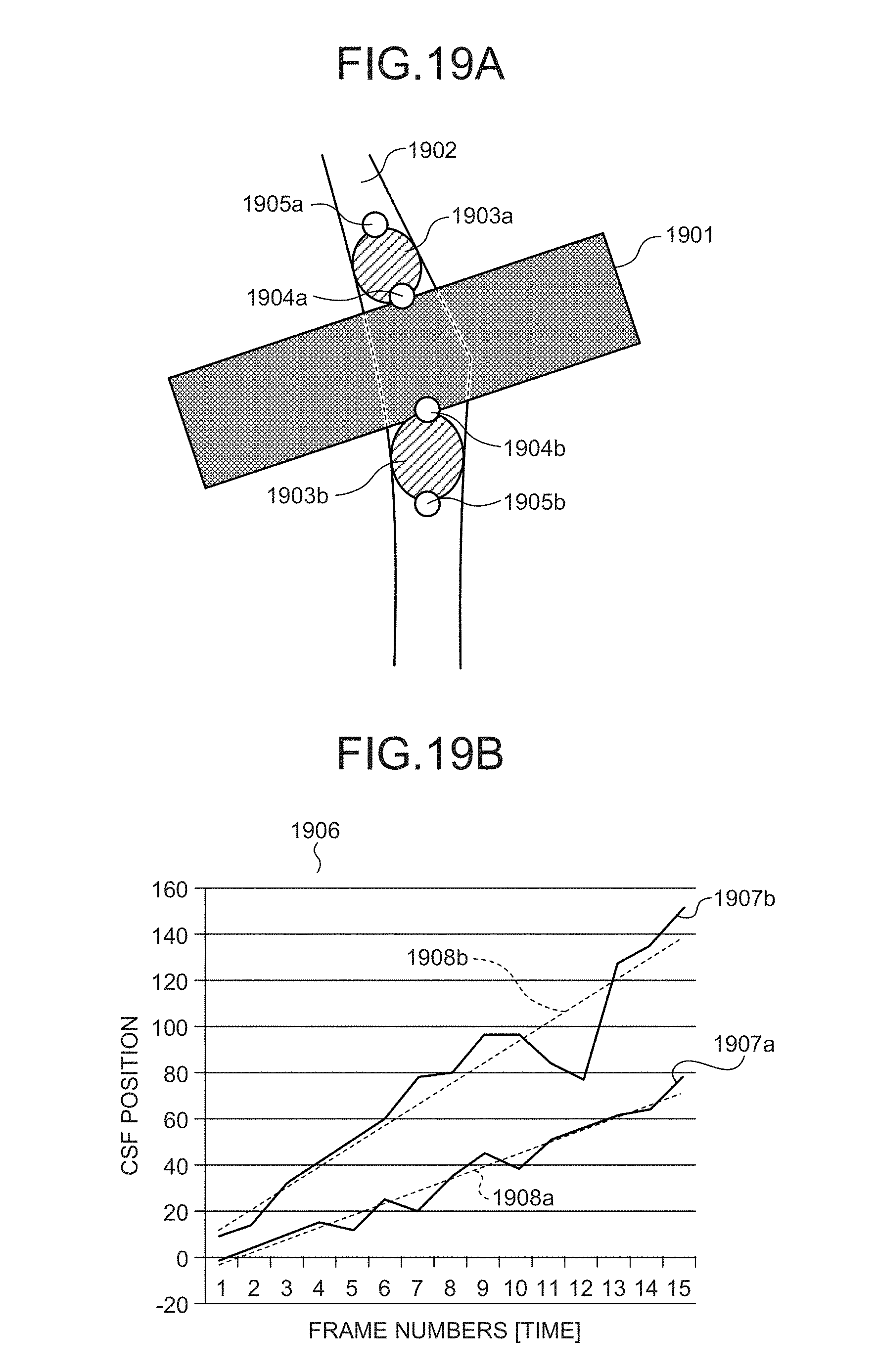 [0147]FIG. 19B is a drawing of an exemplary display according to said another embodiment. For example, as shown in FIG. 19B, in a plot chart 1906, the display controlling unit 126e displays a plot line 1907a of the CSF position that is positioned downward from the label region 1901 and also displays a plot line 1907b of the CSF position that is positioned upward from the label region 1901. Also, as shown in FIG. 19B, for example, the display controlling unit 126e displays regression lines 1908a and 1908b, respectively. In addition, for example, the display controlling unit 126e may further display velocity information calculated on the basis of the slopes of the regression lines. In other words, it is sufficient if the display controlling unit 126e displays at least one selected from the plot chart, the regression lines, and the velocity information. Further, it is also possible to select or combine, as appropriate, what is expressed by the X-axis and by the Y-axis.