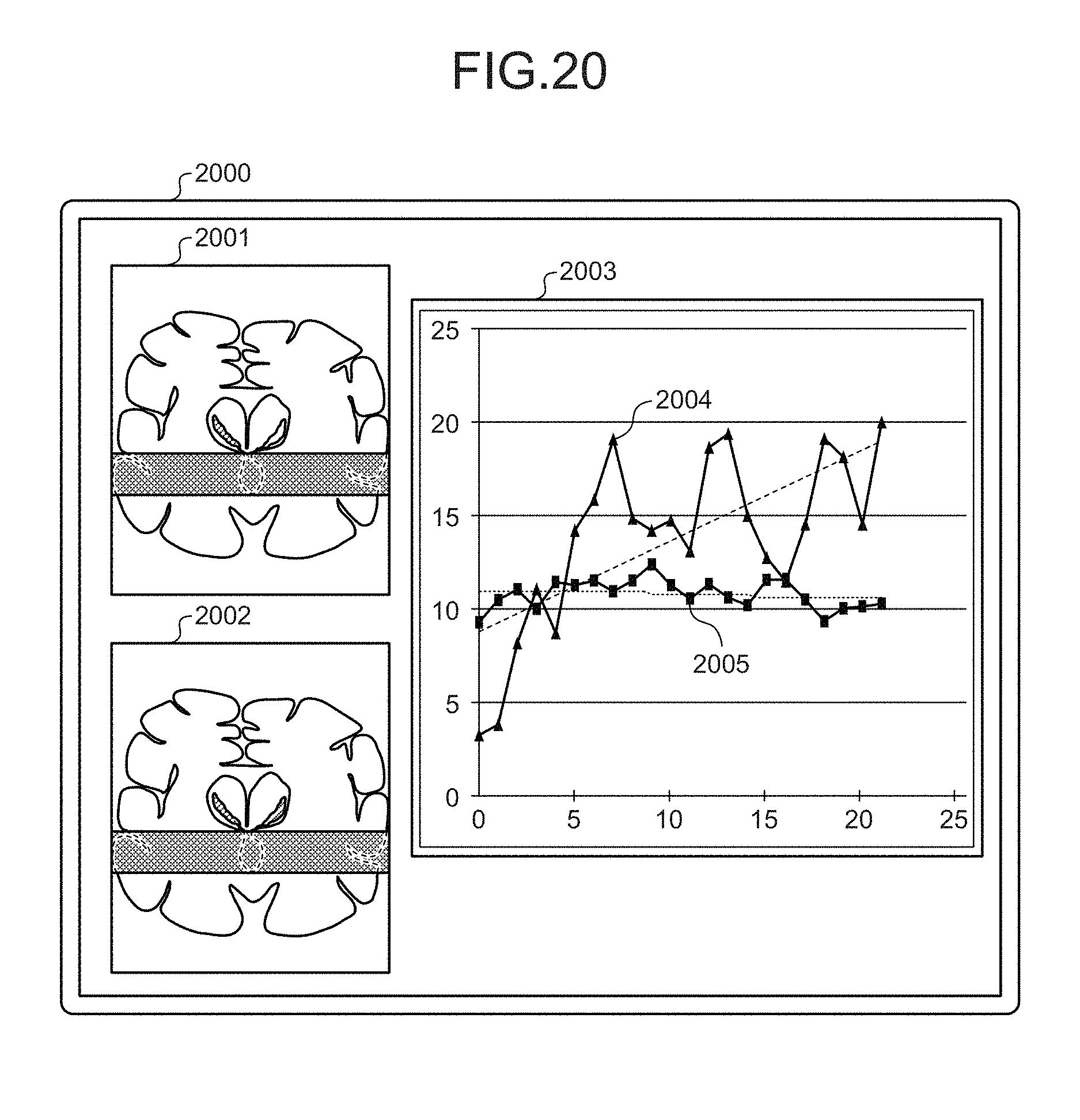 [0152]FIG. 20 is a drawing of an exemplary display according to yet another embodiment. For example, the display controlling unit 126e according to said another embodiment displays, as shown in FIG. 20, superimposed images 2001 corresponding to a CSF image sequence in a plurality of time phases acquired before surgery, for example, and superimposed images 2002 corresponding to a CSF image sequence in a plurality of time phases acquired after surgery, for example. Further, the display controlling unit 126e displays a plot line 2004 and a plot line 2005 corresponding respectively as well as regression lines corresponding respectively, in the same window 2003. When the CSF images of the plurality of types and the corresponding indexes are simultaneously displayed in this manner, it is easier for the viewer to make a comparison. Further, the superimposed images 2001, the superimposed images 2002, and the window 2003 do not necessarily have to be displayed simultaneously. It is acceptable to simultaneously display only one or two of these items.