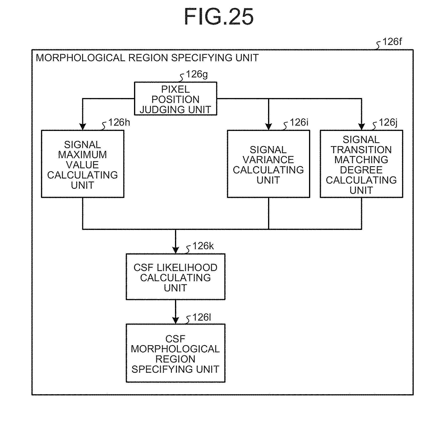 [0168]FIG. 25 is a block diagram of the morphological region specifying unit 126f according to yet another embodiment. As shown in FIG. 25, the morphological region specifying unit 126f includes a pixel position judging unit 126g, a signal maximum value calculating unit 126h, a signal variance calculating unit 126i, a signal transition matching degree calculating unit 126j, a CSF likelihood calculating unit 126k, and a CSF morphological region specifying unit 1261.