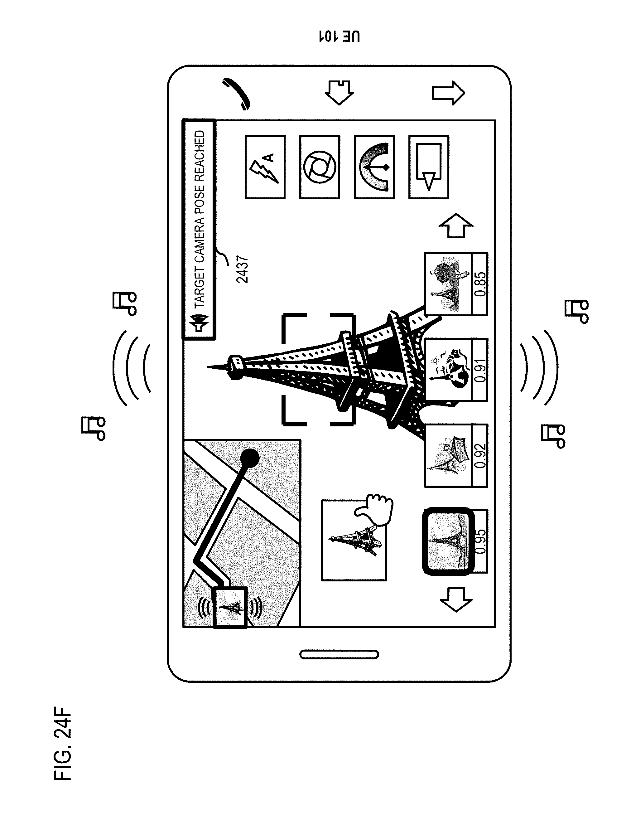 In one embodiment, when a user walks towards a favorite camera spot, the square dot (2424) and round dot (2425) converge on the map. While this visual feedback is informative, keeping tracking of two tiny dots on 2D map is often onerous and distracting for users. Therefore, two additional forms of feedback to confirm reaching the destination camera pose may be provided as illustrated in FIGS. 24E and 24F. FIG. 24E is a visual representation of the visual feedback, where one representative photo of the target camera pose is displayed as a semi-transparent image (2435) on viewfinder screen so that users may inspect differences between the representative photo and the camera viewfinder images. Since the viewfinder image is presumably the focus of the users, this feedback is noticeable and non-distracting. Optionally, the matching of the representative photo with viewfinder images can be automated by using image matching techniques. For this embodiment, when a good matching is found, for example, the target camera pose is reached, viewfinder images can be further highlighted by flashing on/off. FIG. 24F is a visual representation of audio feedback applicable to UE 101 embedded with a music player, whereby a piece of music is played when the target camera pose is reached (2437). Optionally, the loudness and pitch of the music can be modulated according to the differences between the target and current camera poses. These forms of confirmation can be used either independently or cooperatively. In one embodiment, if the user is satisfied with the selected camera pose, he/she can turn off VAP Meter by touching VAP meter icon again (2401) or simply pressing the camera shutter release button. Otherwise, the whole selection-navigation-confirmation process may repeat.
