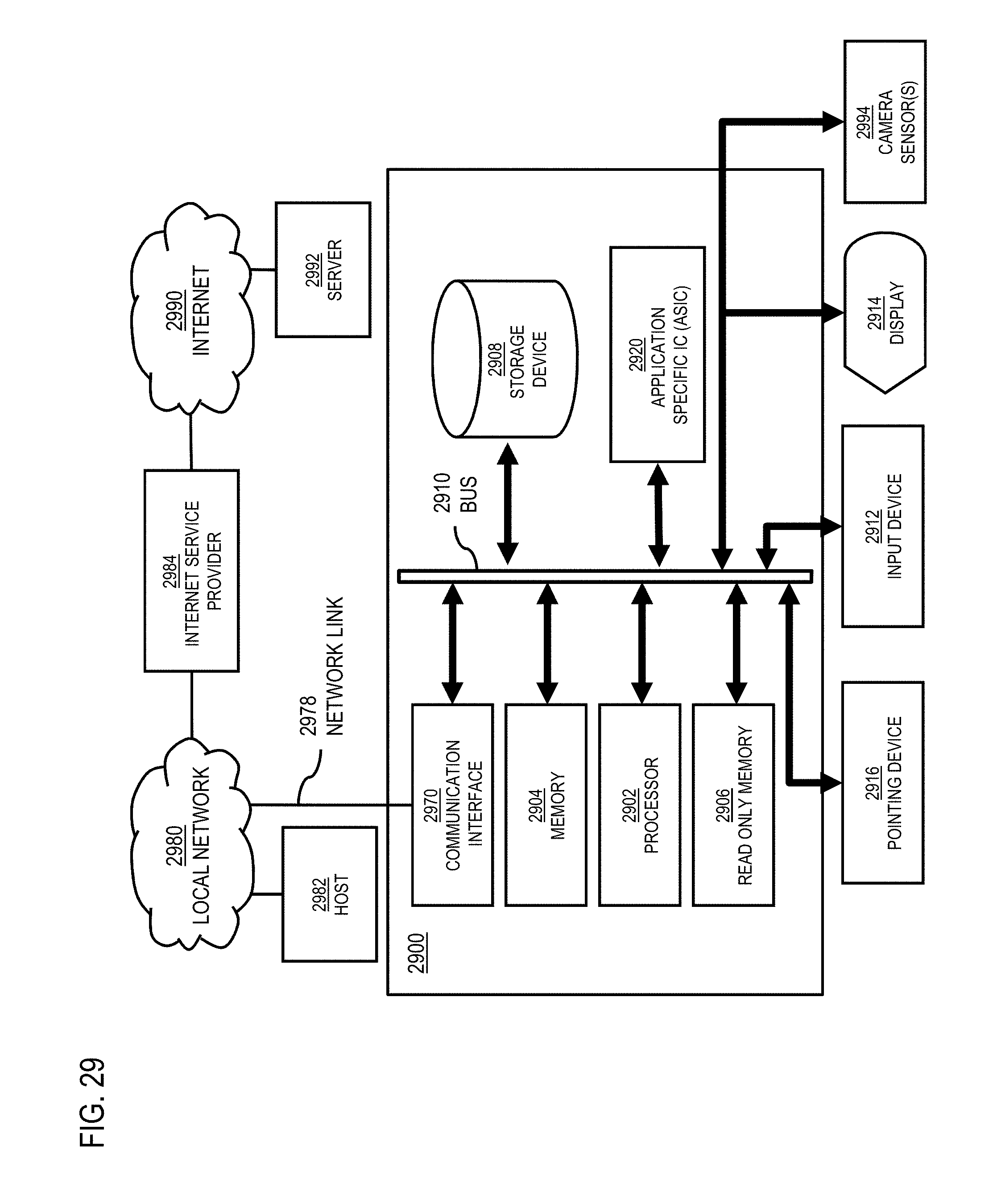 A computer called a server host 2992 connected to the Internet hosts a process that provides a service in response to information received over the Internet. For example, server host 2992 hosts a process that provides information representing video data for presentation at display 2914. It is contemplated that the components of system 2900 can be deployed in various configurations within other computer systems, e.g., host 2982 and server 2992.