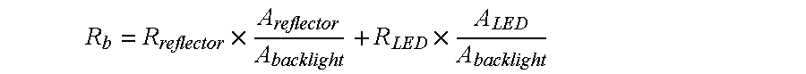 A typical bulk diffuser is 60 percent transmissive and 20 percent reflective. Assuming that the rest of the films (thin diffuser, BEF, DBEF, and so on) are cumulatively 50 percent transmissive and 50 percent reflective, then the transmission and reflection of the entire optical stack are approximately 30 percent and 70 percent, respectively. As shown below, the average reflectance Rb of the backlight is a combination of the area and reflectance of the reflector material, Areflector and Rreflector, as well as the area and the reflectance of the LEDs, ALED and RLED. The clearance of the rear reflector around each LED must be minimized within manufacturing tolerances to achieve the highest amount of reflective area possible. This is referred to as backlight fill factor. Using this model, it can be seen that changing the reflectance of the rear reflector has a profound effect on the transmission of the entire backlight, and hence the efficiency. Comparison of Material Reflectance demonstrates that increasing the material reflectance from 90 percent to 98 percent increases the optical transmission from 69 percent to 77 percent, or roughly a gain of 11 percent in luminance. The following example is based upon the values listed here: