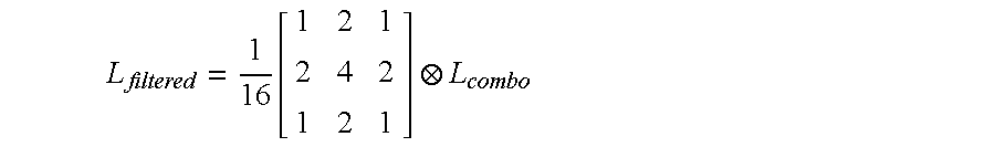 where a and b are weight coefficients. In the current Dolby Core algorithm solution, a is set to 0.25 and b is set to 0.75. Smoothing Filter Spatial aliasing is addressed by applying a lowpass spatial filter to the combination image. This smoothes the backlight gradients, spreading the halo symmetrically about the object. The size of the filter can be adjusted to optimize the balance between backlight contrast and backlight aliasing for a particular implementation. For example, an approximate 2D Gaussian distribution as filter kernel is used: Mean Downsample to LEDs The filtered backlight image Lfiltered is further downsampled to the resolution of the backlight clusters to establish the drive values. A mean bilinear downsample is applied to smooth the backlight image. The filtered image is at twice the resolution of the cluster image, so a 2×2 region is used for this process: