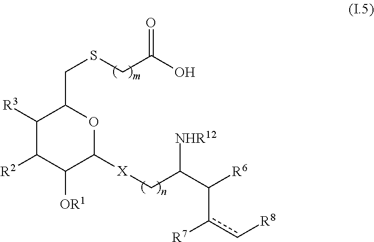 n is 1 when X is O or S; or n is 0 or 1 when X is CH2; or a pharmaceutically acceptable salt thereof. Preferably, the compound of formula (I) is a compound of formula (I.1) Preferably the stereochemistry of the 6-membered sugar ring of formula (I) is α-D-galacto. Preferably, n in formula (I) is 1, the stereochemistry of the 6-membered sugar ring of formula (I) is α-D-galacto, R6 is OH and R7 is OH. It is further preferred that n in formula (I) is 1, the stereochemistry of the 6-membered sugar ring of formula (I) is α-D-galacto, R6 is OH, R7 is OH and the stereochemistry at carbon atoms 2, 3 and 4 is (2S, 3S, 4R). Alternatively preferably, n in formula (I) is 0, X is CH2, the stereochemistry of the 6-membered sugar ring of formula (I) is α-D-galacto, R6 is OH and R7 is OH. It is further preferred that n in formula (I) is 0, the stereochemistry of the 6-membered sugar ring of formula (I) is α-D-galacto, R6 is OH, R7 is OH and the stereochemistry at carbon atoms 2, 3 and 4 is (2S, 3S, 4R). Preferably, in formula (I) when X is O, R6 is OH, R7 is H, R8 is C1-C15 alkyl and Preferably Z in formula (I) is S. Alternatively, preferably Z is SO. Alternatively, preferably Z is SO2. Preferably X in formula (I) is O. Preferably R12 in formula (I) is C26 acyl. More preferably R12 is a C26 acyl group which is unsubstituted. Preferably R8 in formula (I) is C10 to C14 alkyl, most preferably C13 alkyl. Preferably R1 in formula (I) is H. It is also preferred that R2 in formula (I) is OH. More preferably R1 is H and R2 is OH. Preferably R3 in formula (I) is OH. Preferably R6 in formula (I) is OH. Preferably R7 in formula (I) is OH. More preferably R7 is OH and R6 is OH. Still more preferably R7 is OH, R6 is OH and X is O. Alternatively it is preferred that R7 in formula (I) is H and R6 is OH. Preferably R8 in formula (I) is C1-C15 alkyl. More preferably R8 is C1-C15 alkyl having a straight or branched carbon chain containing no double bonds, triple bonds, oxygen atoms or aryl groups. Still more preferably R8 is C13 alkyl having a straight carbon chain containing no double bonds, triple bonds, oxygen atoms or aryl groups. Still more preferably R8 is C1-C15 alkyl, R7 is OH and R6 is OH. Still more preferably R8 is C1-C15 alkyl, R7 is OH, R6 is OH and X is O. Preferably R12 in formula (I) is acyl having a straight carbon chain from 6 to 30 carbon atoms long. More preferably R12 is C26 acyl. More preferably R12 is C26 acyl having a straight carbon chain containing no double bonds, triple bonds, oxygen atoms, aryl groups and which is unsubstituted. More preferably X is O and R12 is acyl having a straight carbon chain from 6 to 30 carbon atoms long. Still more preferably R12 is unsubstituted acyl having a straight carbon chain from 6 to 30 carbon atoms long. Preferably any halogen in formula (I) is bromine, fluorine or chlorine. Preferably R33 is a bromo group. Preferably D in formula (I) is an alkyl group, more preferably methyl, ethyl, propyl or butyl group. Most preferably D is t-butyl group. It is also preferred that D is an alkyl group substituted with an azide group. Alternatively preferably D in formula (I) is hydrogen. Alternatively preferably D in formula (I) is an alkenyl or alkynyl group, more preferably butenyl or butynyl group. Alternatively preferably D in formula (I) is an aralkyl group, more preferably D is a benzyl group optionally substituted with one or more halogen or amino groups. Alternatively preferably D is a 2-picolinyl group. Alternatively preferably D in formula (I) is an aryl group, more preferably phenyl or pyridyl group. Alternatively preferably D in formula (I) is a chloro group. Alternatively preferably D in formula (I) is a hydroxyl group. Alternatively preferably D in formula (I) is a cyano group. Alternatively preferably D in formula (I) is a radical of formula D1 Alternatively preferably D in formula (I) is a radical of formula D2 Alternatively preferably D in formula (I) is a radical of a radical of formula D3 Preferably the compound of formula (I) is a compound of formula (I.2) Alternatively, preferably the compound of formula (I) is a compound of formula (I.3) Alternatively, preferably the compound of formula (I) is a compound of formula (I.4) In another aspect, the invention provides a compound of formula (II) R2 is selected from the group consisting of H, OH, F and OR10; provided that if R2 is H, F or OR10, then R1 is H; or a pharmaceutically acceptable salt thereof. In still another aspect, the invention provides a compound of formula (VI) R3 is selected from the group consisting of H, OH, F and OR10; provided that if R3 is H, F or OR10, then R1 is H; or a pharmaceutically acceptable salt thereof. In another aspect, the invention provides a compound of formula (IV) wherein or a pharmaceutically acceptable salt thereof. In another aspect, the invention provides a compound of formula (V) or a pharmaceutically acceptable salt thereof. Preferably the stereochemistry of the 6-membered sugar rings of formula (IV) or formula (V) is α-D-galacto. Preferably, each n in formula (II), (IV), (V) or (VI) is 1, the stereochemistry of the 6-membered sugar rings of formula (II), (IV), (V) or (VI) is α-D-galacto, each R6 is OH and each R7 is OH. It is further preferred that each n in formula (II), (IV), (V) or (VI) is 1, the stereochemistry of the 6-membered sugar rings of formula (II), (IV), (V) or (VI) is α-D-galacto, each R6 is OH, each R7 is OH and the stereochemistry at carbon atoms 2, 3 and 4 is (2S, 3S, 4R). Alternatively preferably, each n in formula (II), (IV), (V) or (VI) is 0, each X is CH2, the stereochemistry of the 6-membered sugar rings of formula (II), (IV), (V) or (VI) is α-D-galacto, each R6 is OH and each R7 is OH. It is further preferred that each n in formula (II), (IV), (V) or (VI) is 0, the stereochemistry of the 6-membered sugar rings of formula (II), (IV), (V) or (VI) is α-D-galacto, each R6 is OH, each R7 is OH and the stereochemistry at carbon atoms 2, 3