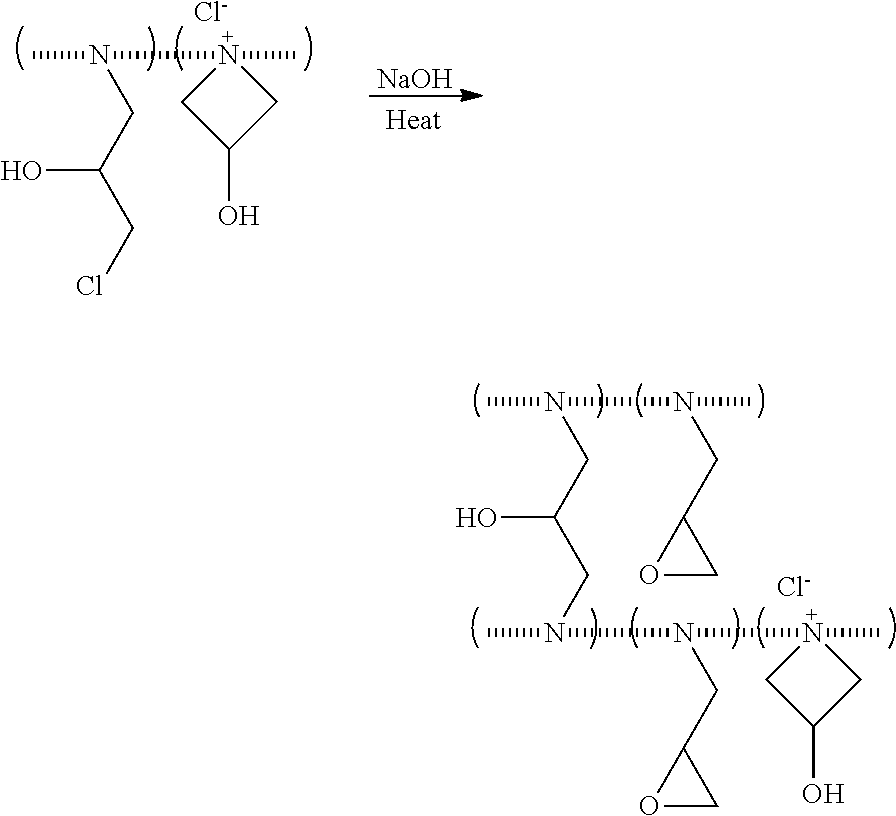 This invention contemplates not only the use of such polyamines as diethylenetriamine, triethylenetetramine, tetraethylenepentamine, and dipropylenetriamine, which can be obtained in reasonably pure form, but also mixtures and various crude polyamine materials. The term “polyalkylene polyamine” employed in the claims, therefore, refers to and includes any of the polyalkylene polyamines referred to above or to mixtures of polyalkylene polyamines and derivatives thereof. In some aspects, it is desirable to increase the spacing of secondary amino groups on the polyamide molecule in order to change the reactivity of the polyamide-epichlorohydrin complex. This can be accomplished by substituting a diamine such as ethylenediamine, propylenediamine, hexamethylenediamine and the like for a portion of the polyalkylene polyamine. For this purpose, up to about 80% of the polyalkylene polyamine may be replaced with a molecularly equivalent amount of the diamine and can be about 50% or less. In one aspect of the invention, an amine end-capped polyaminopolyamide (a.k.a., polyamide) may be used as described in U.S. Pat. No. 5,017,642, U.S. Pat. No. 6,908,983 and U.S. Pat. No. 7,175,740 to manufacture the starting resin. In another aspect, a PAE resin for use in the base treatment process as outlined below can be a high solids, low viscosity PAE with low epihalohydrin by-products. In this aspect, a polyamide is reacted with a epihalohydrin at a temperature of from about 10° C. to about 100° C., or about 15° C. to about 50° C., or about 20° C. to about 45° C., until the viscosity for a 55% solids solution at 25° C. has reached an “S” or higher on the Gardner Holdt scale. Commercially available resins having similar viscosities as the claimed resin, would have an equivalent Gardner-Holdt of “A-2” at 20% solids. Therefore, in one aspect, the PAE resin of the present invention is lower in viscosity and molecular weight and higher in solids than the PAE generally used in the paper industry today. In another aspect, the polyamide is reacted with the epichlorohydrin in an aqueous solution to moderate the reaction. In another aspect, the pH can be adjusted to increase or decrease the rate of crosslinking. In one aspect, when the desired viscosity is reached, acid can be added to quench the reaction by reducing the pH of the reaction product and the resulting product is cooled to about 25° C. The resulting product is stabilized by adding sufficient acid to reduce the pH to at least about 6, or about 5, or about 4, or about 3. Any suitable acid or combination of acids, such as hydrochloric, sulfuric, nitric, formic, phosphoric, and acetic acid may be used to stabilize the product and may be hydrochloric acid and/or sulfuric acid. In one aspect of the invention, after quenching the final or resulting resin with acid, gelation stability can be improved by heating the resulting resin and further lowering the pH with acid, which decreases the AZE level and increases the ACH level of the resin. In another aspect of the invention the PAE resin is viscosity and functionally stable. Wherein viscosity stability is defined as the Brookfield viscosity increasing or decreasing less than 50% upon storage at 32° C. for 30 days, or less than a 30% change or less than a 20% change. Functionally stable is defined at having less than 40% change in any single functionality upon storage at 32° C. after 30 days, or less than 30% change or less than 20% change. In another aspect of the invention, the resulting resin has a solids content of greater than 40%, can be greater than 50%, and may be greater than 55%. The Brookfield viscosity of the resin is dependent on the solids content. For a 55% to 57% solids PAE resin, the viscosity can be from about 400 centipoise (cP) to about 1,100 cP, can be from about 600 cP to about 1,000 cP, and may be from about 750 cP to about 850 cP when measured with a Brookfield viscometer at 25° C. The resin can also have a low concentration of epihalohydrin by-products, 1,3-dichloropropanol (1,3-DCP), and 3-chloropropanediol (3-CPD). The resin can have less than 10,000 ppm of 1,3-DCF at 55% solids, can have less than 5,000 ppm of 1,3-DCP at 55% solids, and may be less than 1,000 ppm 1,3-DCP at 55% solids. In one aspect of the present invention, sufficient epihalohydrin should be used in the polyamide-epihalohydrin reaction, to convert most of the secondary amine groups to tertiary amine groups. However, more or less may be added to moderate or increase reaction rates. In general, when using epichlorohydrin, satisfactory results for achieving 1,3-DCP concentrations <1000 ppm may be obtained utilizing from about 0.70 moles to about 0.9 moles of epichlorohydrin for each mole of amine groups on the polyamide (as determined by amine number) can be from about 0.78 mole to about 0.85 moles epichlorohydrin for each mole of amine groups on the polyamide and may be from about 0.82 to about 0.84 moles of epichlorohydrin for each mole of amine groups on the polyamide. For resins with 1,3-DCP concentrations >1000 ppm the acceptable range may vary from about 0.85 moles to about 1.0 moles of epichlorohydrin for each mole of amine groups on the polyamide though higher levels of epichlorohydrin can be used. To produce a REACH compliant, high solids, low viscosity PAE resin, the epihalohydrin can be reacted with an amine end-capped polyaminopolyamide (prepolymer), as described in U.S. Pat. No. 5,017,642 and U.S. Pat. No. 6,908,983, assigned to Hercules Incorporated and U.S. Pat. No. 7,175,740, assigned to Hercules Incorporated. In some aspects of the present invention, the amine number for the prepolymer is greater than about 5.5 milliequivalents per dry gram of prepolymer, can be greater than about 6.0 milliequivalents per dry gram of prepolymer, and may be greater than about 6.25 milliequivalents per dry gram of prepolymer. In other aspects, the initial resin has an RSV of less than about 0.25 dL/dr