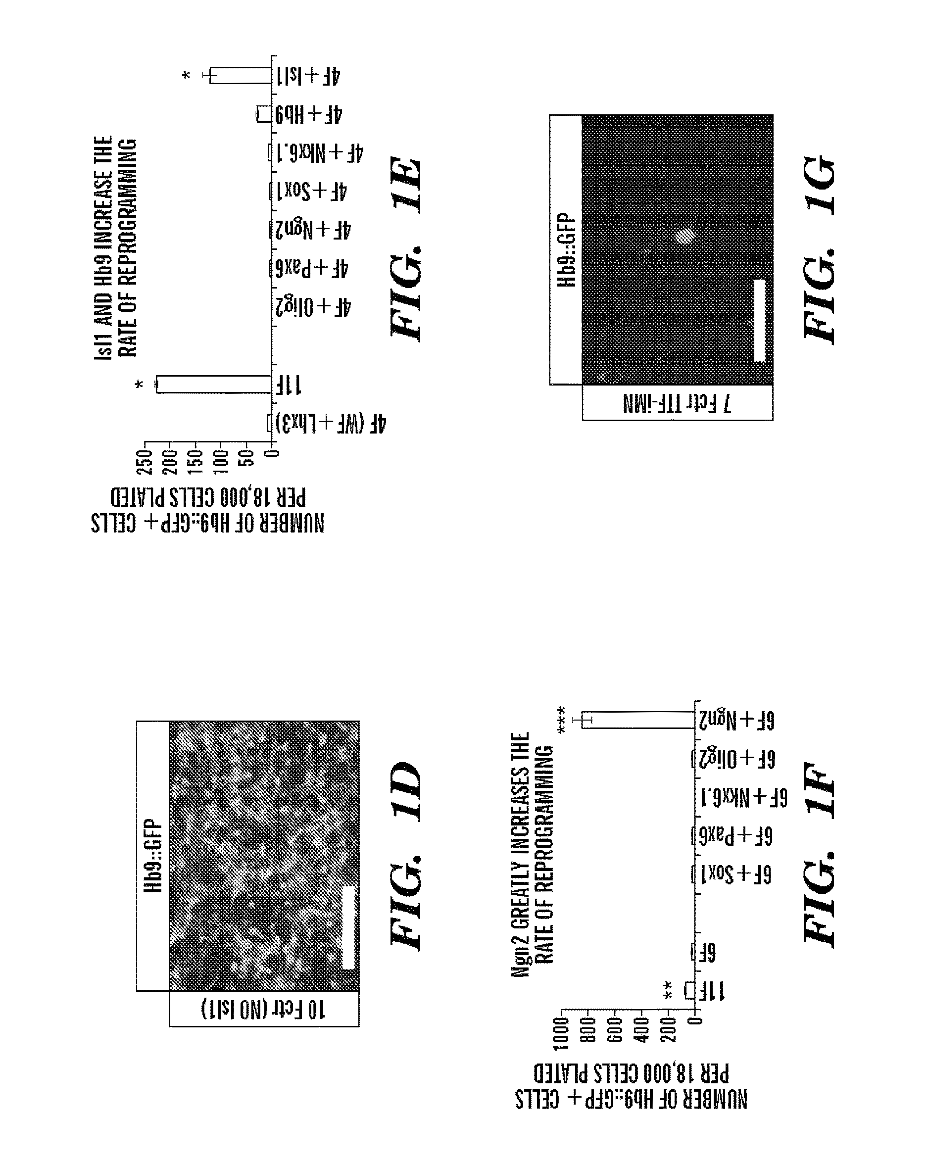 RT-Primer sequences: Gene Forward Primer Reverse Primer Ascl1 CCAACTACTCCAACGACT GGAGAGCCTGGCAGGTCC (SEQ ID NO: 33) (SEQ ID NO: 34) Brn2 GCGCCGAGGATGTGTATG AGGAAAGACTGTGGACC (SEQ ID NO: 35) (SEQ ID NO: 36) Hb9 ACAACTTCCCGTACAGCAAT CTTCCGCCCTGGAGGCAA (SEQ ID NO: 37) (SEQ ID NO: 38) Isl1 GCGACATAGATCAGCCTGC CATCTGAATGAATGTTCC (SEQ ID NO: 39) (SEQ ID NO: 40) Lhx3 CCCCCACCCATGAGGGTGCT GAGCCAGGGGAAGCAGAGGC (SEQ ID NO: 41) (SEQ ID NO: 42) Myt1l CGTGACTACTTTGACGGA TCACCACTAGAGCAGCTGT (SEQ ID NO: 43) (SEQ ID NO: 44) Ngn2 GCGTCATCCTCCAACTCC AGAGGGAGACCCGCAGCT (SEQ ID NO: 45) (SEQ ID NO: 46) Viral N/A TTTGTACAAGAAAGCTGGGT LTR (SEQ ID NO: 47) Example 1
