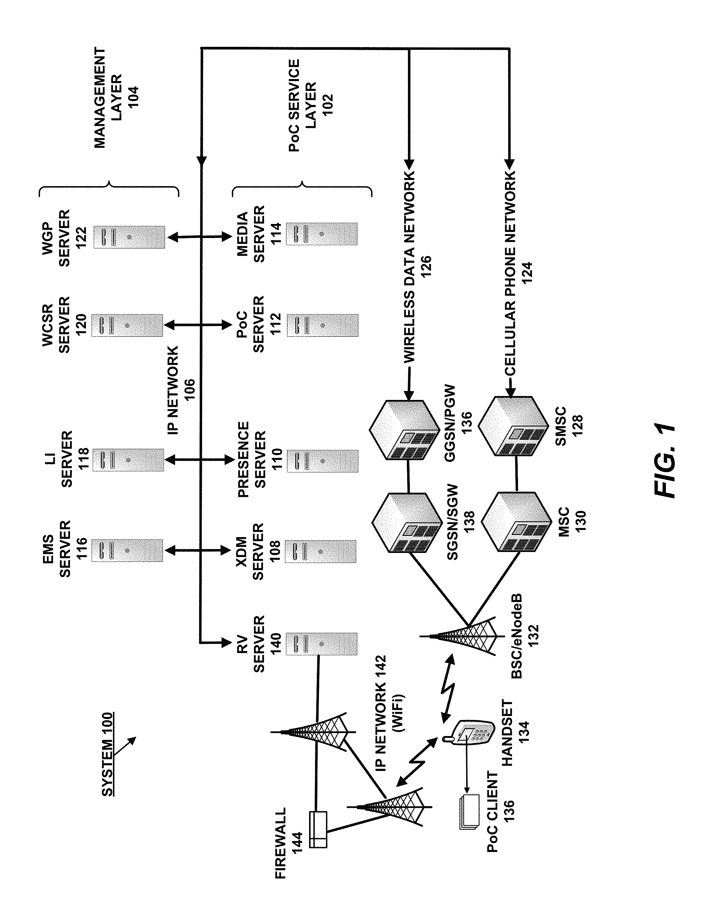 These elements are described in more detail below. The EMS Server 116 is an operations, administration, and maintenance platform for the system 100. The EMS Server 116 enables system administrators to perform system-related configuration, network monitoring and network performance data collection functions. The EMS Server 116, or another dedicated server, may also provide billing functions. All functions of the EMS Server 116 are accessible through a web-based interface. The LI Server 118 is used for tracking services required by various Lawful Enforcement Agents (LEAs). The LI Server 118 generates and pushes an IRI (Intercept Related Information) Report for all PoC Services used by a target. The target can be added or deleted in to the PoC Server 112 via the LI Server 118 using a Command Line Interface (CLI). The WGP Server 122 provides a web interface for corporate administrators to manage PoC contacts and groups. The web interface includes contact and group management operations, such as create, delete and update contacts and groups. The WCSR Server 120 provides access to customer service representatives (CSRs) for managing end user provisioning and account maintenance. Typically, it supports the following operations: