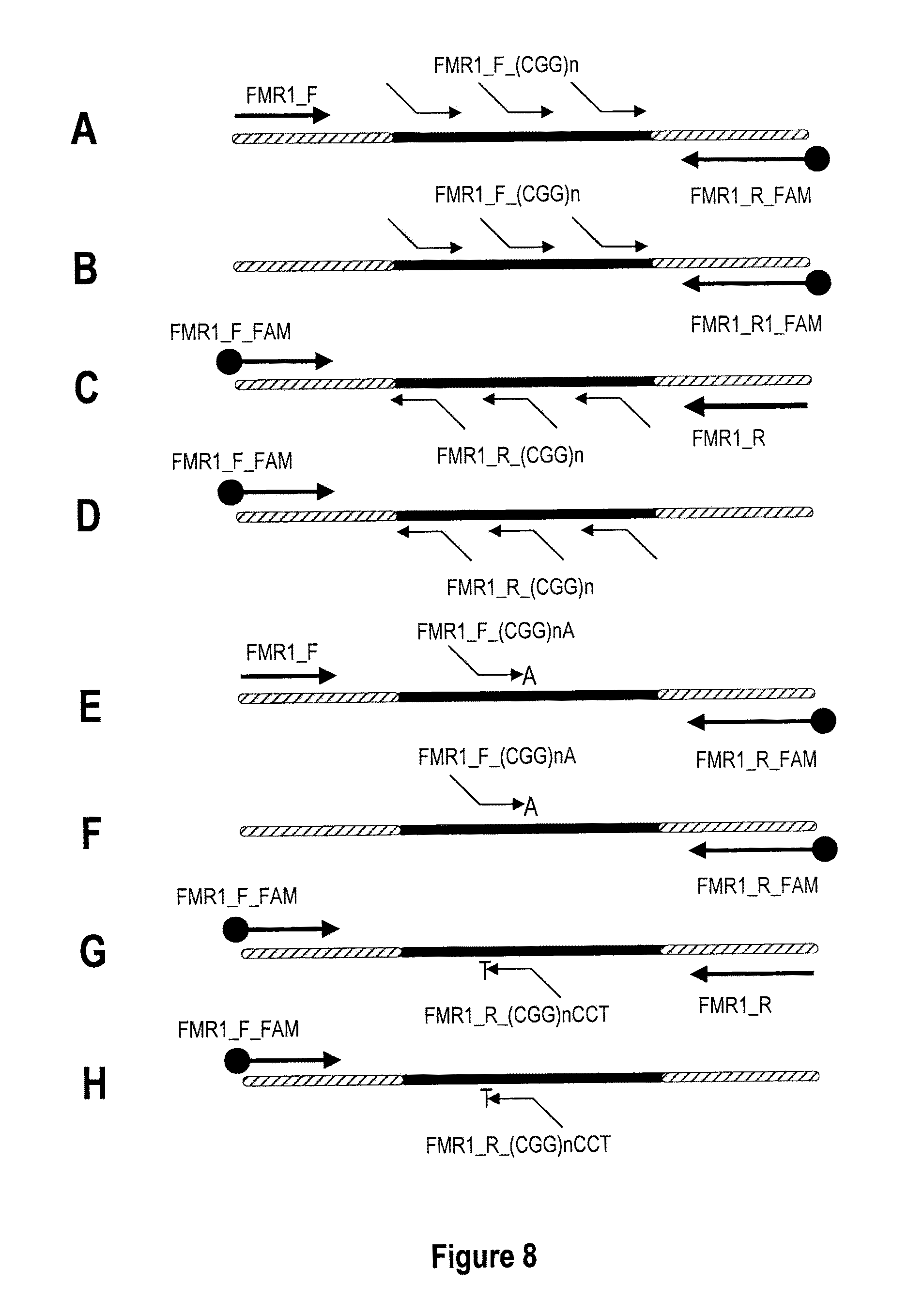 The FMR_F and FMR_R sequences shown may be substituted by any other suitable primer sequence from the 5′ and 3′ regions flanking the CGG repeats, respectively.