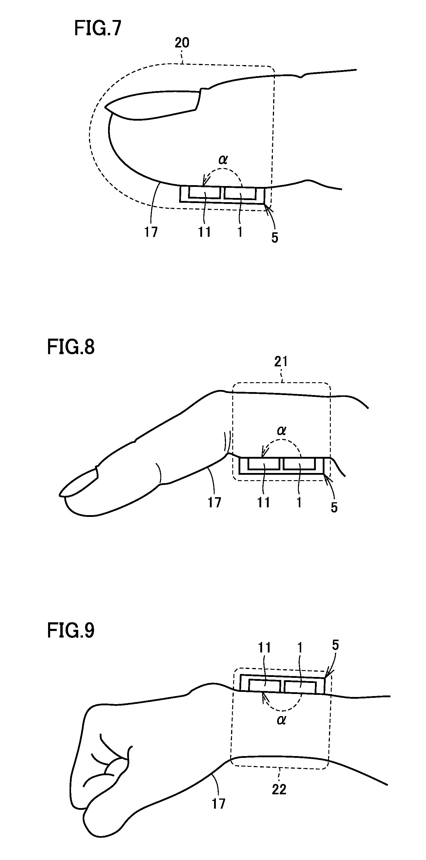FIG. 7 is a diagram showing how to attach sensor main body 5 shown in FIG. 6 to human body 17. In FIG. 7, a pulse wave sensor includes a finger sack-type housing 20. Sensor main body 5 is provided inside housing 20 such that white LED 1 and light receiving IC 11 face a pad of a finger (a palm of a hand) when finger sack-type housing 20 is attached to the finger tip of human body 17. In this way, white LED 1 and light receiving IC 11 are arranged on the thick and good-fitting pad of the finger (on the palm of the hand), thereby allowing a pulse wave to be stably measured, so that the pulse wave measurement accuracy can be improved. Furthermore, finger sack-type housing 20 also functions as a light shielding member that covers sensor main body 5. By providing the configuration as described above, a pulse wave can be stably measured without being influenced by light from the outside.