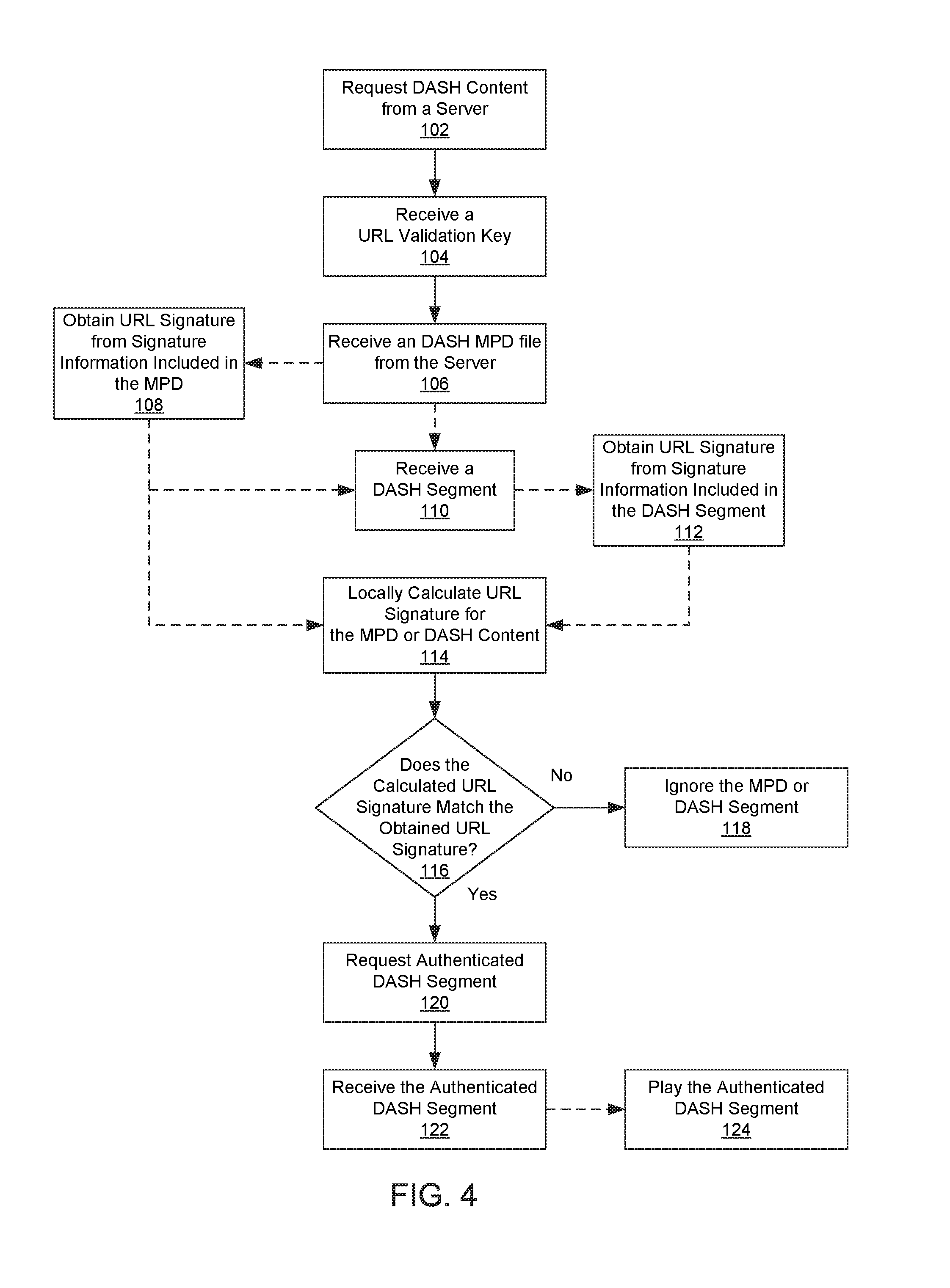 decoding a media presentation description (MPD) file received from a server in a content delivery network (CDN), wherein the MPD file includes: a URI, a URI signature associated with the URI, and a URI key indicator associated with the URI, wherein the URI key indicator is used to generate the URI signature; storing the MPD the in a memory of the cent device; and authenticate by the client device the URI included in the MPD file using the URI signature and the URI key indicator included in the MPD file for requesting from the server a DASH segment. 17. The at least one non-transitory machine readable storage medium of requesting, from the server, a DASH segment associated with the URI, and the DASH segment is requested after the URI is authenticated using the URI signature and the URI key indicator; and processing the DASH segment received from the server. 18. The at least one non-transitory machine readable storage medium of 19. The at least one non-transitory machine readable storage medium of 20. The at least one non-transitory machine readable storage medium of
