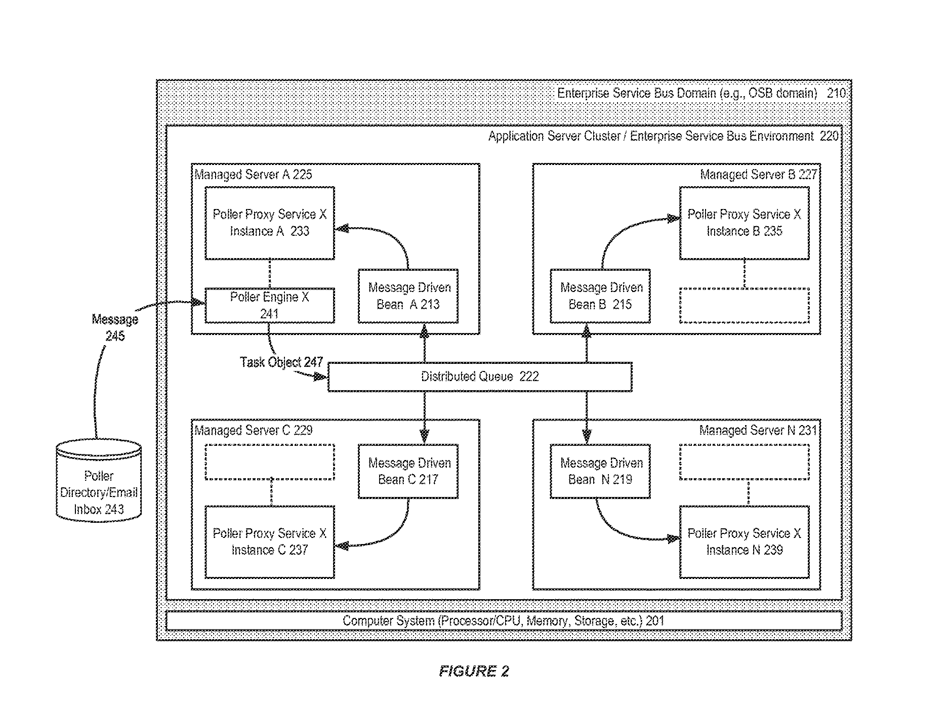 However, a poller engine (for example, poller engine X 241), which polls messages 245 from a File directory, an FTP directory, an SFTP directory, or an Email inbox, is provided to only one managed server (for example, managed server A 225) in the cluster.
