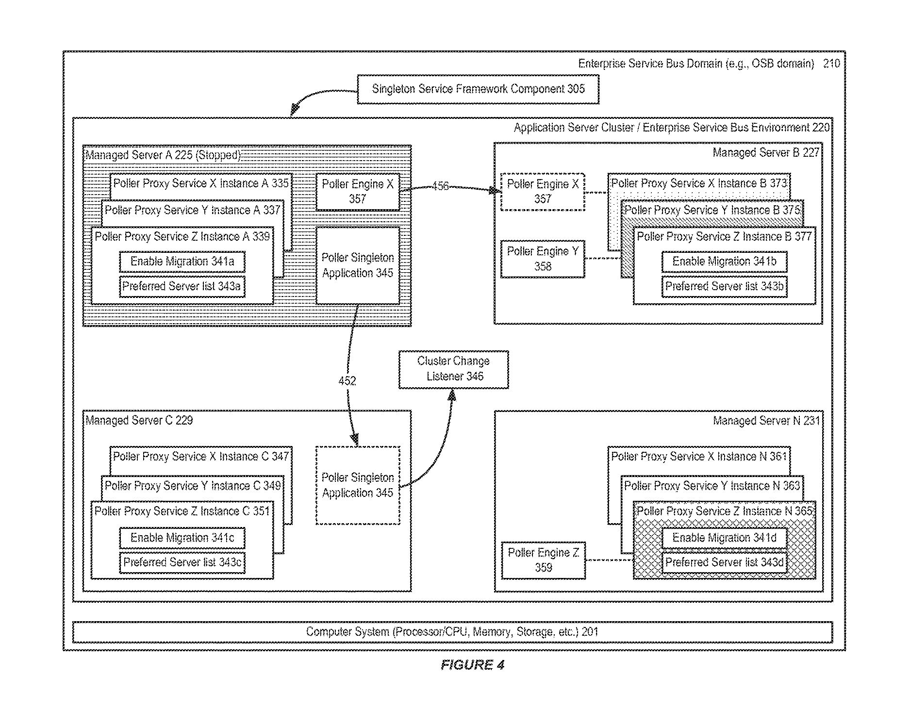In accordance with an embodiment, each poller proxy service can be configured with an “enable migration” flag and a “preferred server list” that are shared by each instance of that poller proxy service. For example, each of the “enable migration” flags 341a, 341b, 341c and 341d, which is associated with a different proxy service instance on a different managed server, includes the same information. Similarly, each of the “preferred server lists” 343a, 343b, 343c and 343d includes the same managed servers in the cluster.