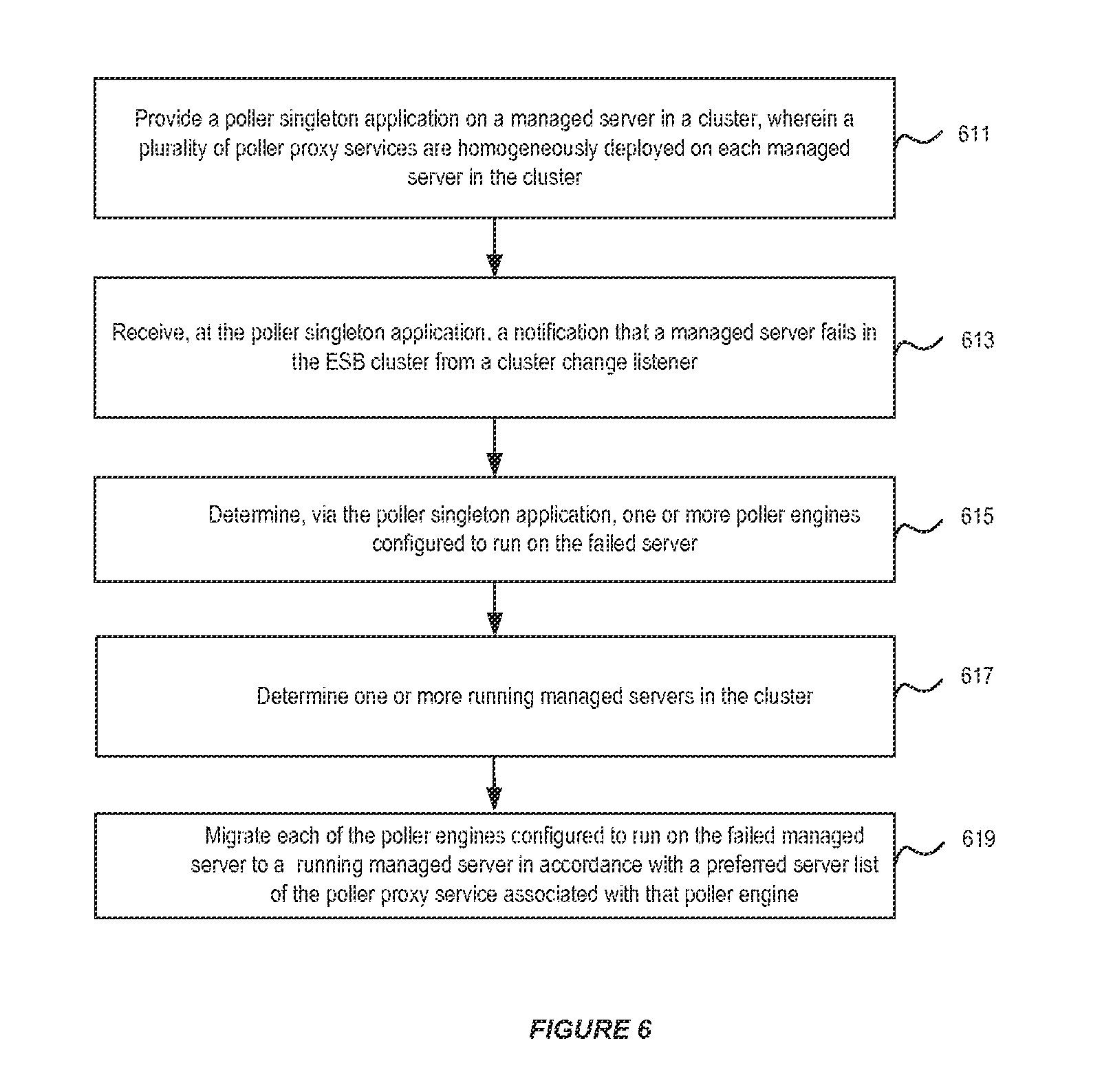 At step 619, the poller singleton application migrates each of the poller engines configured to run on the failed managed server to a running managed server in accordance with a preferred server list of the poller proxy service associated with that poller engine.