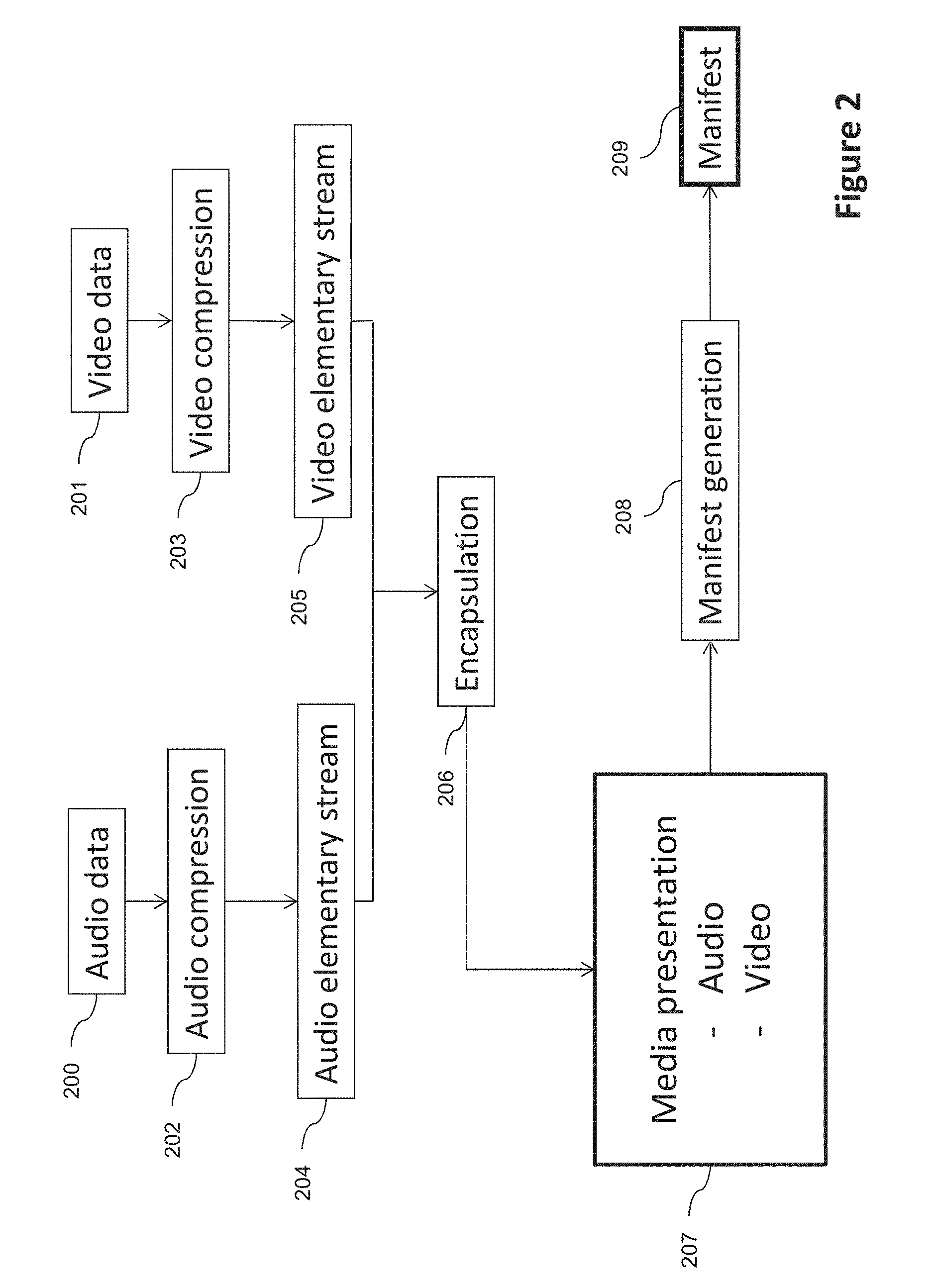 This line indicates that the audio media included in this adaptation set is related to one of the tiled version of the video sub-tracks. The executable code may be stored either in read only memory 1003, on the hard disk 1006 or on a removable digital medium such as for example a disk. According to a variant, the executable code of the programs can be received by means of a communication network, via the network interface 1004, in order to be stored in one of the storage means of the communication device 1000, such as the hard disk 1006, before being executed. The central processing unit 1001 is adapted to control and direct the execution of the instructions or portions of software code of the program or programs according to embodiments of the invention, which instructions are stored in one of the aforementioned storage means. After powering on, the CPU 1001 is capable of executing instructions from main RAM memory 1002 relating to a software application after those instructions have been loaded from the program ROM 1003 or the hard-disc (HD) 1006 for example. Such a software application, when executed by the CPU 1001, causes the steps of the flowcharts shown in the previous figures to be performed. In this embodiment, the apparatus is a programmable apparatus which uses software to implement the invention. However, alternatively, the present invention may be implemented in hardware (for example, in the form of an Application Specific Integrated Circuit or ASIC). Although the present invention has been described hereinabove with reference to specific embodiments, the present invention is not limited to the specific embodiments, and modifications will be apparent to a person skilled in the art which lie within the scope of the present invention. For example, the present invention may be embedded in a device like a camera, a smartphone or a tablet that acts as a remote controller for a TV, for example to zoom in onto a particular region of interest. It can also be used from the same devices to have personalized browsing experience of the TV program by selecting specific areas of interest. Another usage from these devices and methods by a user is to share with other connected devices some selected sub-parts of his preferred videos. It can also be used in smartphone or tablet to monitor what happened in a specific area of a building put under surveillance provided that the surveillance camera supports the method for providing data according to the invention. Many further modifications and variations will suggest themselves to those versed in the art upon making reference to the foregoing illustrative embodiments, which are given by way of example only and which are not intended to limit the scope of the invention, that scope being determined solely by the appended claims. In particular the different features from different embodiments may be interchanged, where appropriate.CROSS-REFERENCE TO RELATED APPLICATIONS