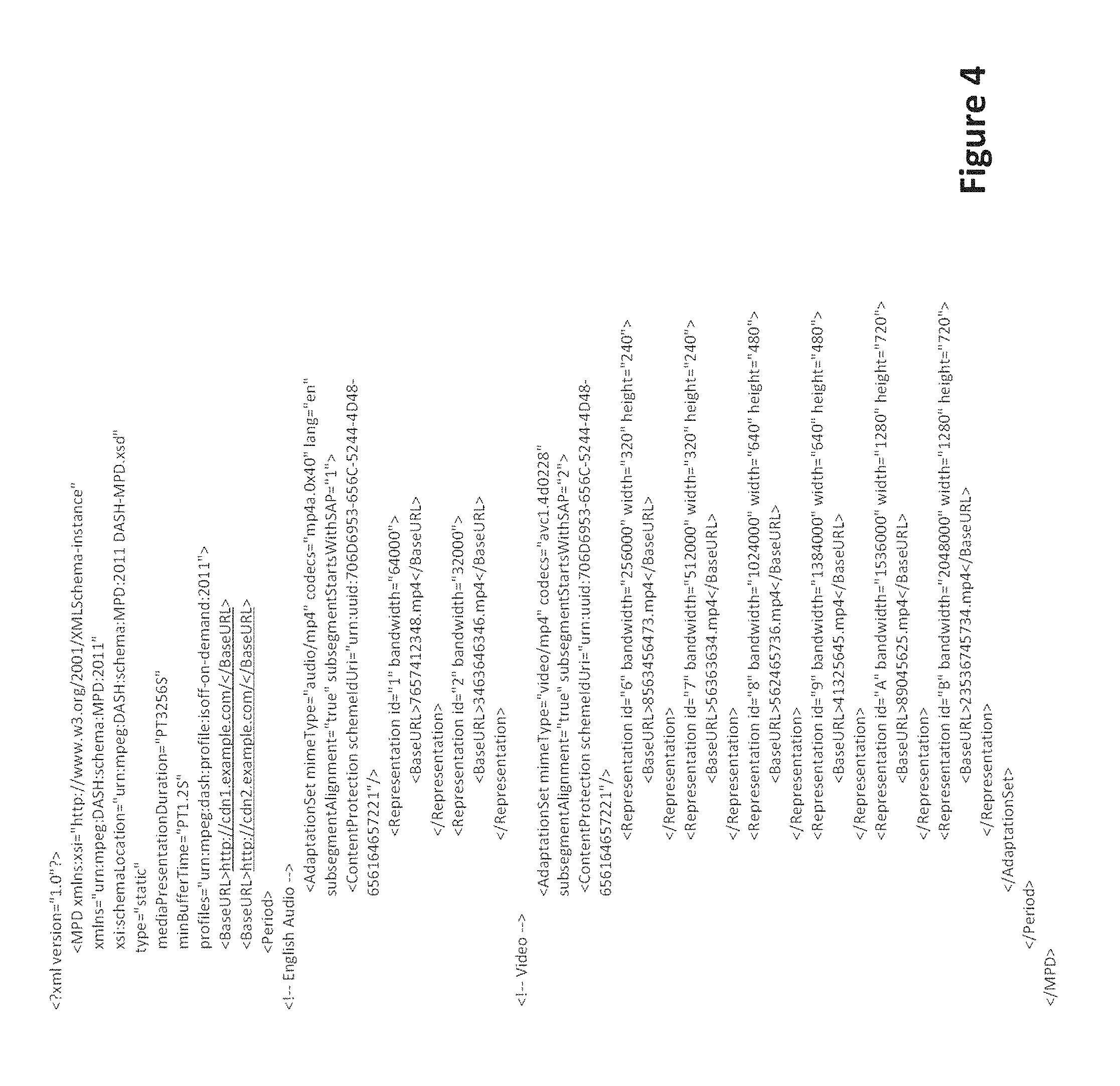 For example, in reference to the In the example illustrated by the video frame 800, the initial video is split into tiles of same size as it is explained below in The “coordinates” would be a value (or a set of values) that could be identified from the optional identifier of the coordinate system (the value “C” in this example). An example of coordinate system could be to define absolute location of the tile in pixels, actually the default case. Coordinates would be the location (x, y) in pixels of the top-left corner of the tile. When no “coordinate_system” attribute is specified, it is assumed that coordinates given in the attribute “value” are expressed into pixel positions, unless a ‘:’ character is present in the value that indicates positions in the tiling grid. Size of the tile would be defined by the standard attributes width and height of the representation. For example, in a code portion referenced 821 in the As explained in reference to When the tiling is regular as in the tiled video frame 860, the other values in the grid attribute provide the number of tile columns minus 1 and the number of tile rows minus 1 (as encoded in the HEVC bitstream). This number of tiles in the horizontal dimension is directly computed from the HEVC bitstream parameter num_tiles_columns_minus1 and the number of tiles in the vertical dimension is directly computed from the HEVC bitstream parameter num_tiles_rows_minus1 (defined in the HEVC Standard), as in the line referenced 862 for the tiled video frame 860. This notation enables to directly translate HEVC Picture Parameter Sets' values in the MPD (num_tiles_columns_minus1 and num_tiles_rows_minus1). In addition to the grid attribute, the sizes of the full-frame video are required to be able to compute the tiles sizes and positions (see the line referenced 862). In case the tiling is not uniform, as represented on the tiled video frames 871 or 873, the grid attribute with first value being equal to 0 implies that the “Role” element must allow retrieving the list of positions for each column and the list of positions for each row, given in pixels. In such case, the number of tile borders defining the rows and columns is contained in the subsequent values of the “grid” attribute. The tiled video frame 872 provides possible names for the attributes to indicate the row and column borders positions (it could be different names however without affecting the invention at both generation and parsing times). Row and column border positions are specified into pixels (see the line 872) with the width and height of the full-frame video. As another embodiment (not represented), for regular tiling, the grid and width and height attributes can be simplified into one single attribute like for example, grid=“w, h, W, H” where w and h respectively provides the size (width and height in pixels) of a tile and W, H the size in pixels of the full-frame video. Applied to the examples 861, 862, this leads to grid=“320, 240, 640, 480”. It has the advantage to makes an easier to parse syntax for DASH clients (one attribute providing all the 4 values instead of three different attributes in 862). Another embodiment for the tiling configuration signalization is to have the tiling information at a highest level of signalization. Thus, it can be described once and used from all the fields “Representation” associated to a tile. This reduces the description cost and the size of the manifest potentially reducing the download time of the manifest and reducing the startup delay of the streaming application. In Any tile representation coming from this tiling configuration can refer to it via the “id” attribute of the tiling “Role” element previously mentioned. The uniform attribute indicates whether the tiling is regular or not, direct translation of the uniform_spacing_flag HEVC flag. When set to 1, the following attributes cols (for columns) and rows indicate the number of tiles columns minus 1 and the number of tiles rows minus 1. In the example referenced 880, there is only one tile row boundary and 1 tile column boundary. The two last attributes provide the dimensions width and height of the full-frame video. When the tiling is not uniform as on the tiled video frame 885, then the “tiling” element contains children elements that provide the positions in pixels of the tiles columns and rows (one element per dimension, as shown in a line 887). In case the tiling configuration changes along time, a new period of time (<Period>) is created. This new period contains the new tiling configuration. In case the manifest describes via the “tiling” element multiple tiling configurations, the tiling applied to a given tile can be referenced via its “id” attribute by adding a new attribute in the Role describing the tile. For example: <Role schemeIdUri=“urn:mpeg:DASH:tiling:2013” Id=‘tiling_1’ value=“0,0”/>. Then, there are two alternatives to inform streaming clients about the tiling configuration. This information is useful, for example to inform the user about the addressable spatial areas in the videos. The approach with attributes duplicates information for each tile. Consequently, it is less compact, but it has the benefit to keep all the tile related information in the same element. This offers robustness in case of transformations applied to the manifest by any intermediate node in content distribution networks. Considering the robustness aspect and self-description of a tile via the “Role” element, it is also interesting to put in the “value” attribute the size information in addition to position information. In this embodiment, the “value” attribute specifies a coma-separated list of four integers, in the following order: the x and y position of the top-left corner and the width and height of a tile. For example: value=“x, y, w, h” as in the Another embodiment proposes to indicate the position