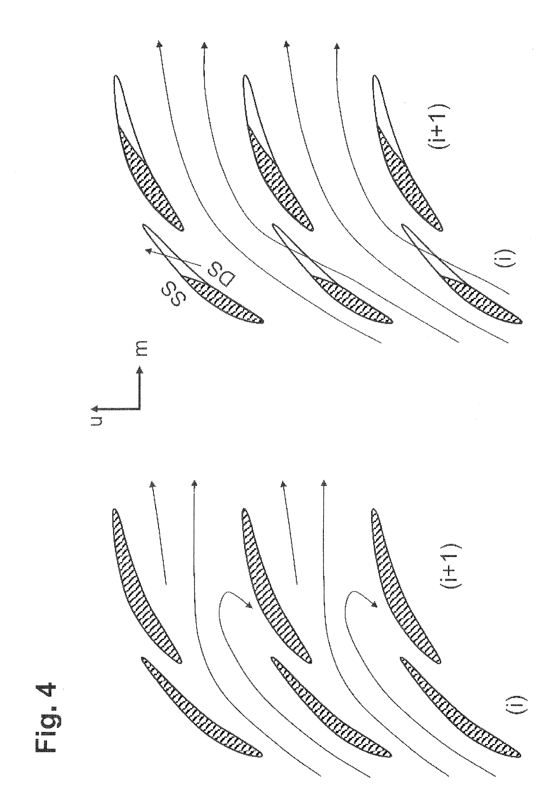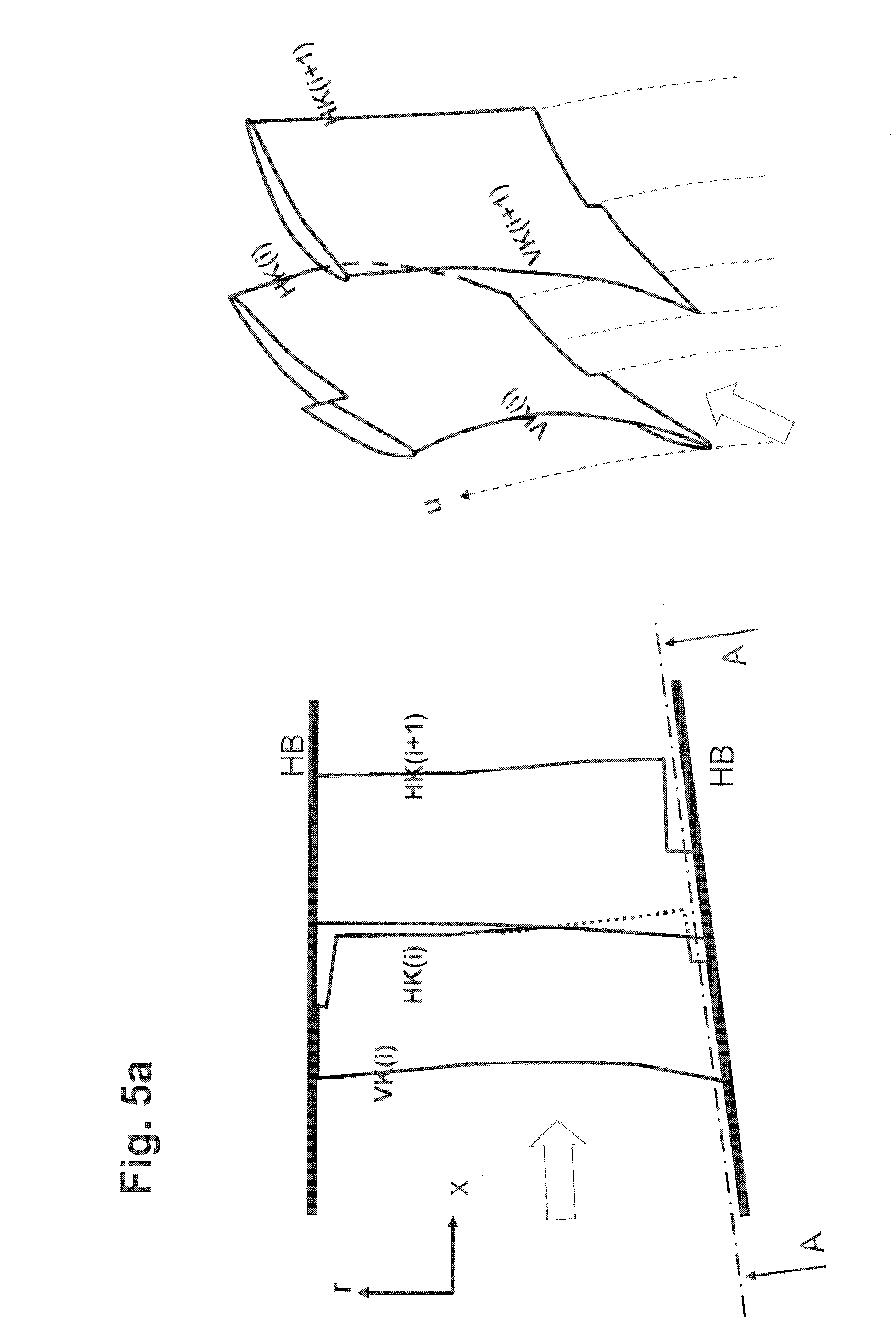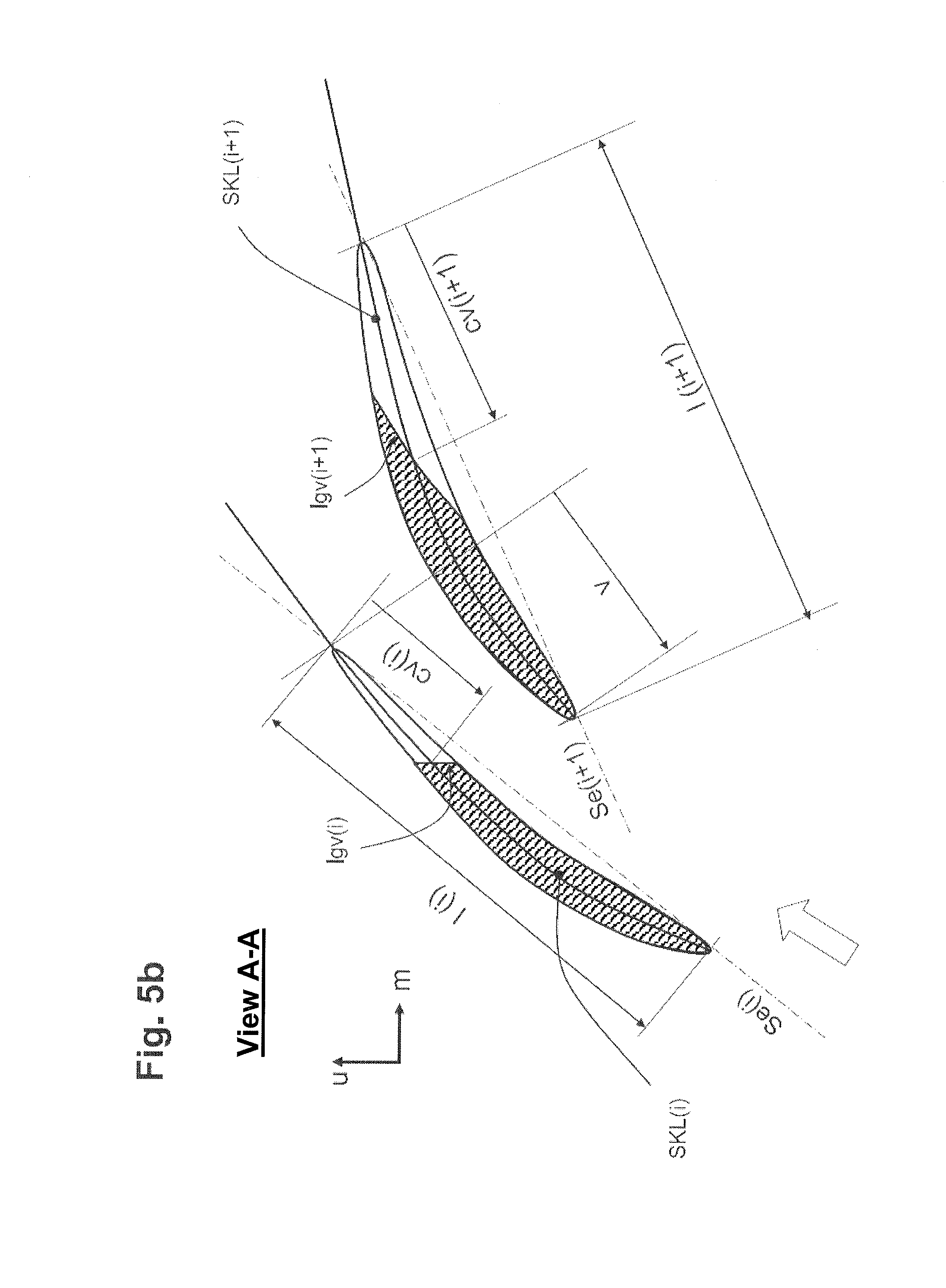 It is favourable in terms of flow when the front limit line is provided inclined relative to the skeleton line, corresponding to an obtuse inclination angle alpha<90° (see also It is advantageous when the limit line lgv(i) or lgv(i+1) on at least one of the member blade rows appertaining to the blade group extends substantially or exactly in the circumferential direction u. It is particularly favourable to provide this solution on the front member blade row (i). The position and form of the limit lines substantially determine the extent of the partial gap and are thus important in accordance with the invention. The depth of indent ch(i) of the front blade profile and the depth of indent ch(i+1) of the rear blade profile are also measured in the direction of the respective profile chord Se(i) or Se(i+1), from the respective trailing edge to the intersection point of the respective skeleton line SKL(i) or SKL(i+1) with the respective limit line lgh(i) or lgh(i+1). It is advantageous when a partial gap positioned in the center area of the profile depth is provided in combination with one of the above values for v′ at the same blade end of the member blade row (i). It is particularly advantageous here when for the depth of indent ch of at least one of the blade profiles the following applies: