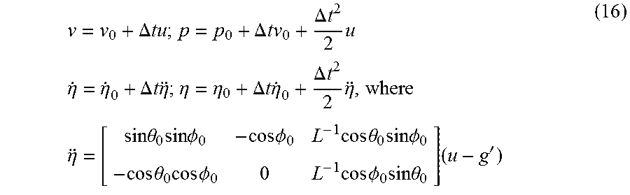 v=v0+Δtu;p=p0+Δtv0+Δt22uη.=η.0+Δtη¨;η=η0+Δtη.0+Δt22η¨,whereη¨=[sinθ0sinϕ0-cosϕ0L-1cosθ0sinϕ0-cosθ0cosϕ00L-1cosϕ0sinθ0](u-g)(16)