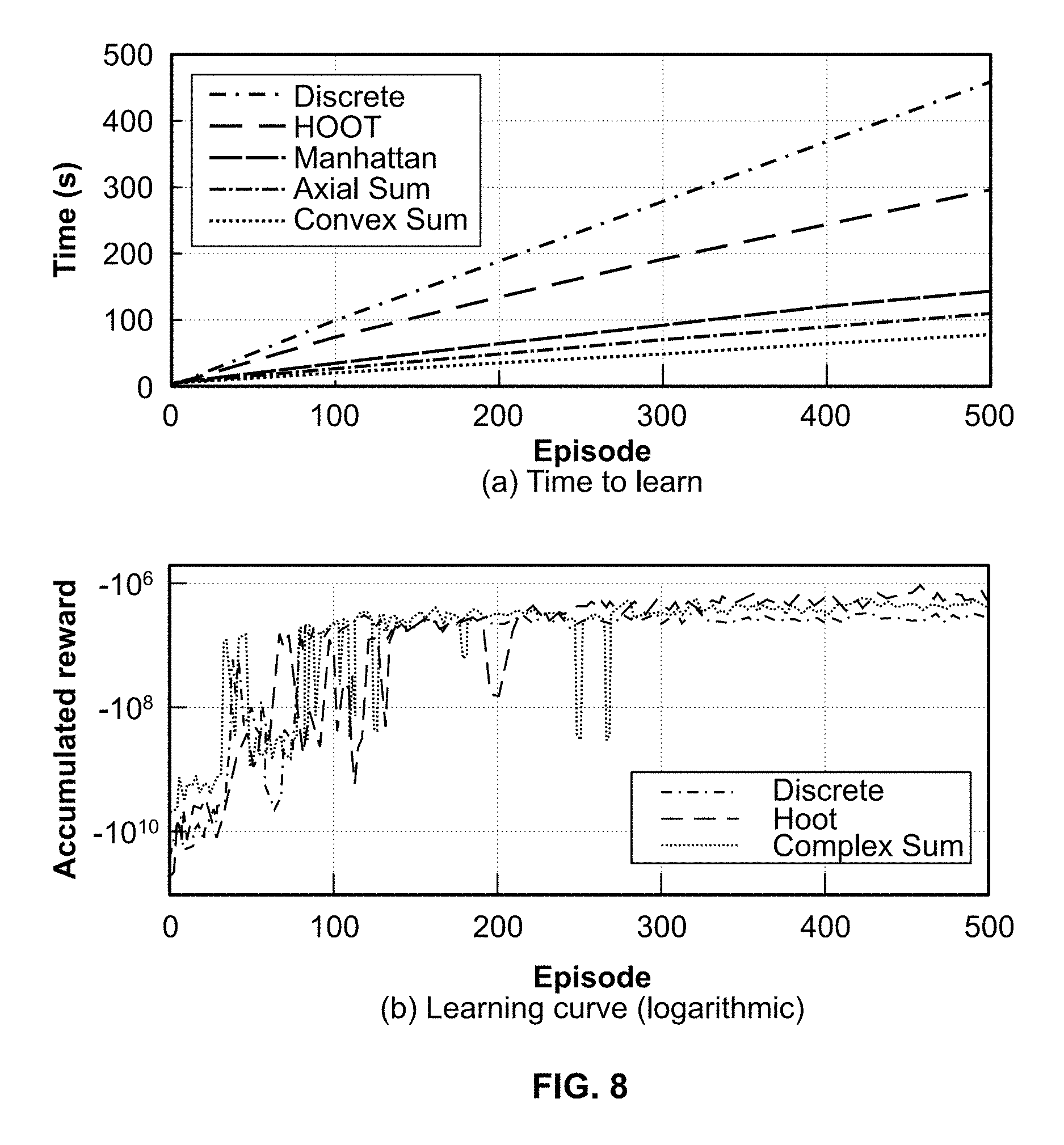 The time-to-learn is presented in FIG. 8a. The axial maximum policies perform an order of magnitude faster than the discrete and HOOT policies. To assess learning with Algorithm 1 using Manhattan, Axial Sum, and Convex Sum policies, we compare to learning using the greedy discrete policy and HOOT. FIG. 8b shows the learning curve, over number of iterations. After 300 iterations all policies converge to a stable value. All converge to the same value, but discrete learning that converges to a lower value.
