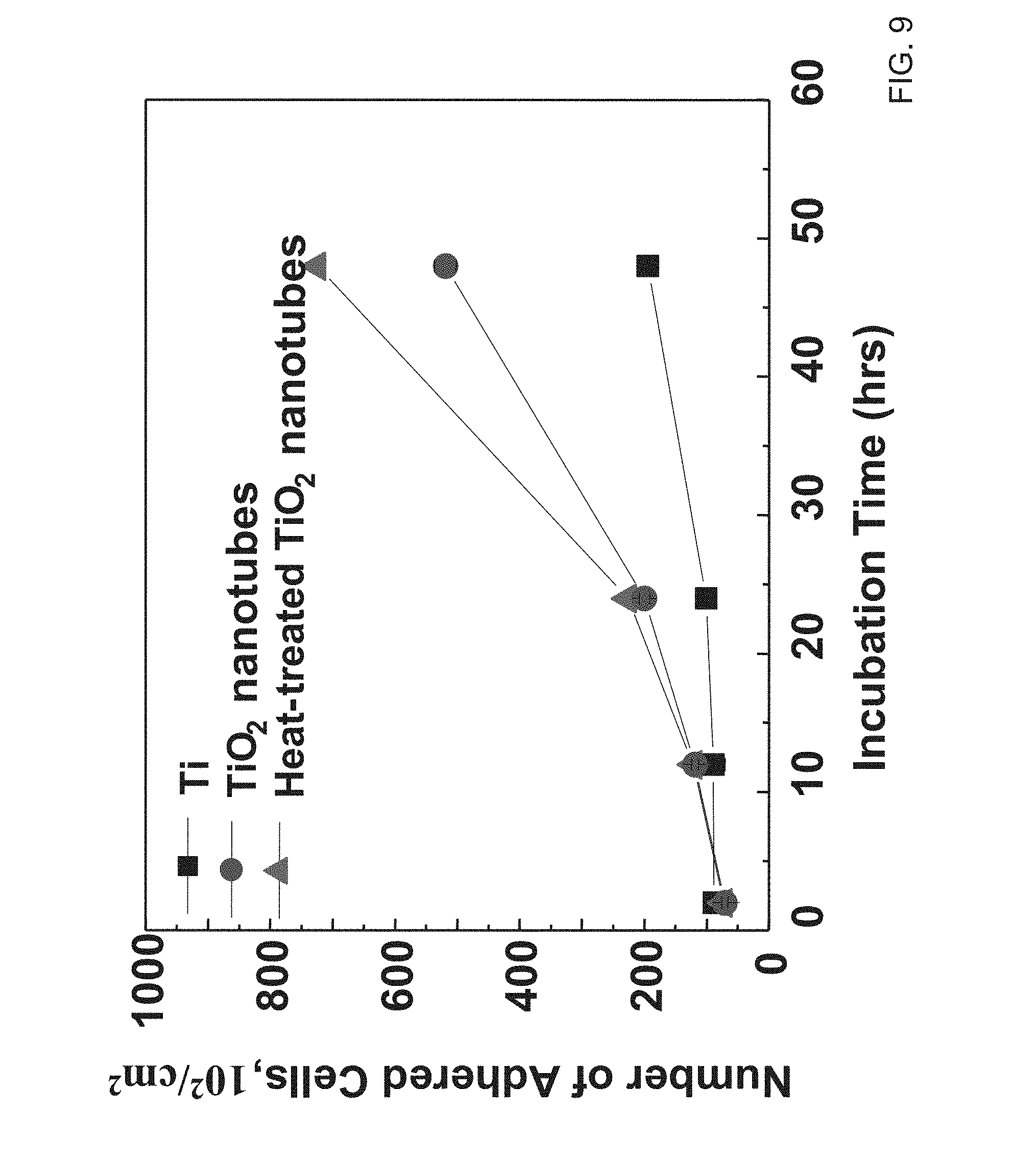 11. The biocompatible vertically aligned nanotube array structure on a biocompatible substrate of claim 1, wherein sodium titanate nanostructures are superimposed onto the titanium oxide nanotube array structure; and hydroxyapatite formation is enhanced upon exposure of the nanotube array structure to simulated or living body fluid.