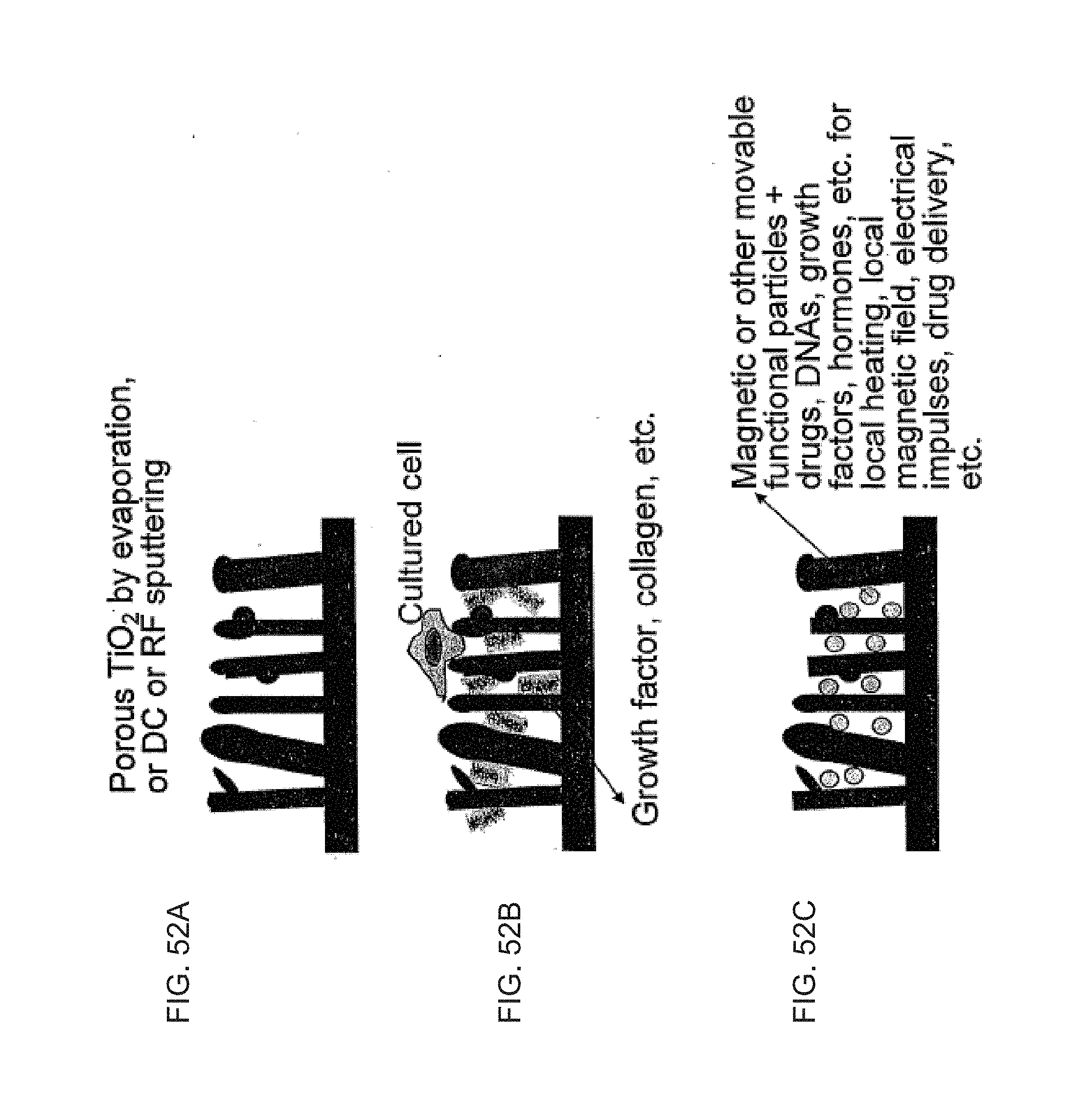 In one aspect, the in vivo or in vitro nutrient fluid is supplied under the growing cells through the gap spacing between the nanotubes in addition to the overall space including the top of the cells. In one aspect, the vertical pores of the nanotubes or nanotubes serve as a reservoir and contain various biologically active agents such as therapeutic drugs, growth factors, proteins, collagens, stem cells, enzymes, hormones, nucleic acids (e.g., RNA, DNA, genes, vectors), antibiotics, antibodies, magnetic nanoparticles, radioisotopes and other materials for slow or externally actuated release.
