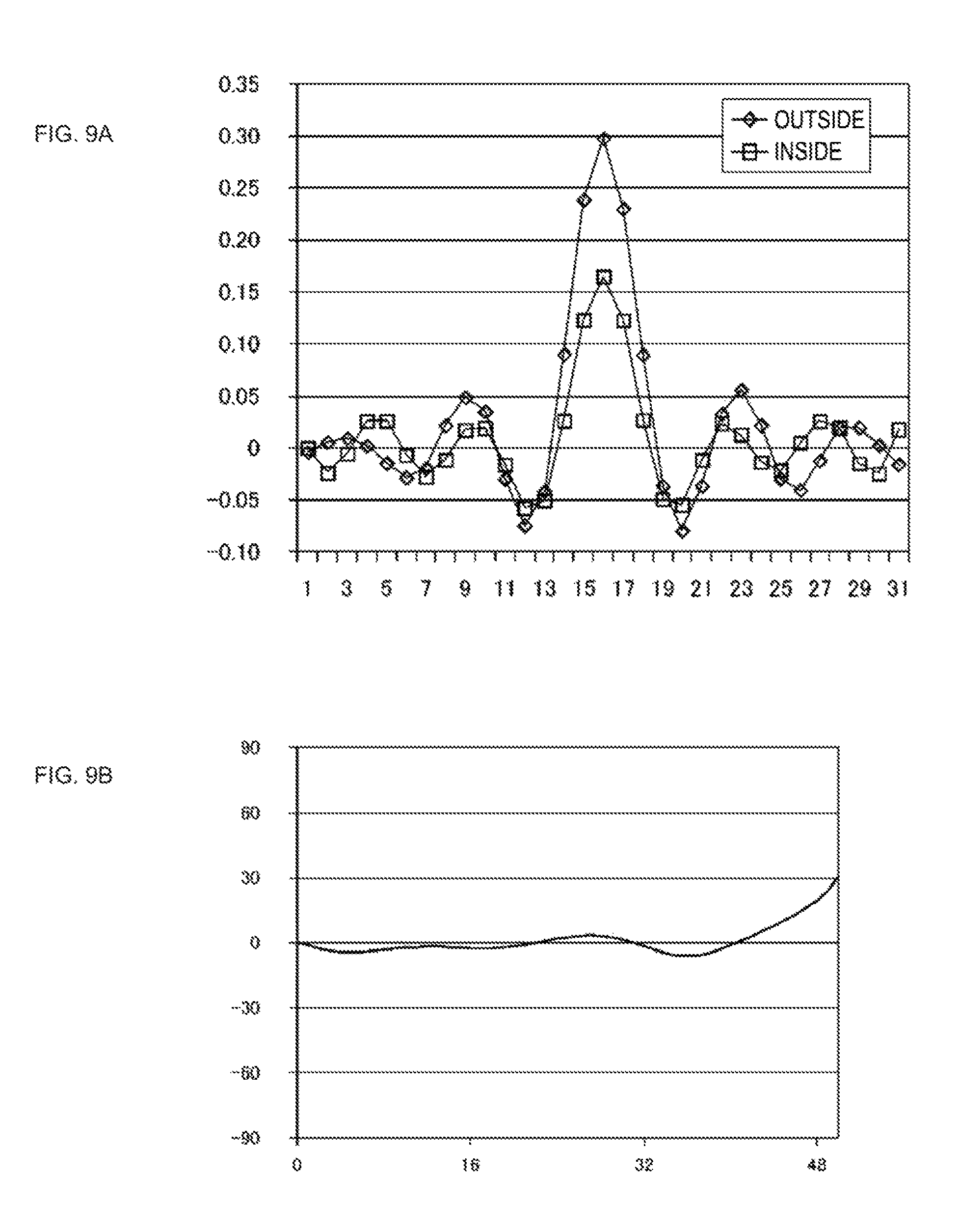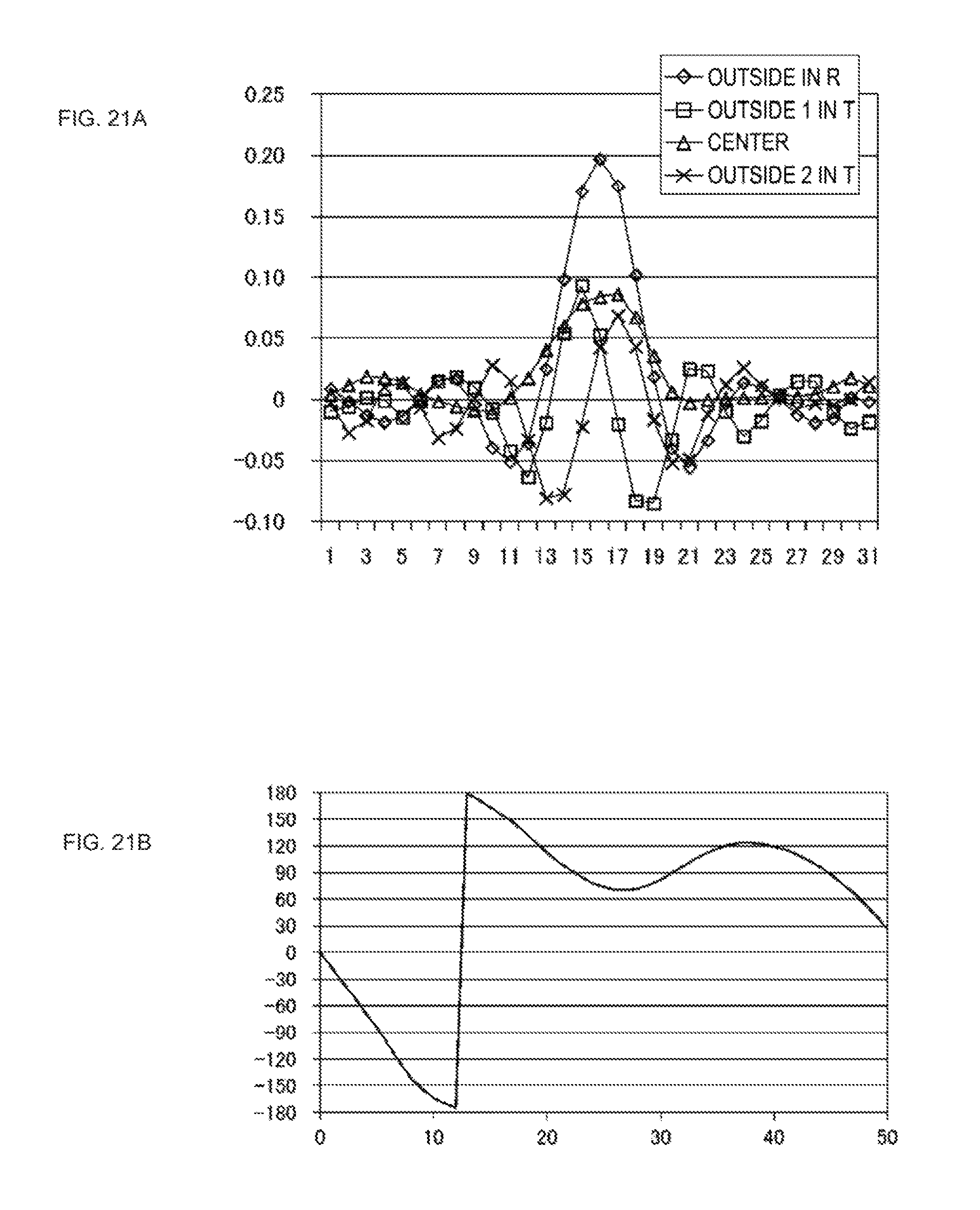 As is clear from those characteristics, in the case where the linear-density is not considerably high, desired characteristics are obtained even in the case where channels whose center positions are different in the tangential direction are not provided. “Electrical Filters Optimal for Pattern IVNS5” Electrical filters optimal for the above pattern IVNS5 will be described. The filter characteristics of IVNS5 at the perturbation origin, which are shown in As is clear from comparison between characteristics in As is clear from comparison between characteristics in As is clear from comparison between “Perturbation/Aberration Detection Using Change in Electrical Filter Characteristics” As described above, in IVNS5, as well as in IVNST6, in a state in which perturbation or aberration exists, the filter characteristics (tap coefficients) of the respective channels are characteristically changed depending on kinds of the perturbation or aberration (see Table 2). The change in filter characteristics (tap coefficients) of the respective channels is different depending on the kind and the magnitude of perturbation, and therefore it is possible to detect what kind of perturbation is generated in the state from the filter characteristics (tap coefficients) and to what degree the perturbation is generated, and it is possible to make adjustment to eliminate a factor in a shift of the filter characteristics (tap coefficients) from the perturbation origin. [Pattern IVSP4] (the Number of Channels is Reduced while Characteristics are being Maintained) It is possible to consider IVSP4 on the basis of IVNS5 in the same way as IVTSP5 considered on the basis of IVNST6. That is, it is possible to reduce the number of channels in accordance with restriction of power consumption, the number of pins, a circuit scale, and the like of the signal processing circuit by using a method of optically or electrically sharing the central region C. In terms of a method of reducing the number of channels, among the five channels of A to E in the pattern IVNS5 (see Description will be made on the basis of simulation results of the above pattern IVSP4. Simulation conditions are as follows as in the case of “low linear density” described above.