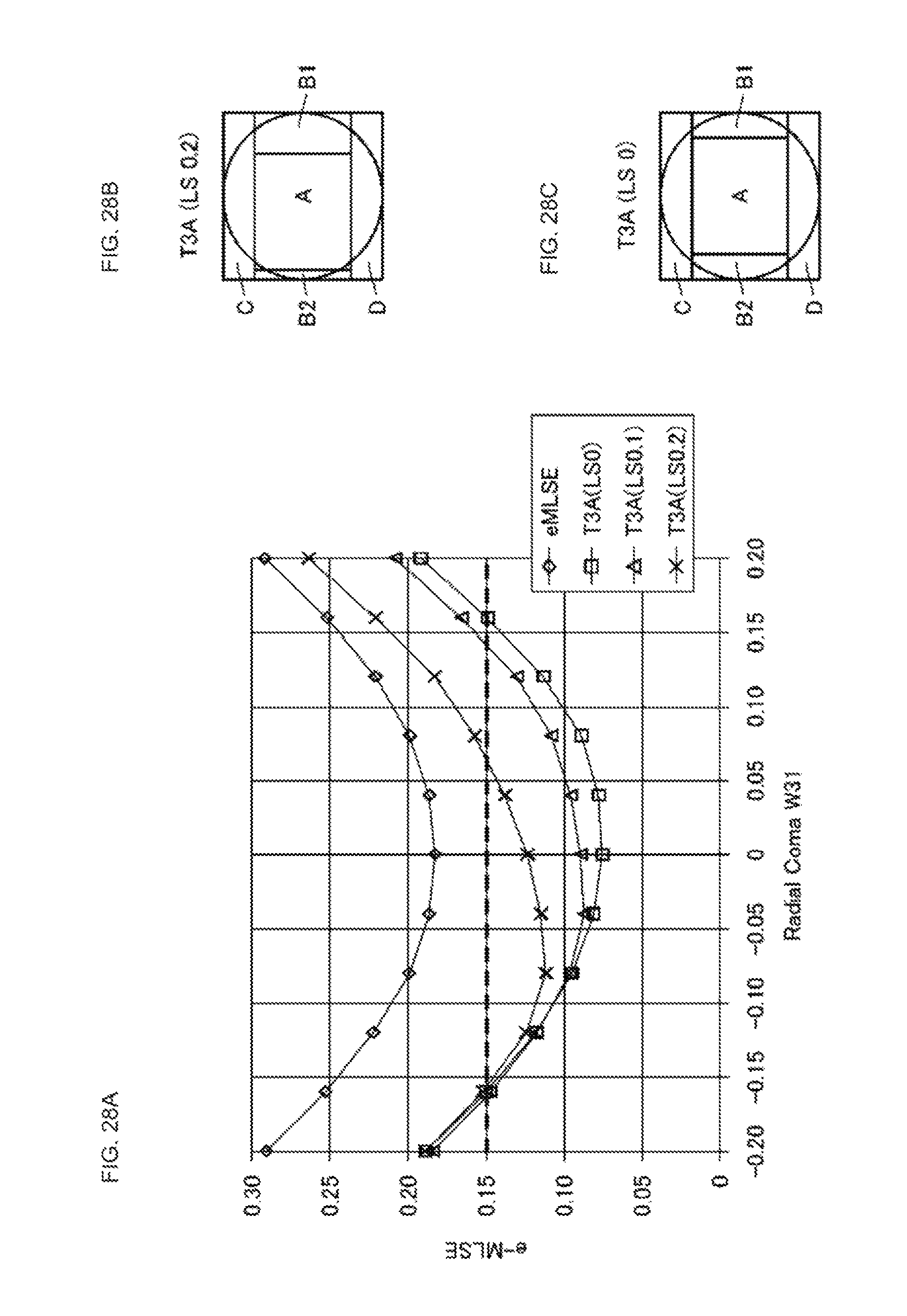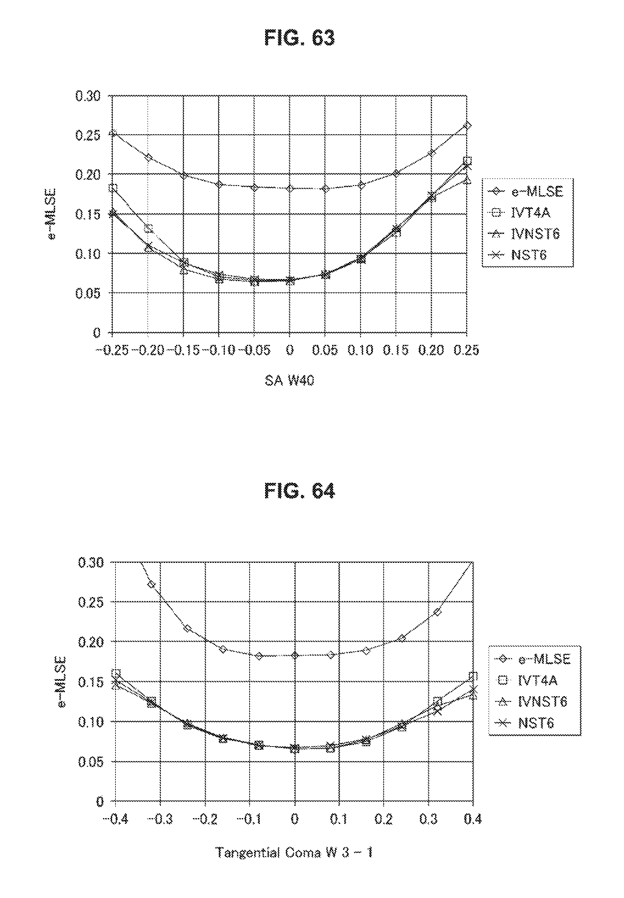 In a graph of (normalized defocus amount vs. index), reproduction performance is higher as a value of the e-MLSE is smaller. As an example, it is preferable that the value of the e-MLSE be substantially 0.15 or less. Therefore, the defocus margin corresponds to a width of a range where the value of the e-MLSE is substantially 0.15 or less. The defocus margin is larger as the width is larger. As is clear from those characteristics, when a ratio (Ks) of signals between regions is changed, it is found that “defocus margin and tangential comatic aberration margin” and “radial comatic aberration margin and spherical aberration margin” have a relationship of trade-off. It is also possible to switch a plurality of Ks and use the Ks depending on a difference in medium or the like. In IVTSP5, a simple ratio of B to C to D is (B:C:D=1:2Ks:1). When considering the above filter characteristics of the pattern IVNST6 as a basis, it is desirable to relatively strengthen C in the radial comatic aberration margin and the spherical aberration margin, and therefore (Ks>0.5) is advantageous to the two margins. As is clear from the graphs of Ks=0.5 and Ks=1.0, the simulation results also show the above point. [Pattern IVTSM4] (the Number of Channels is Reduced while Characteristics are being Maintained) Although various characteristics of IVNST6 are improved as compared with IVT4, the radial comatic aberration margin and the spherical aberration margin can be improved by a way of thinking similar to the way of thinking regarding conversion from IVNST6 to IVTSP5 described above. A pattern IVTSM4 in which the number of channels are reduced from six channels to four channels while characteristics are being maintained will be described. As shown in In terms of a method of reducing the number of channels, among the six channels of A to F in the pattern IVNST6, A, E, and F are maintained as they are, and signals of the channels B, C, and D are set as a single channel of (C+Ksm×B+Ksm×D). A pattern in which the number of channels is reduced as described above is referred to as “pattern IVTSM4”. Description will be made on the basis of simulation results of the above pattern IVTSM4. Simulation conditions are as follows as in the case of “low linear density” described above. In each drawing, e-MLSE shows a characteristic obtained in the case where region division is not performed.