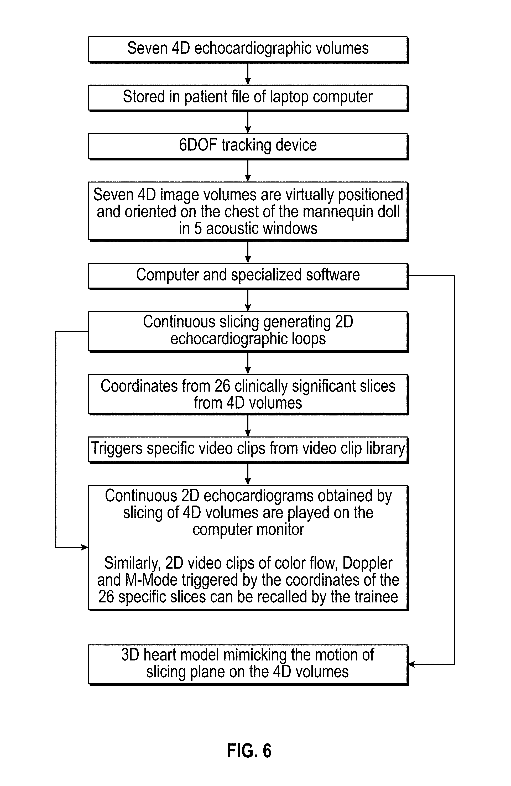 A neonatal echocardiography training apparatus including (i) a computer; (ii) a life-sized doll mannequin; (iii) a magnetic tracking system including (a) a control module connected to the computer; (b) a magnetic pulse wave generator positioned behind the mannequin and connected to the control module; (c) a sensor-fitted transducer configured to detect magnetic pulse waves from the generator and connected to the control module; and wherein the control module reads data from the generator and transducer and transmits the data to the computer. A method of displaying continuous video clips obtained from slicing of multiple 4D echocardiographic image volumes and 2D video clips activated from the coordinates of specific slices of 4D volumes is described. These echocardiographic images are displayed when a trainee positions the transducer on the desired cardiac acoustic window on the mannequin.