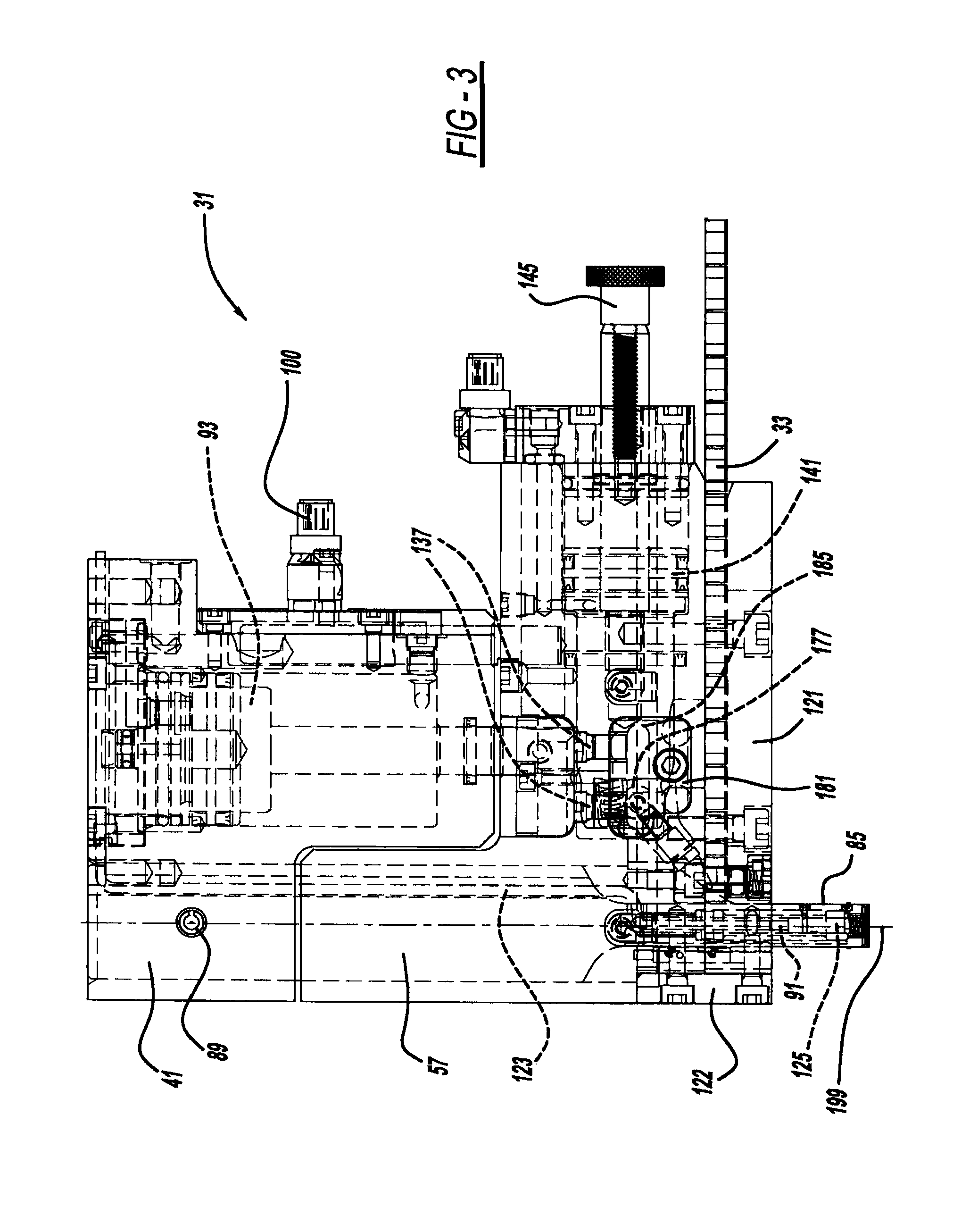 A detent mechanism 371 can best be observed in FIG. 29. Detent mechanism 371 includes a detent member 373 having a middle post upon which is located a laterally expanded ledge and an upper wedge surface 375 having a tapered angle offset from a nut feeding direction. A compression spring 376 or belleville washer serves to upwardly bias detent member 373 away from a screw-in or snap-in cap 377 retaining mechanism 371 to body 309. In operation, advanced feeding of the string of connected nuts 357 toward punch assembly 351 causes tilted deflection and linear retraction of detent member 373 toward cap 377. When the central hole of nut 357 overlies detent member 373, however, detent member 373 will fully advance such that a leading surface 379 thereof will abut against an inner edge defining the nut hole to deter undesired rearward and retracted movement of the nut string. This action serves to temporarily hold the nuts when a pawl ratchets back to a subsequent nut as will be further discussed hereinafter. A release finger 381 downwardly extends through an aperture in cap 377 to allow manual tilting and disengagement of detent member 373 if manual retraction of the nut string is desired.