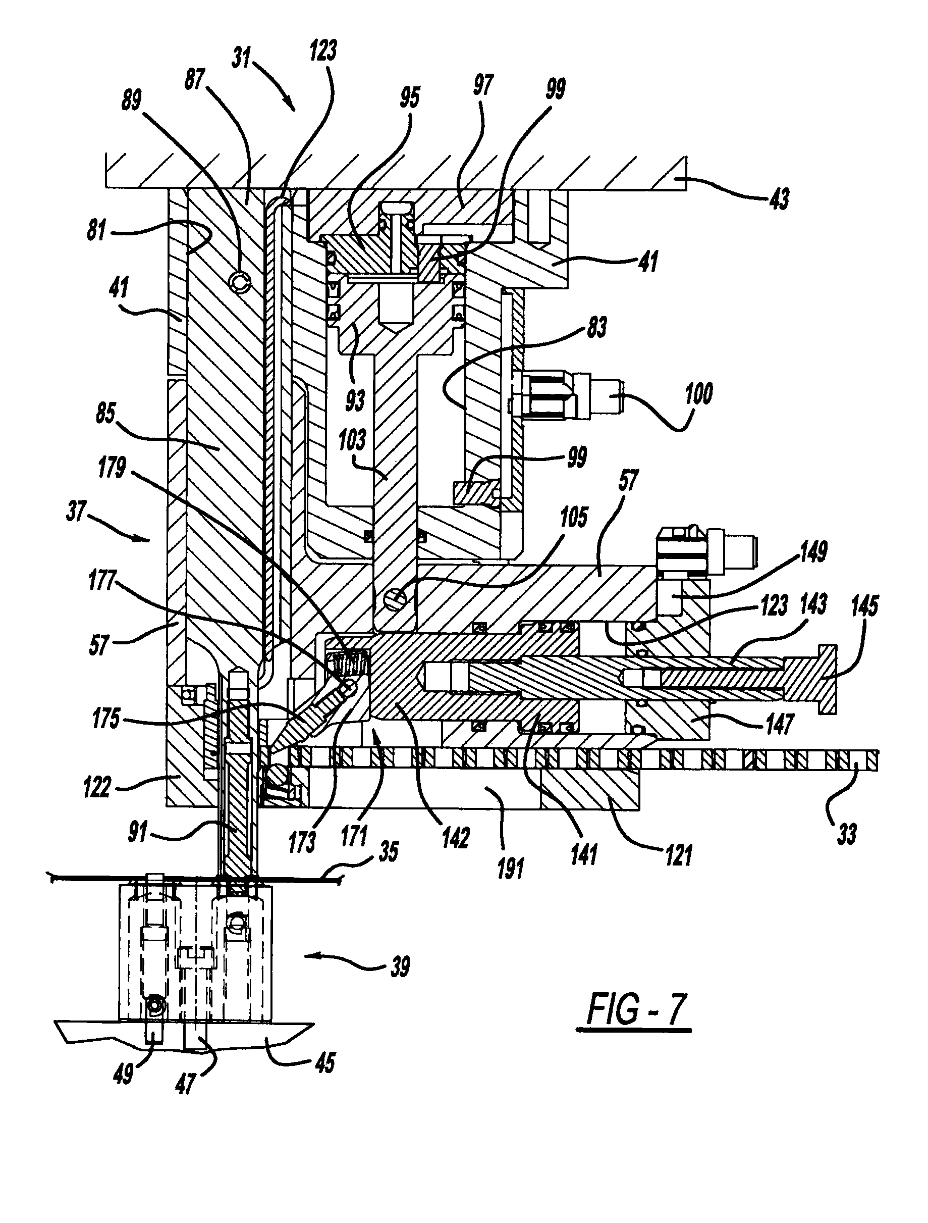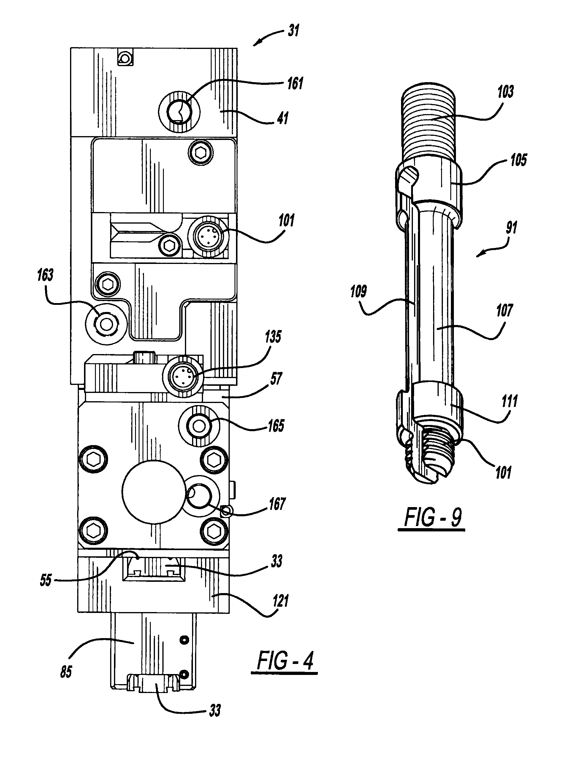 Referring to FIGS. 2 and 7, base 41 includes a longitudinally elongated bore 81 and a piston chamber 83. A punch assembly 85 is located in bore 81. Punch assembly 85 includes a longitudinally elongated punch 87, fixed to base 41 by a roll pin 89, and a plunger 91, threadably secured within a hollow shaft of the punch. Furthermore, an automatically driven piston actuator 93 is moveably located within chamber 83. U-cup seals surround piston, and an end cap 95 and end plate 97 are secured to base 41 over the piston chamber. A pair of proximity sensors 99 are also positioned in piston chamber 83 to sense end of stroke positioning of piston 93; a connector and switch pack 100 provides electrical signal access to sensors 99. A piston rod 103 extends from piston 93. A pin 105 connects an end of rod 103 to a central section of body 57.