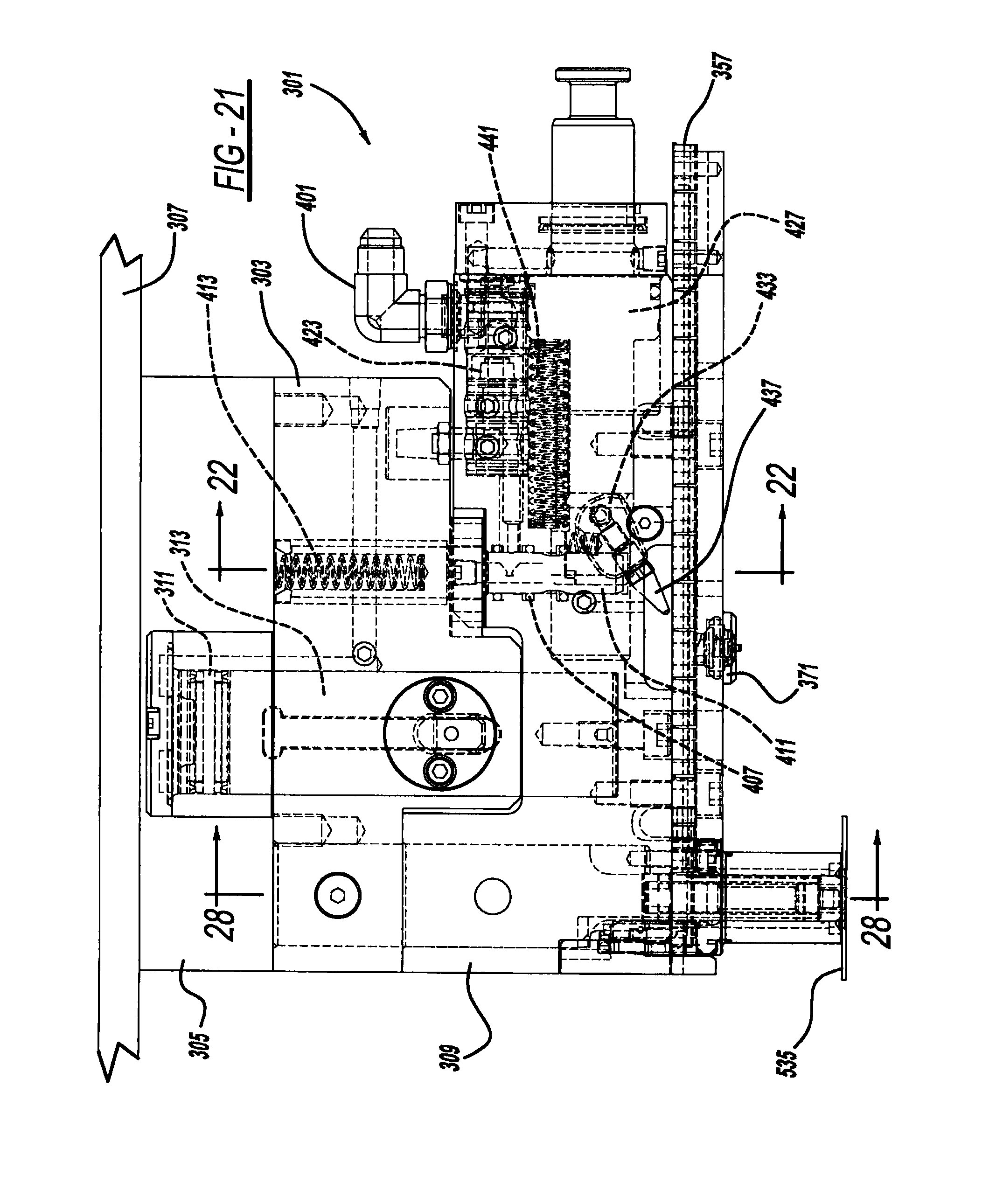 FIGS. 23, 25 and 26 illustrate body 309 moved to an intermediate position approximately 5.5 mm above the fully open position by advancement of piston head 311 and rod 313. In this condition, an annular groove 409 of spool 411 provides open airflow access spanning around a central O-ring seal 407 in body 309. This allows air to flow from passageway 405 to lateral passageway 421, and then to a second lateral passageway 422. Accordingly, the air is transmitted to an internal control valve 423 mounted within and moving with body 309. Valve 423 is preferably a cartridge insert, three way, air-pilot valve which can be obtained from Humphrey Products, Co. of Kalamazoo, Mich. The air-pilot valve uses the initial air pressure passing through groove 409 of spool 411 to shift a gate of the valve to an open and actuated condition in a very fast manner with a relatively small amount of pilot air flow pressure. This allows the full inlet air pressure through fitting 401 to be directed onto a rear face 425 of nut feeding piston head 427 via internal body passageways 422 and 424 (see FIG. 24). Thus, approximately 80 psi of air pressure enters a piston cavity 461, overcomes spring 441 and moves piston head 427 from the retracted position, shown in FIGS. 21 and 29, to the advanced position shown in FIG. 24.