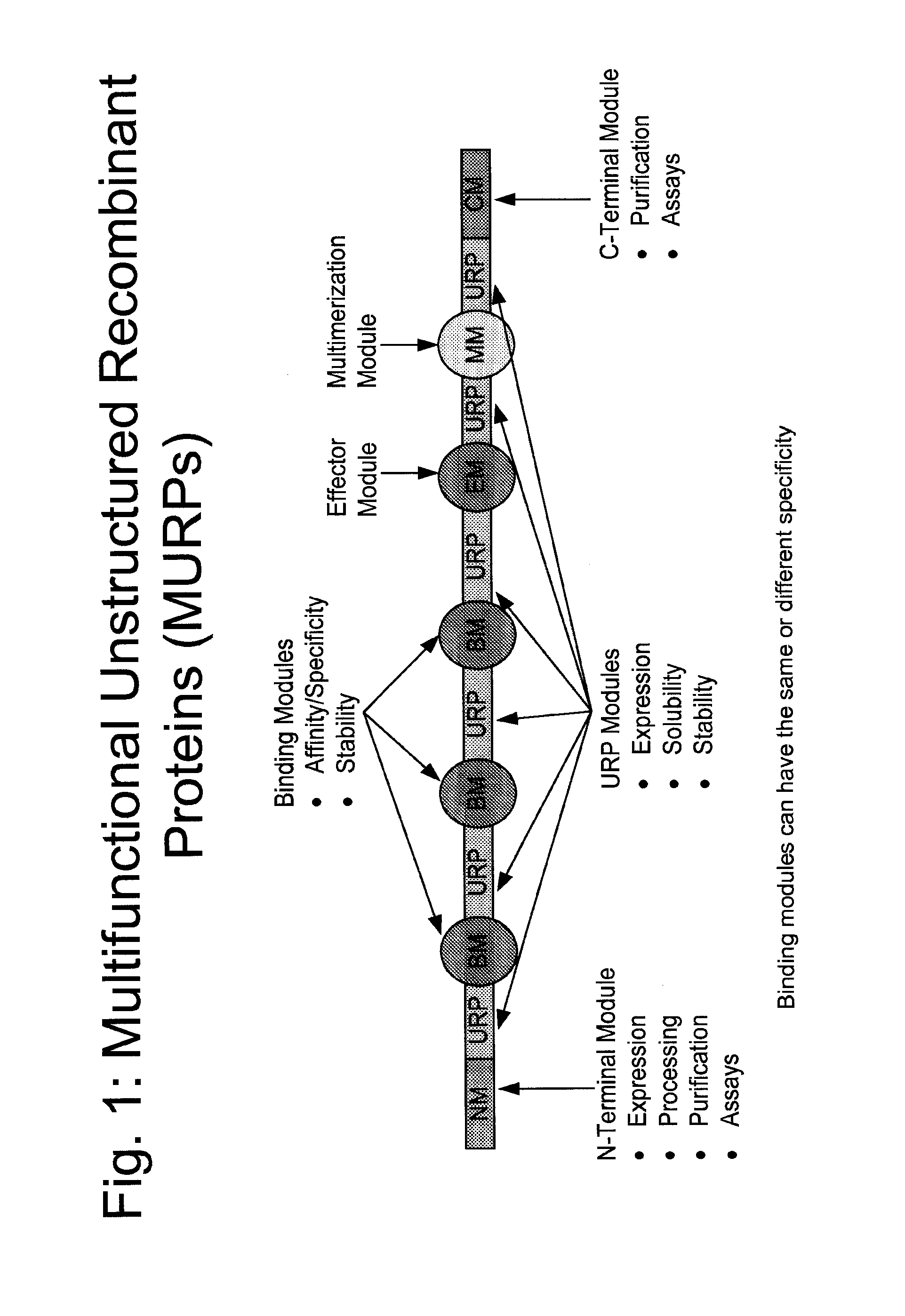 1. An unstructured recombinant polymer (URPs), wherein the URP comprising at least about 200 contiguous amino acids, and wherein