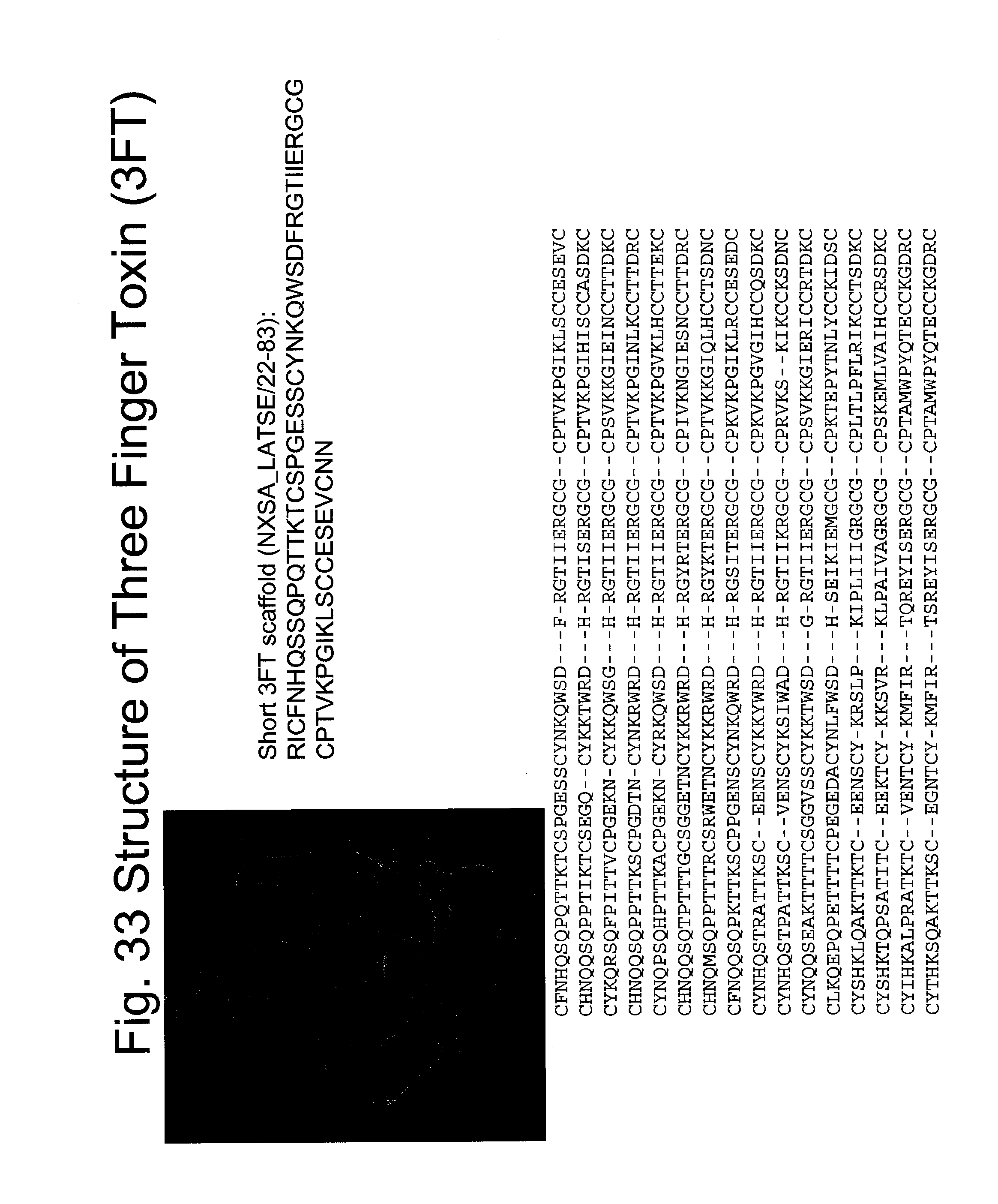 Two 3FT scaffolds were used as a template for 3FT library generation (fingers 1 and 2 configuration). The structure of a 3FT scaffold and a multiple sequence alignment of related sequences is shown in FIG. 33. A library was designed such that two surface loops of the toxin are randomized as illustrated in FIG. 34. The library of partially randomized 3FT scaffold was generated by overlapping four library-encoding oligos at the annealing regions and using pull-thru PCR followed by restriction cloning (SfiI/BstXI) into phagemid vector pMP003. The resulting 3FT library was designated LMP041.