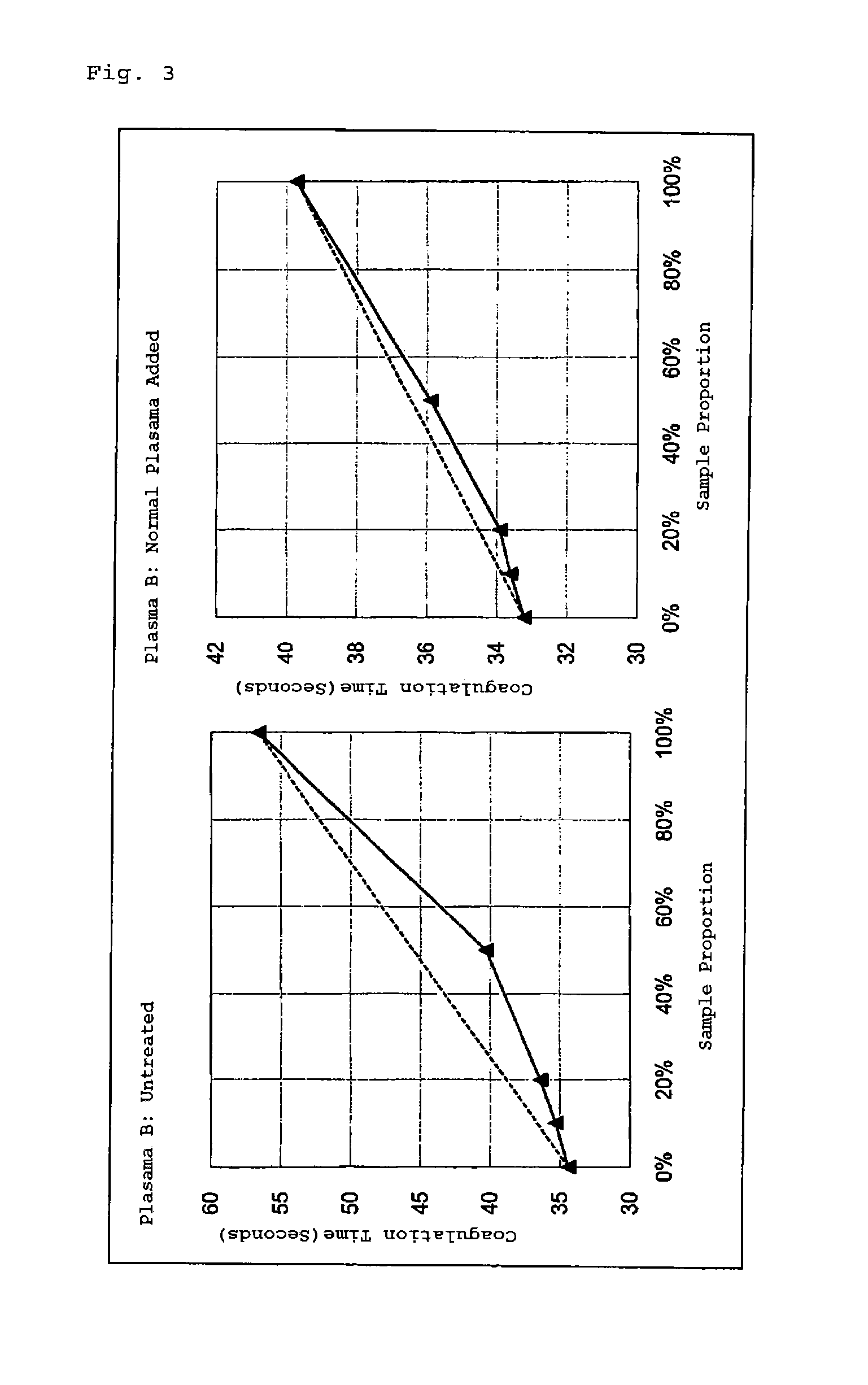 The present application is a 35 U.S.C. § 371 national stage patent application of International patent application PCT/JP2012/065434, filed on Jun. 15, 2012, published as WO/2012/173260 on Dec. 20, 2012, the text of which is incorporated by reference, and claims the benefit of the filing date of Japanese application no. 2011-135174, filed on Jun. 20, 2011, the text of which is also incorporated by reference. The present invention relates to a method of measuring the blood coagulation time of a blood sample to be tested for the purpose of detecting lupus anticoagulant. Measurement of the blood coagulation time is carried out for the screening of the presence or absence of any abnormality in the blood coagulation system, or for the measurement of the activity of individual blood coagulation factors, by measuring the time period starting from the time point at which a reagent for blood coagulation time measurement including an activating agent for blood coagulation factors (hereinafter, may be simply referred to as activating agent) and/or Ca2+ and the like is added to a specimen blood or a specimen blood mixture, to the time point at which detectable fibrin clots are formed (blood coagulation time; hereinafter, may also be simply referred to as coagulation time. Also, formation of fibrin clots may also be simply referred to as coagulation). Typical examples of blood coagulation tests include prothrombin time (PT), activated partial thromboplastin time (APTT), and thrombin time. Hereinafter, in the present specification, blood coagulation factors may be simply referred to as coagulation factors. PT is the time taken from the addition of a mixed liquid of tissue thromboplastin and Ca2+ to a test plasma, to the occurrence of coagulation, and this is intended to comprehensively examine the coagulation activities of factor VII, factor X, factor V, prothrombin, fibrinogen, and the like that are associated with the extrinsic pathway of coagulation. Furthermore, APTT is the time taken from the addition of a sufficient amount of phospholipids and an activating agent (kaolin, anhydrous silicic acid, ellagic acid, or the like) and an appropriate amount of Ca2+ to a test plasma, to the occurrence of coagulation, and this is intended to comprehensively examine the coagulation activity of factor XII, factor XI, prekallikrein, high molecular weight kininogen, factor IX, factor VIII, factor X, factor V, prothrombin, fibrinogen and the like, which are associated with the intrinsic pathway of coagulation. In general, what is referred to as abnormality in these blood coagulation tests refers to the prolongation of the coagulation time. Abnormality in the blood coagulation system reflects the signs or results of the tendency to hemorrhage or the tendency to thrombosis (tendency to blood coagulation) in the body. Regarding the causes for the prolongation of the coagulation time, the following can be considered: 1) deficiency or a decrease in blood coagulation factors, 2) the presence of an antibody to a blood component that constitutes the blood coagulation system, 3) the presence of an antibody to a component in the reagent for blood coagulation time measurement, 4) the presence of an antibody to a complex of a blood component that constitutes the blood coagulation system and a component in the reagent for blood coagulation time measurement, and 5) administration of a drug that inhibits the blood coagulation reaction. However, simply performing the measurement of the blood coagulation time does not enable discriminating whether the cause of the prolongation of the coagulation time is, for example, a decrease in the blood coagulation activity due to simple deficiency of coagulation factors, or a decrease in the blood coagulation activity due to inhibition of the coagulation reaction by an antibody (inhibitor) to a component that constitutes the blood coagulation system or a component in the reagent for blood coagulation time measurement. On the other hand, since the therapeutic policy varies with the difference in the relevant cause of prolongation, discrimination of the cause of prolongation is important. Thus, there has been a blood coagulation correction test (hereinafter, also may be referred to as “blending test” or “mixing test”) in which for the purpose of determination of the cause of prolongation, normal plasma is added to a test plasma, and the extent to which the blood coagulation time of the test plasma is corrected (normalized) is plotted into a graph to determine the cause (Non-Patent Document 1). Conventionally, the mixing test has been carried out, for example, in the manner described below. Samples are prepared by adding and mixing normal plasma to a test plasma such that the mixing proportions of the normal plasma are 0%, 20%, 50%, 80% and 100%, and the APTT is measured. The results are plotted into a graph (horizontal axis: proportion of normal plasma incorporated or the proportion (%) of the test plasma, vertical axis: coagulation time (seconds)), and the cause of prolongation of the coagulation time is visually discriminated and determined from the shape of the graph. For example, when the test plasma is coagulation factor-deficient, the addition of a small amount of normal plasma (20% in When a coagulation factor inhibitor is present in a test plasma, the relevant coagulation factor inhibitor inactivates coagulation factors in the added normal plasma, even though the proportion of addition of normal plasma is increased. Therefore, the extent of improvement in the coagulation time due to the addition of normal plasma is low, and a curve that is convex upward is shown ( As a coagulation factor inhibitor which affects the sensitivity of the reagent for blood coagulation time measurement, lupus anticoagulant (hereinafter, LA) is known. LA is defined as an immunoglobulin which inhibits a phospholipid-dependent coagulation reaction in vitro without inhibiting the activity of individual