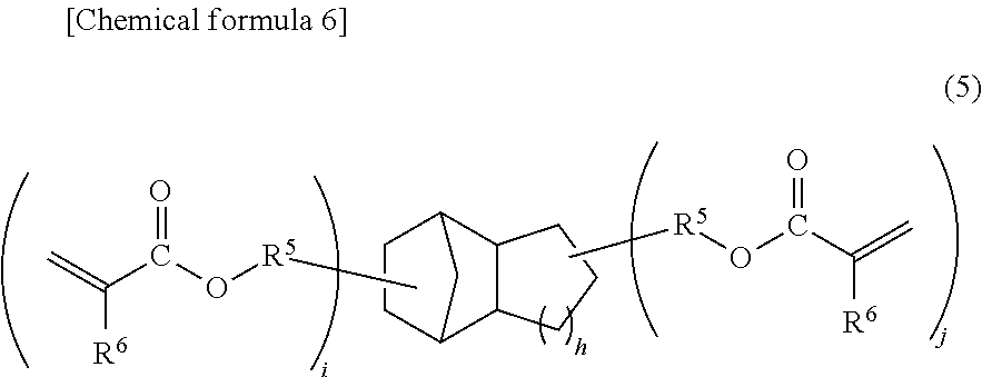 [in general formula (5), R5is single bond, a chain aliphatic group containing 1 to 10 carbon atoms and 1 to 3 oxygen atoms, or a cyclic aliphatic hydrocarbon group containing 3 to 16 carbon atoms, the plurality of R5being independently the same or different; R6represents hydrogen or methyl group, the plurality of R6being independently the same or different, h is an integer of 0 to 3, i and j are an integer of 0 to 2, i+j being 1 to 2].
